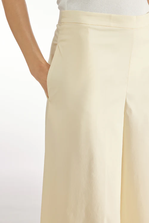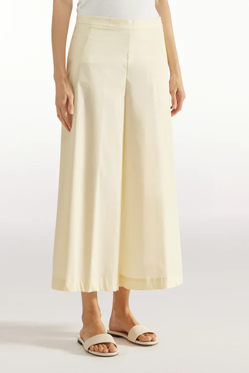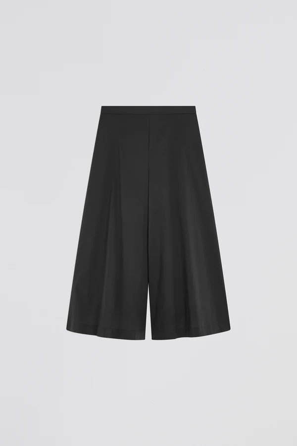 Pantalone crop in popeline stretch Svasati al fondo Fascione in vita davanti Elastico cannettato a vista dietro Chiusura zip al fianco sinistro Tasche inserite lungo i fianchi Vestibilitร Over Composizione: 68% Cotone 28% Poliammide 4% Elastan Made in Italy
