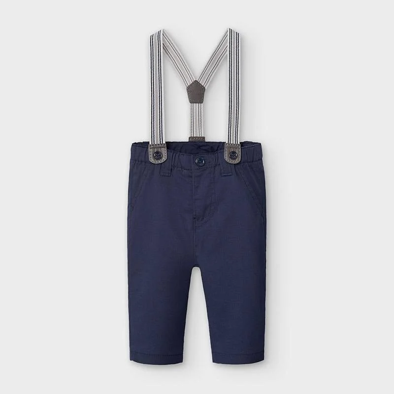 Pantalone neonato blu con bretelle, realizzato in tessuto di cotone ed elastico regolabile in vita.