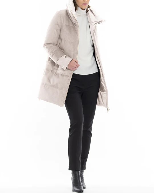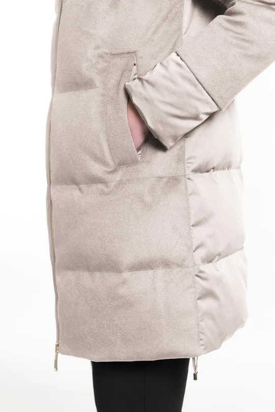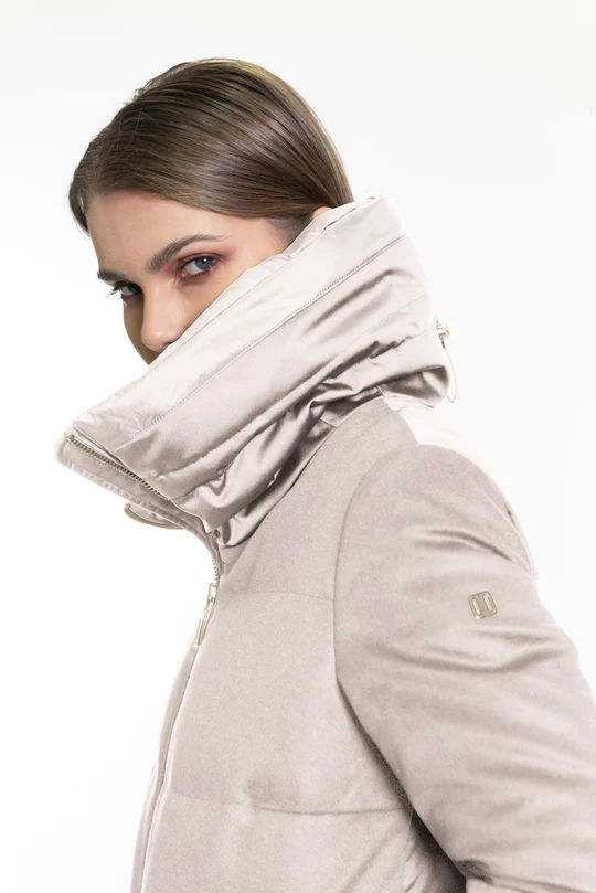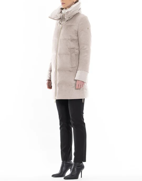 Combinazione di lana e raso tecnico; la componente di rayon nella lana ne esalta la lucentezza e la morbidezza e lโaccoppiatura con una maglina tecnica conferisce resistenza allโacqua, corpositร e consistenza. Il tessuto tecnico water-resistant e comfort stretch ha una struttura a raso con effetto serico. Lโimbottitura in piuma garantisce un elevato comfort termico e protezione dagli agenti atmosferici.