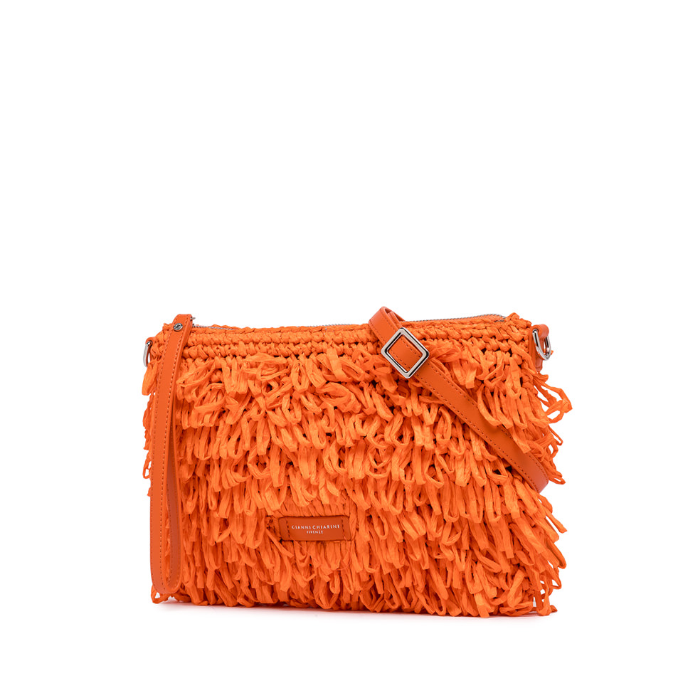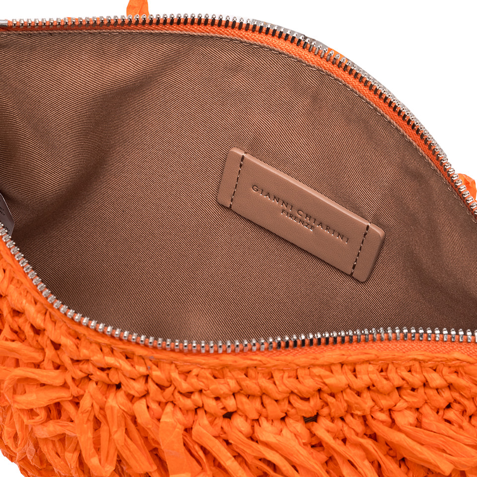 La Pochette Marcella Rafia GIANNI CHIARINI, รจ frizzante e leggera, un accessorio super chic ma al contempo casual. Vestita da un tessuto materico, formato da tanti riccioli di rafia, intrecciati a mano all’uncinetto. Subito must-have di stagione, indispensabile per connotare di stile i look estivi.