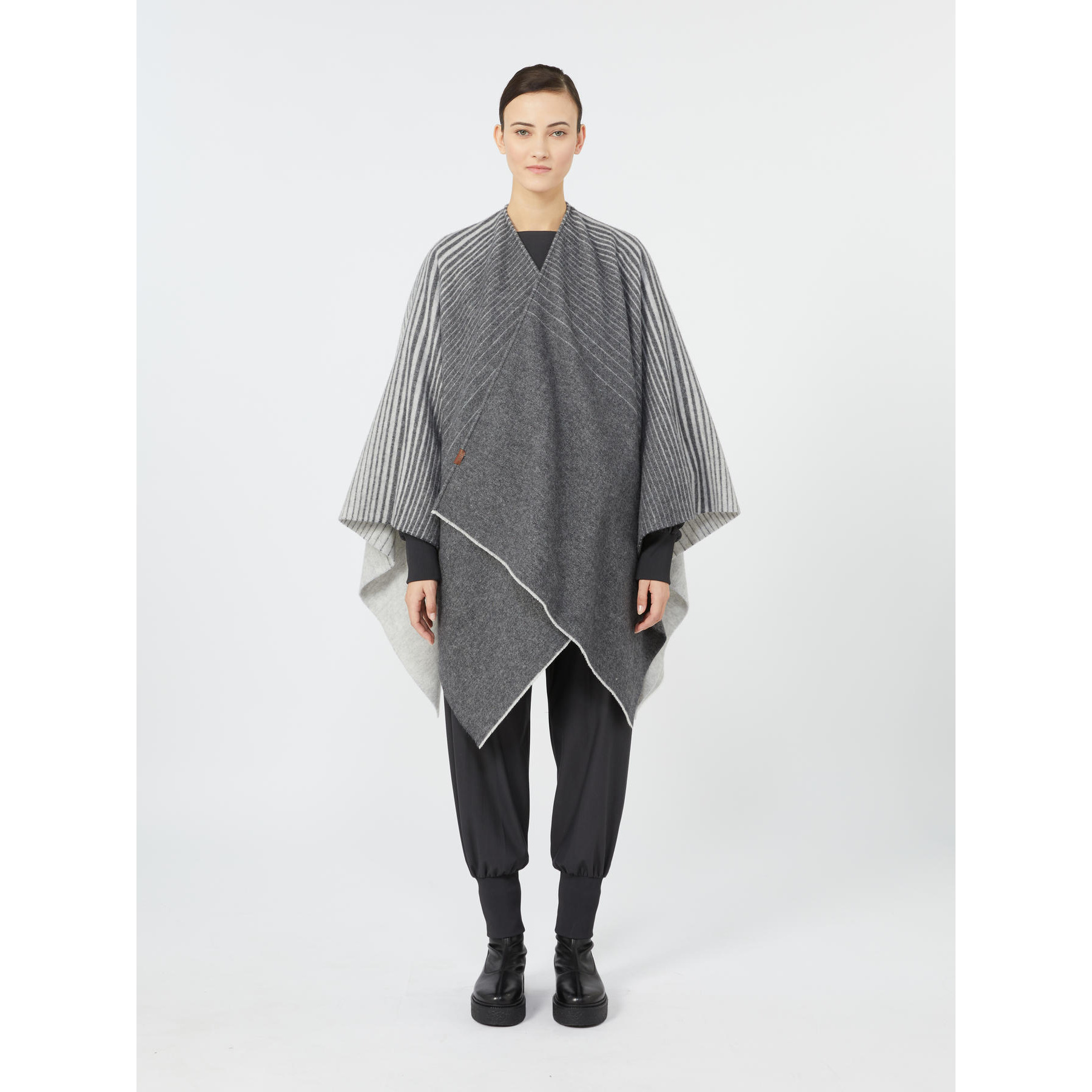 Poncho Brenta dal volume ampio ed avvolgente Filato misto lana bicolor Motivo jacquard a righe dรฉgradรฉ Label logata in pelle applicata a mano Dimensioni 151 x 149 cm Composizione: 80% Lana, 20% Poliammide