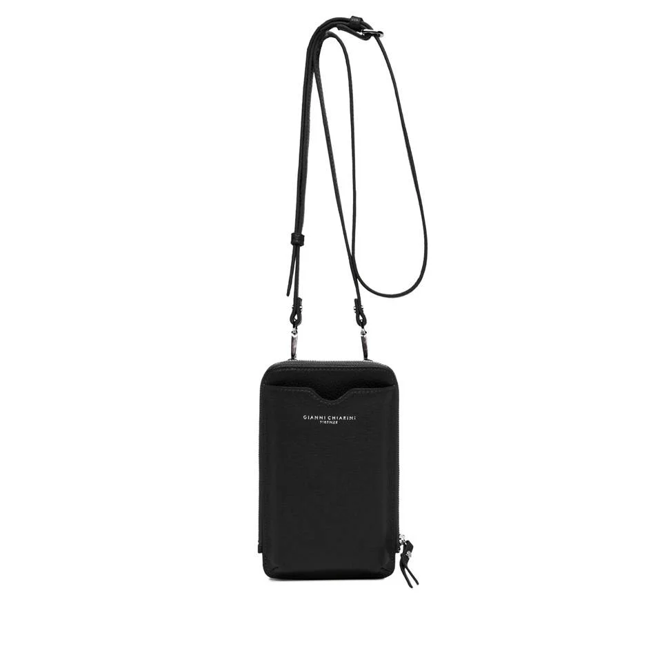 Il porta cellulare a tracolla con porta carte Gianni Chiarini รจ in pelle martellata con inserti e tasche piatte multiuso di cui una con zip. La zip si trova su tre lati. La tracolla รจ regolabile e removibile. La tasca con scritta logo sul davanti e ci sono anche tre tasche sul retro