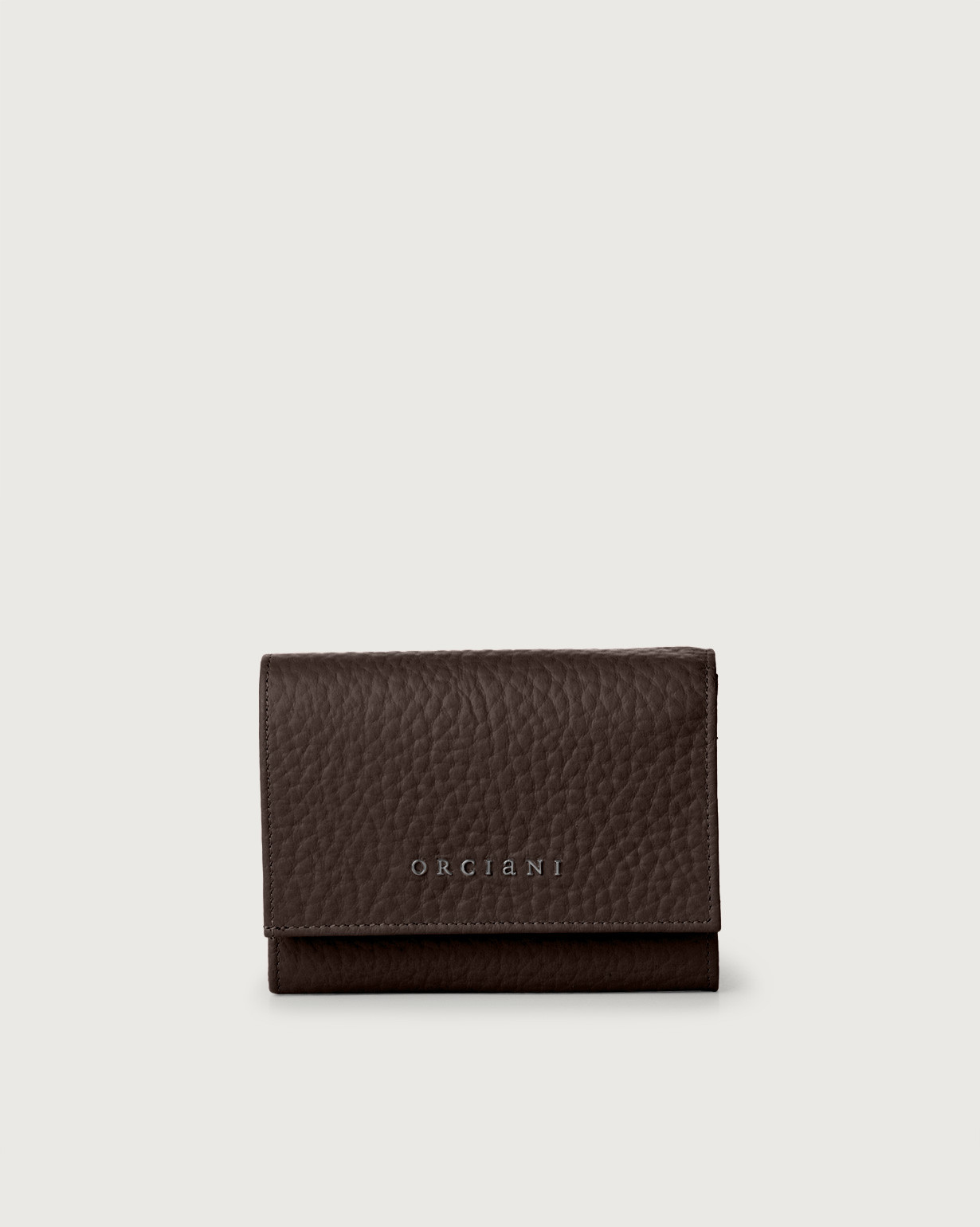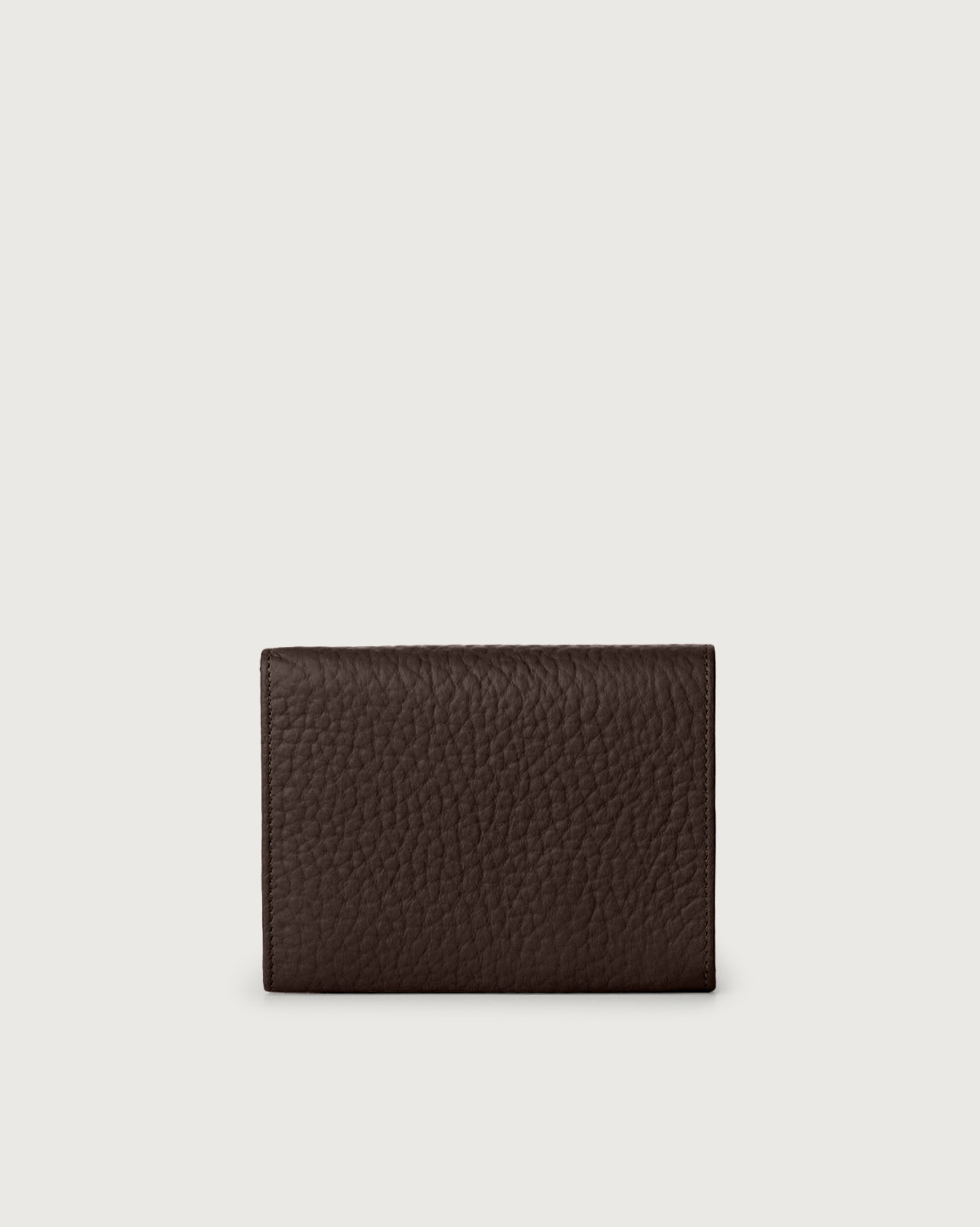 lunghezza: 13 cm altezza: 11 cm profonditร : 3 cm portafoglio in pelle martellata protezione RFID antifrode chiusura con bottone a pressione tre scomparti per banconote cinque scomparti porta carte porta monete centrale con zip dettagli finitura palladio made in Italy