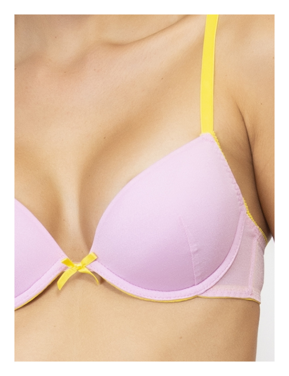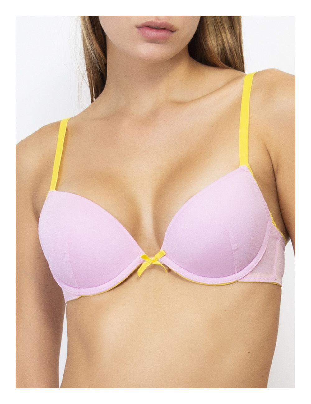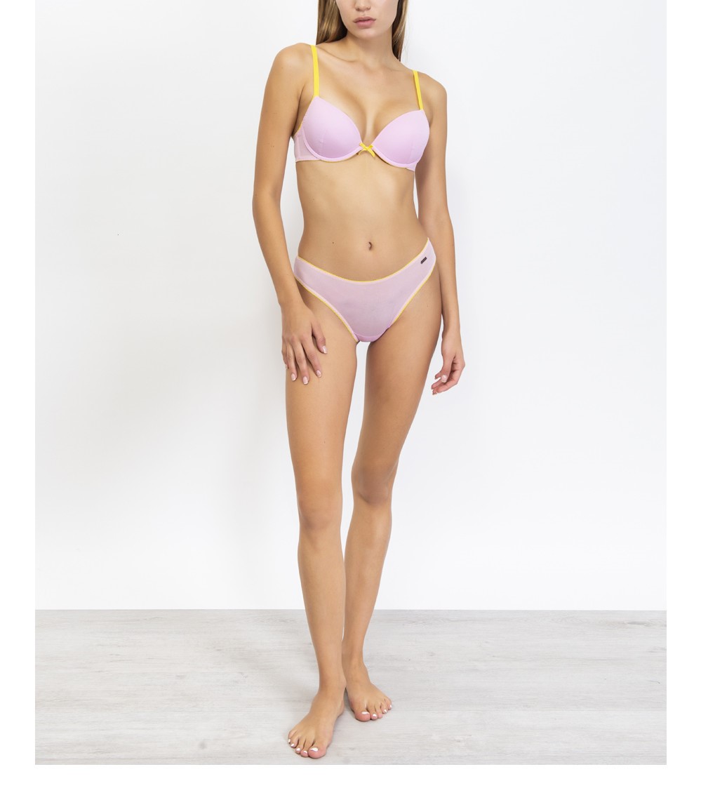 Il Push-up in tulle VERDISSIMA, รจ un reggiseno con coppe imbottite, lunette estraibili e ferretto in fine tulle dai toni vivaci con spalline e dettagli a contrasto. Push-up dalle linee semplici e pulite che si fa notare per gli esclusivi contrasti di colore. Modello che valorizza ed esalta il dรฉcolletรฉ.