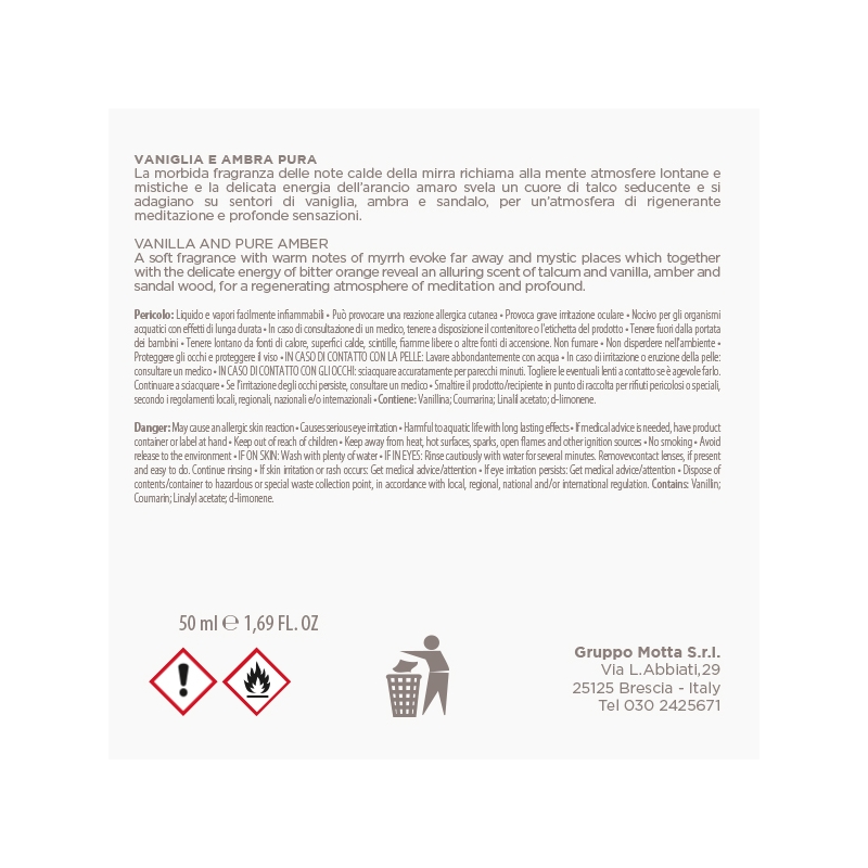 - VANIGLIA E AMBRA PURA La morbida nota calda della mirra richiama alla mente atmosfere lontane e mistiche unita all’energia dellโarancio amaro, svelano un cuore di talco seducente e si adagiano su sentori di vaniglia, ambra e sandalo.