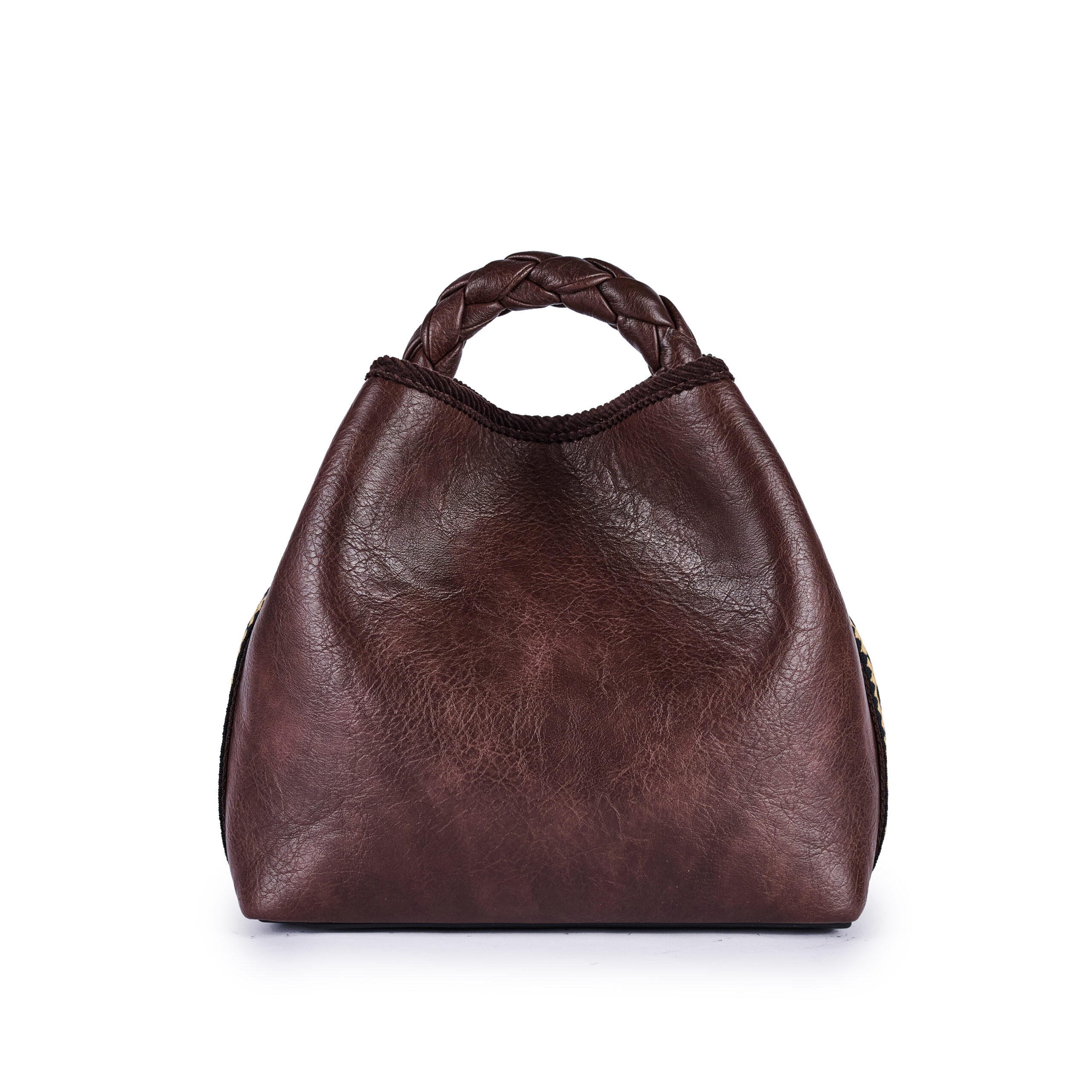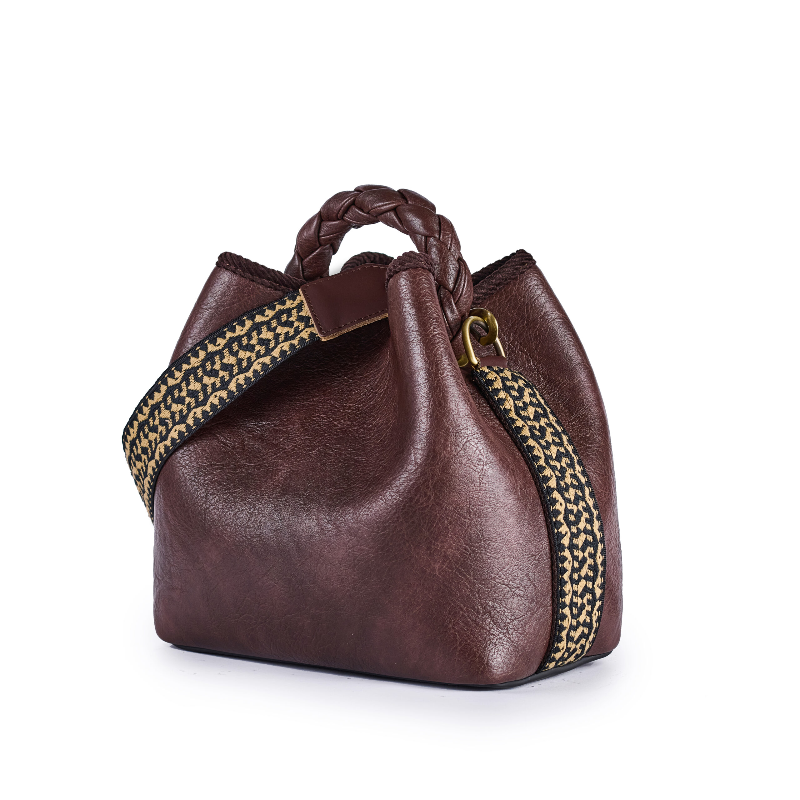 Secchiello in eco pelle Dettagli etnici Manico intrecciato a mano Tasca interna Tracolla jacquard Dimensioni: Larghezza 28cm x Altezza 27cm x Profonditร 16cm Designer colour: Marrone Fatto in Italia con Tessuti Italiani