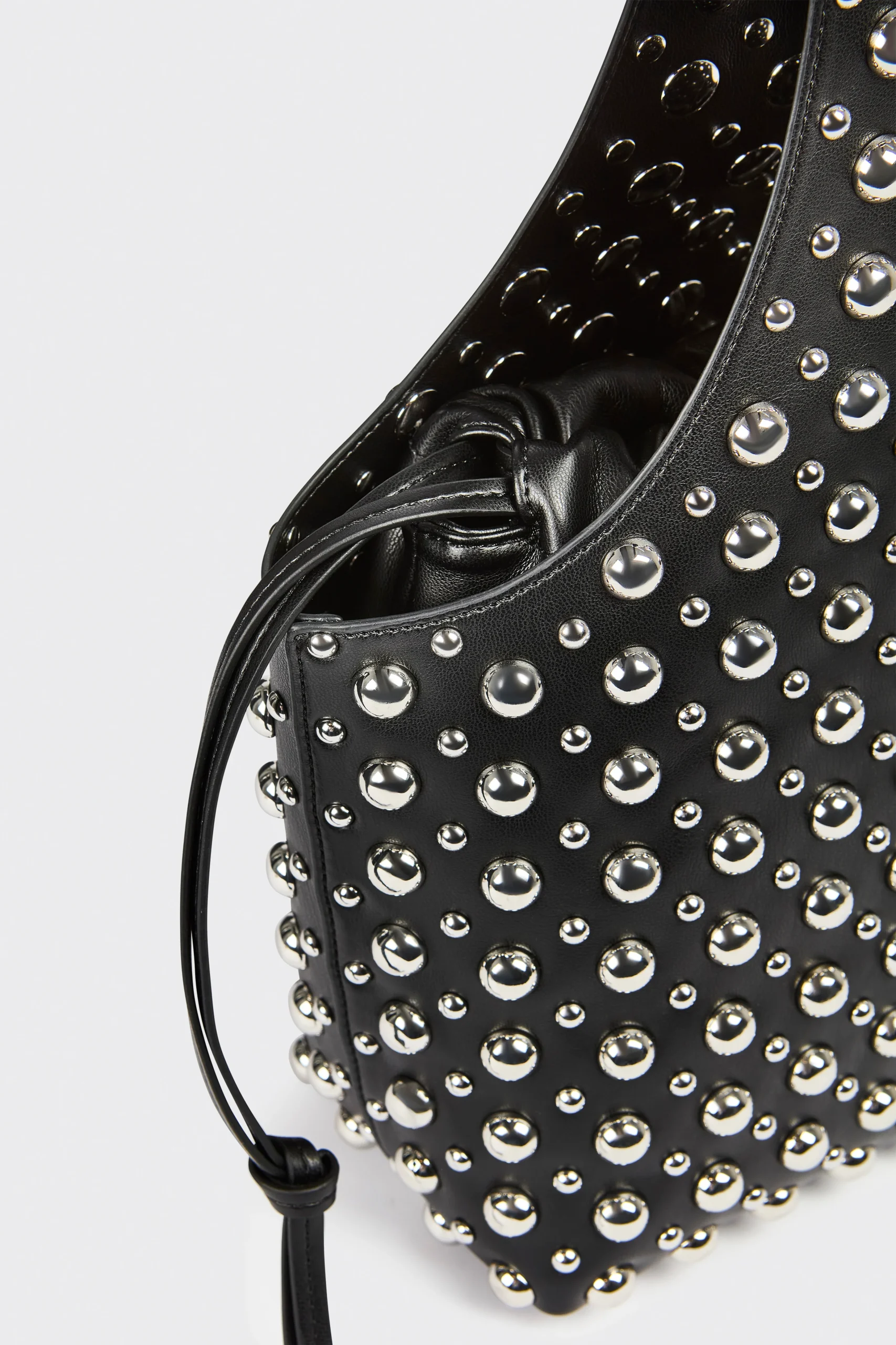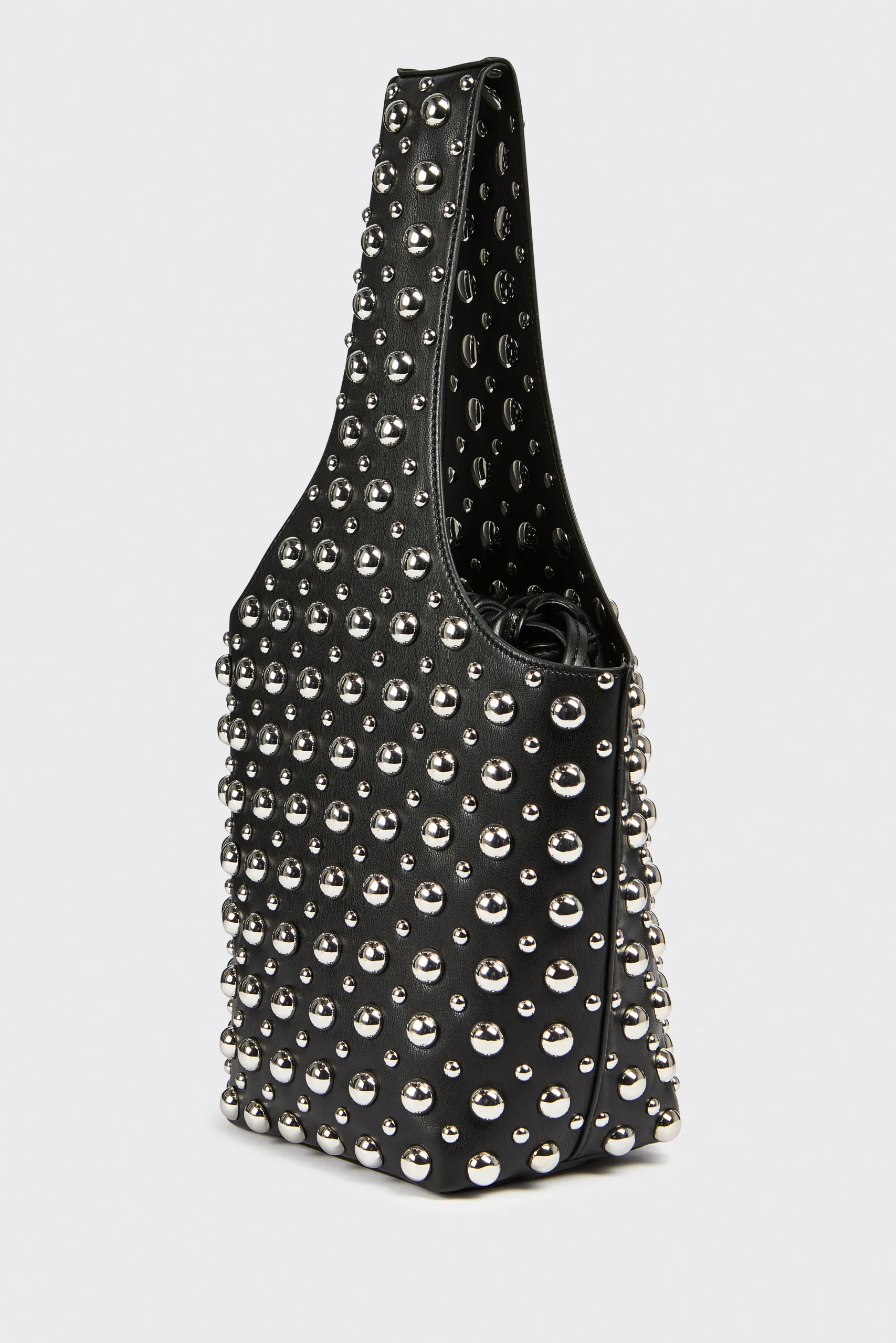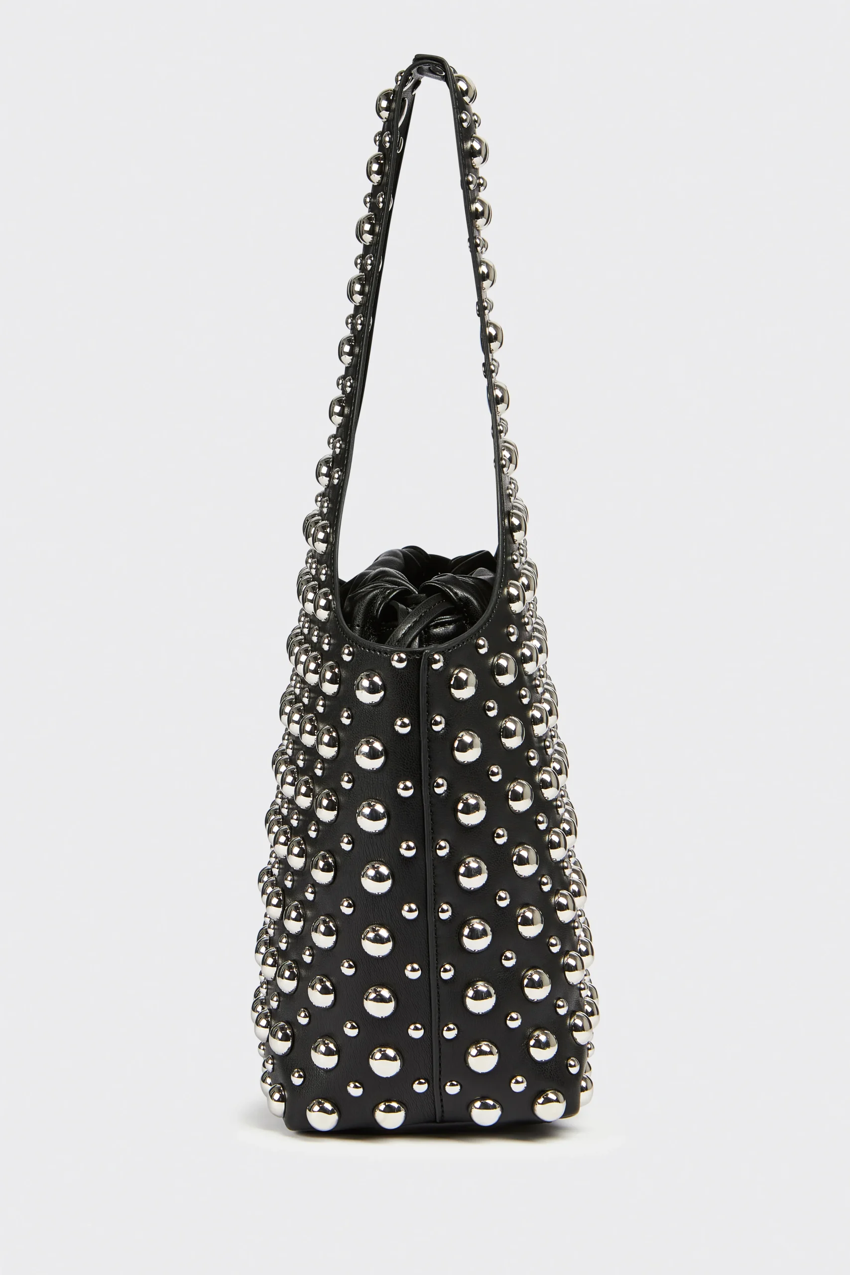 Il Secchiello Debbie LIVIANA CONTI, รจ una borsa a secchiello con borchie in vegan leather, pouch interna removibile, chiusura con coulisse.