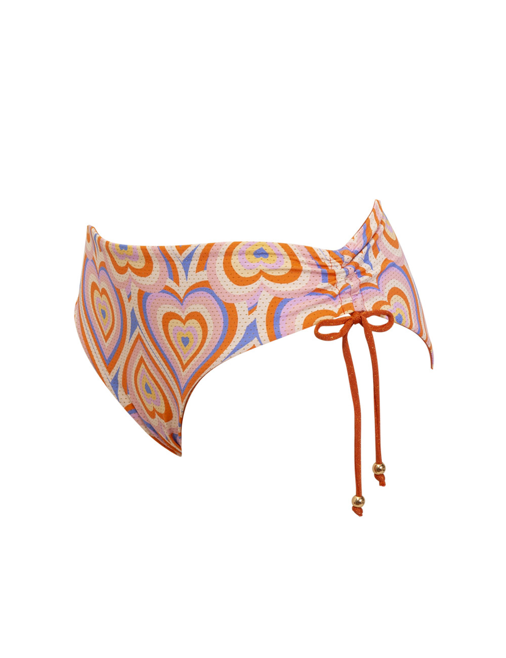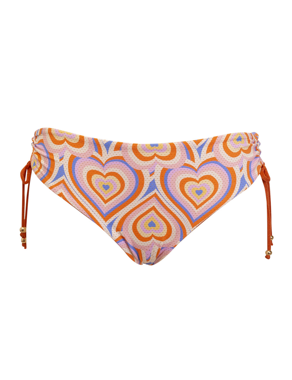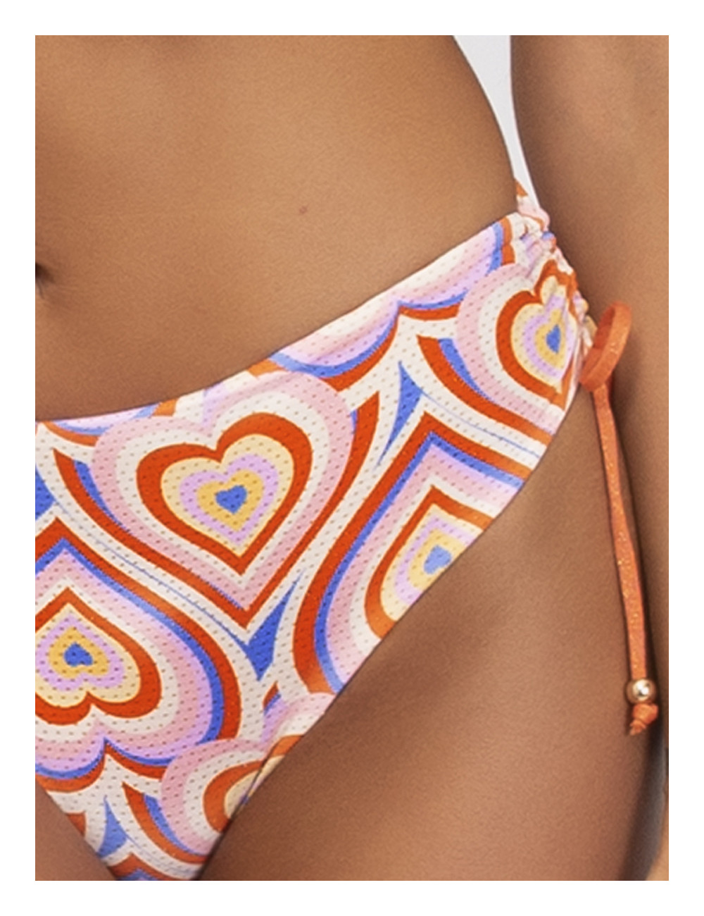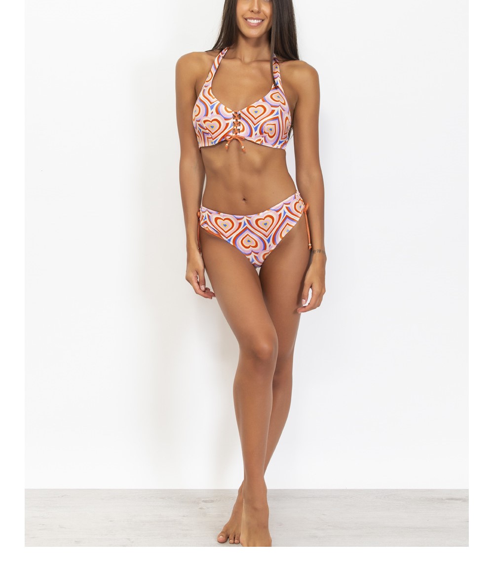 Slip bikini regolabile con coulisse sul fianco Double face stampa cuore/ tinta unita COMPOSIZIONE TESSILE: Tessuto interno: 80% Poliammide – 14% Metallo – 6% Elastan ; Tessuto esterno: 80% Poliammide – 13% Elastam – 7% Metallo