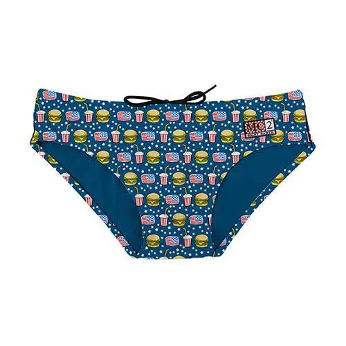 Costume mare bimbo a slip in lycra, sfondo blu con stampa di hamburger, bevande e bandiera americana, vita elastica regolabile all’interno.