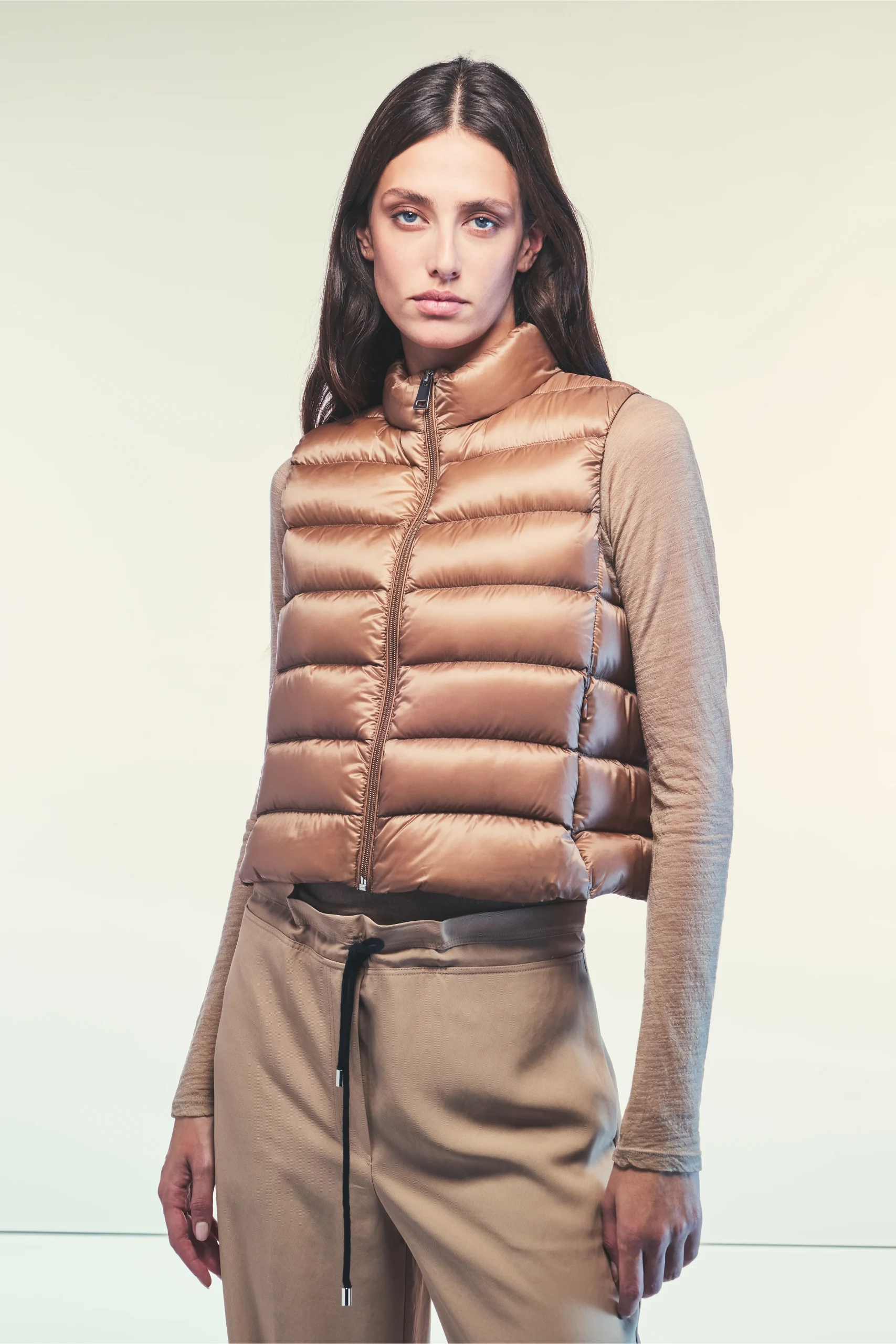 Piumino corto smanicato Chiusura centrale tramite zip Tasche laterali con chiusura a zip Collo alto Coulisse laterali per una migliore vestibiltร Composizione: 100% Poliammide Imbottitura: 90% Piumino d’anatra 10% Piuma d’anatra