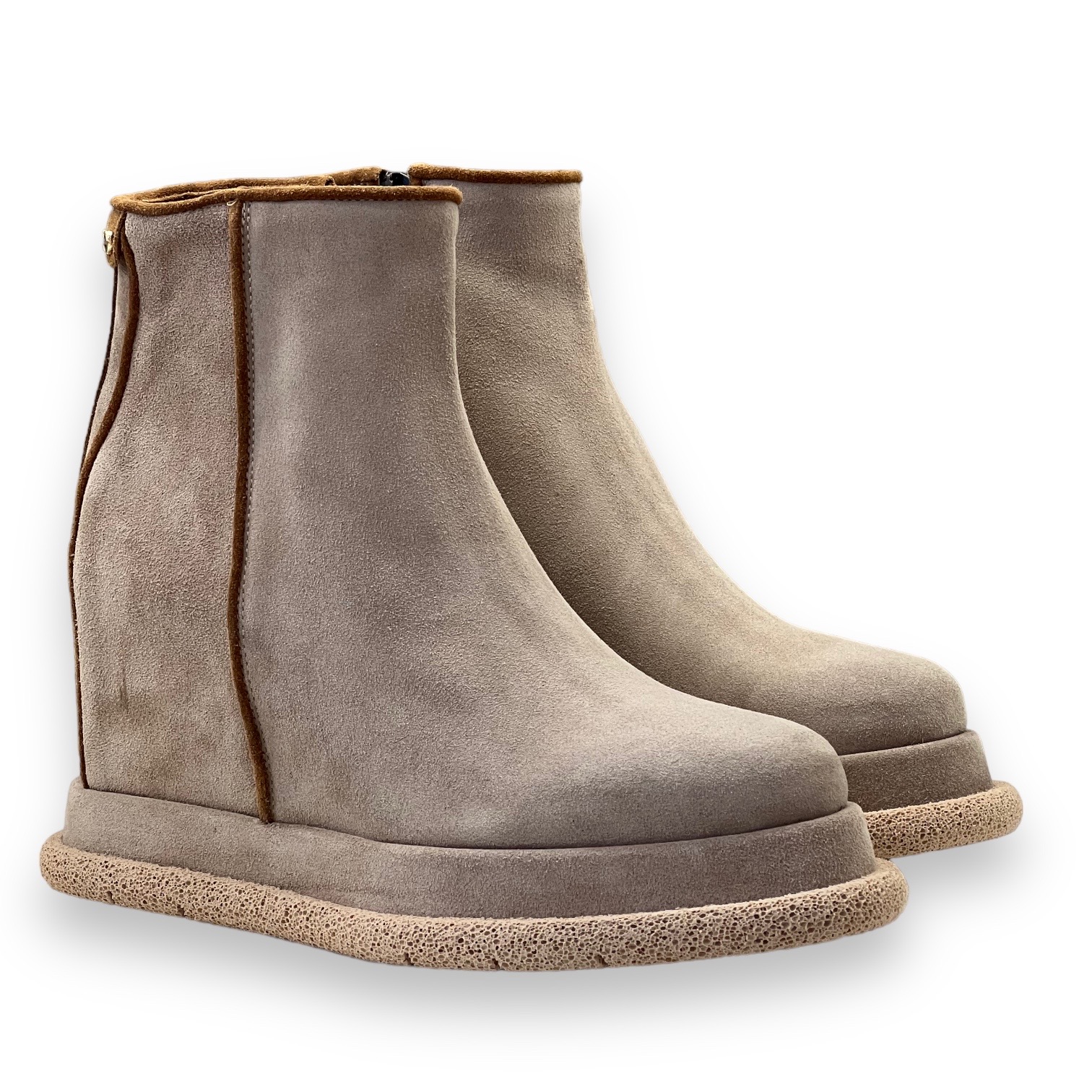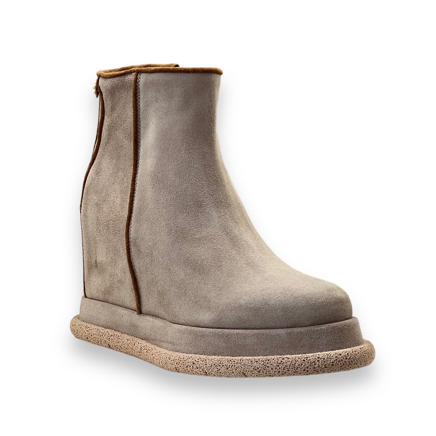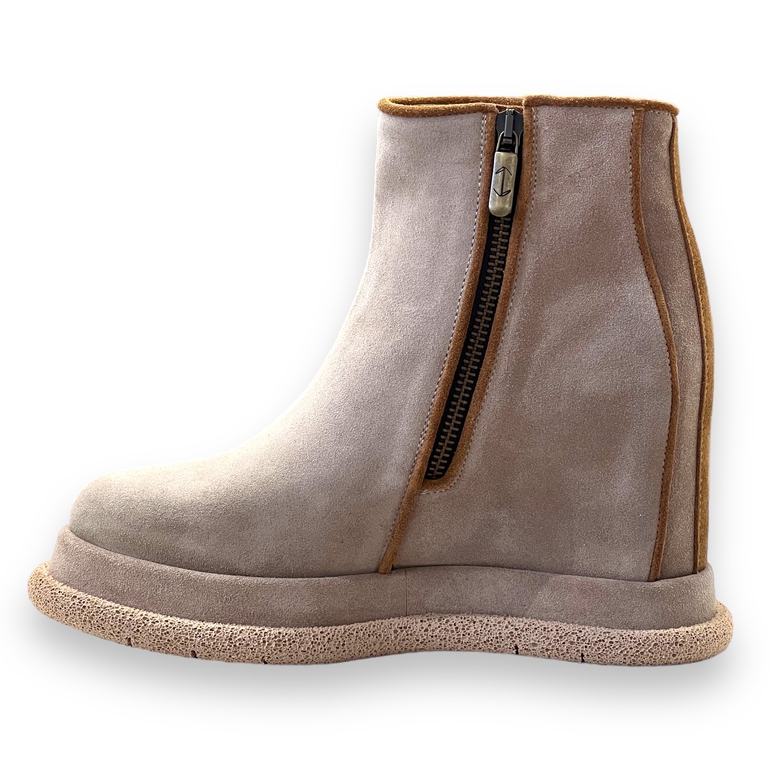 Stivaletto realizzato artigianalmente in morbido camoscio idrorepellente Zeppa interna di 7 cm Suola in gomma di 3 cm Zip laterale per una migliore calzata Tomaia 100% pelle Suola 100% gomma Made in Italy