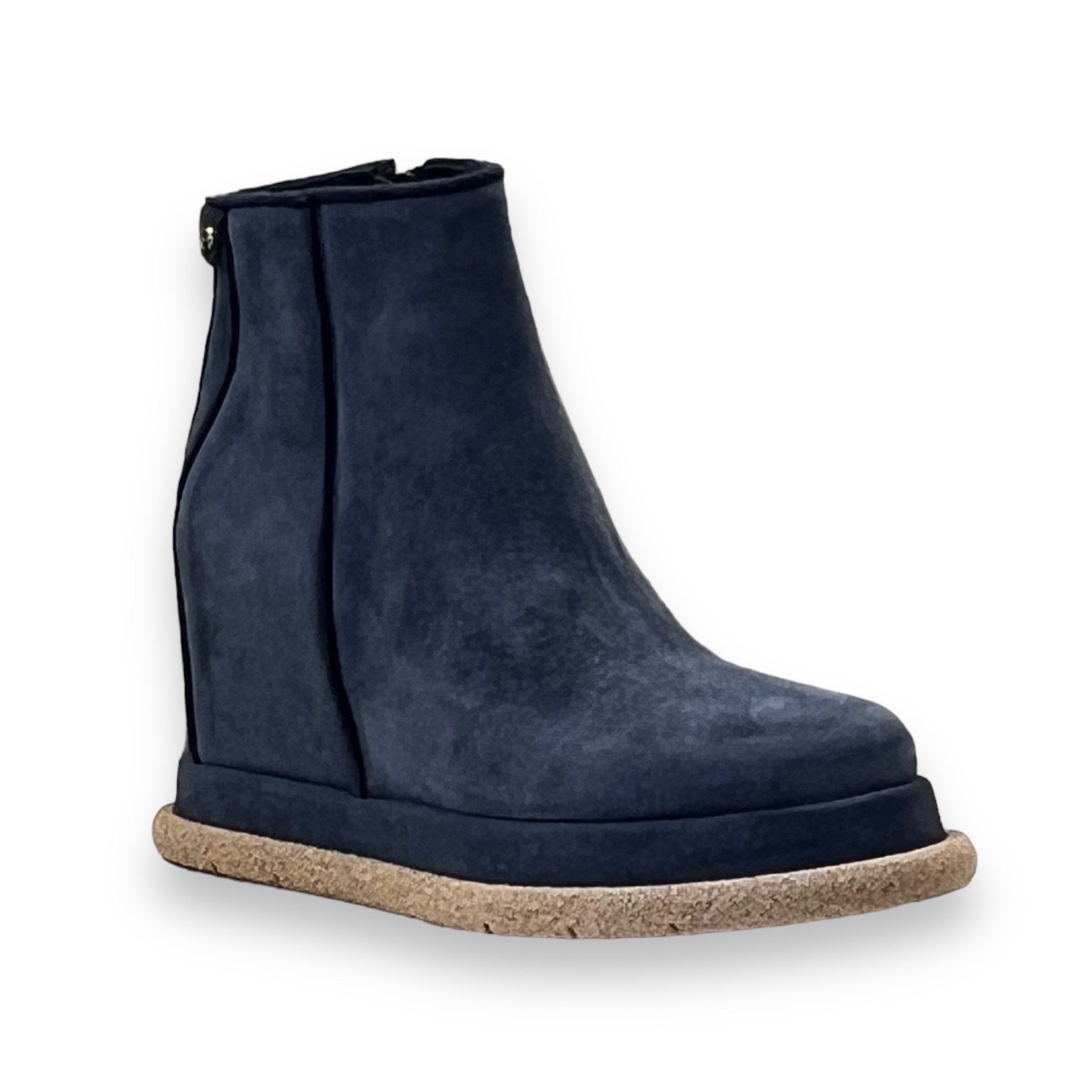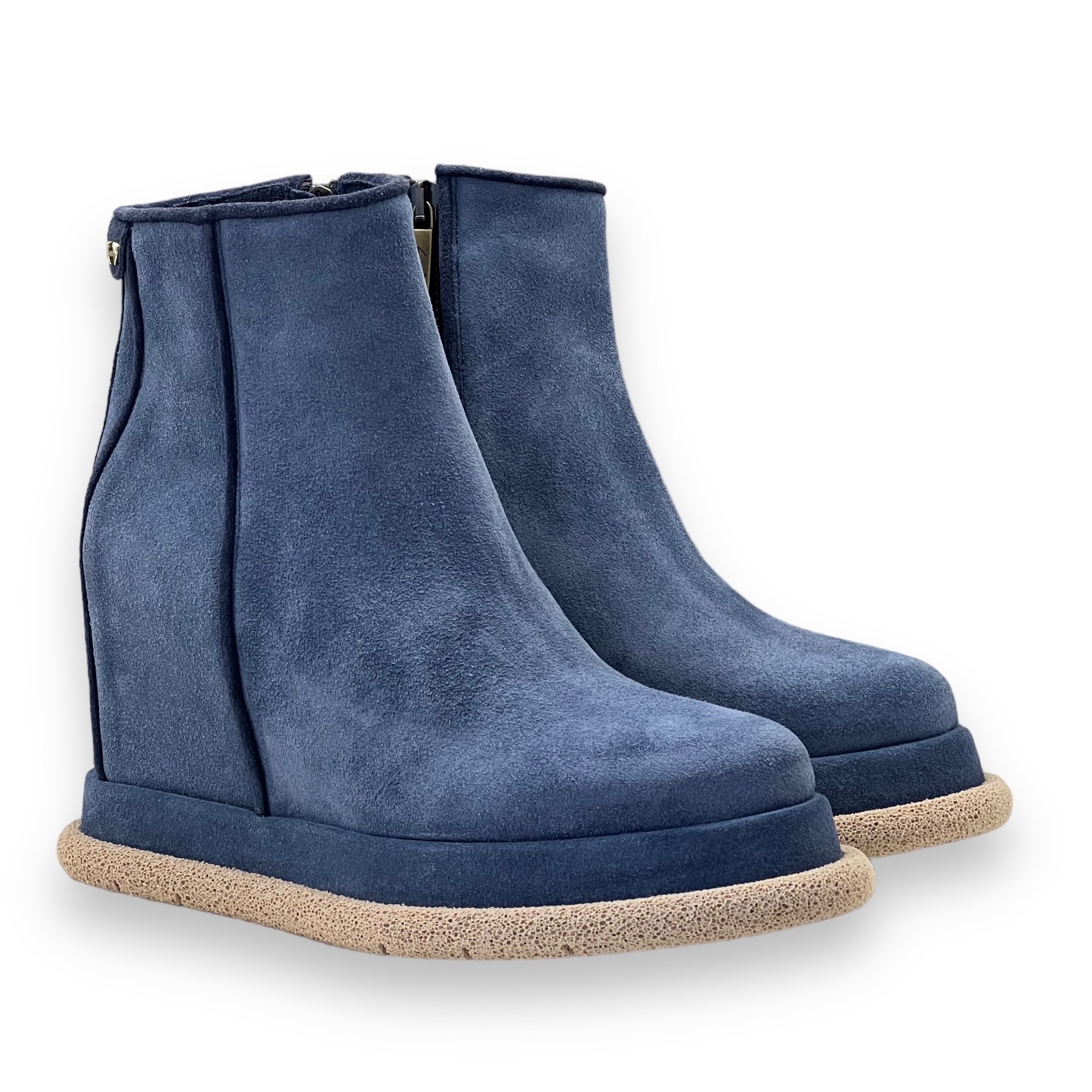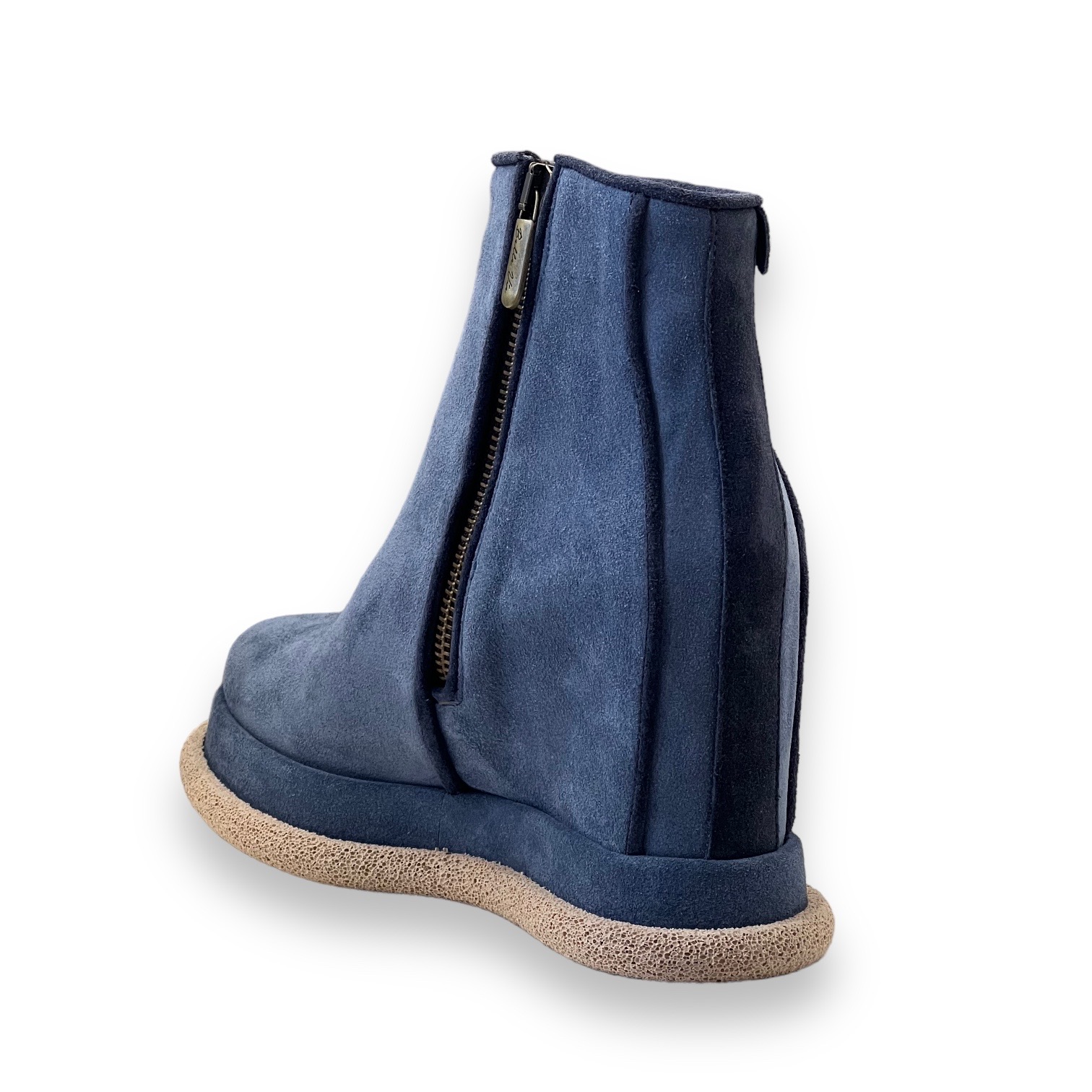 Stivaletto realizzato artigianalmente in morbido camoscio idrorepellente Zeppa interna di 7 cm Suola in gomma di 3 cm Zip laterale per una migliore calzata Tomaia 100% pelle Suola 100% gomma Made in Italy