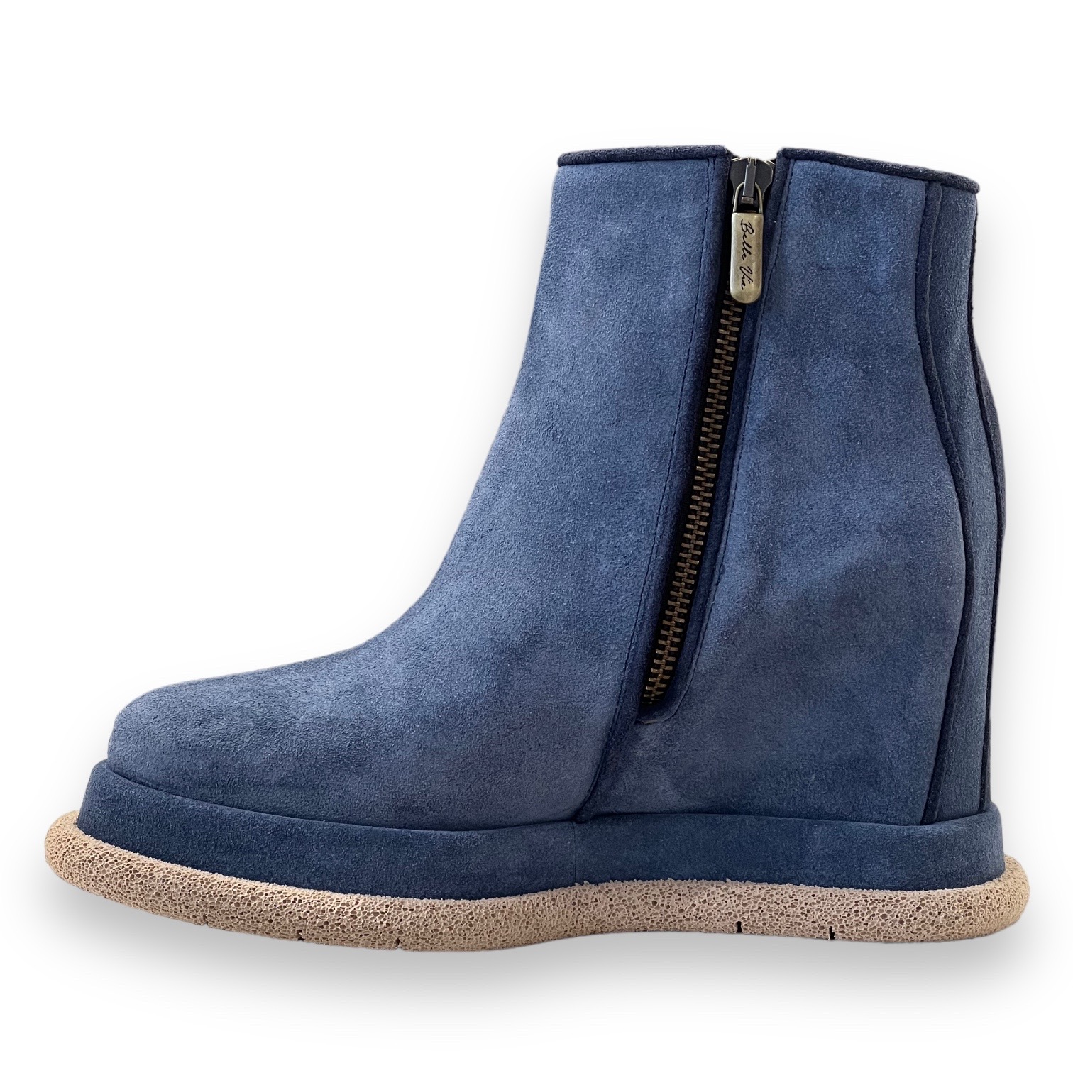 Lo Stivaletto Via Acqua BELLE VIE, รจ il classico stivaletto Belle Vie rivisitato per la stagione estiva, realizzato artigianalmente in morbido camoscio idrorepellente, presenta una zeppa interna di 7 cm e una suola in gomma di 3 cm, zip laterale per una migliore calzata,ย tutto rigorasamente made in Italy.