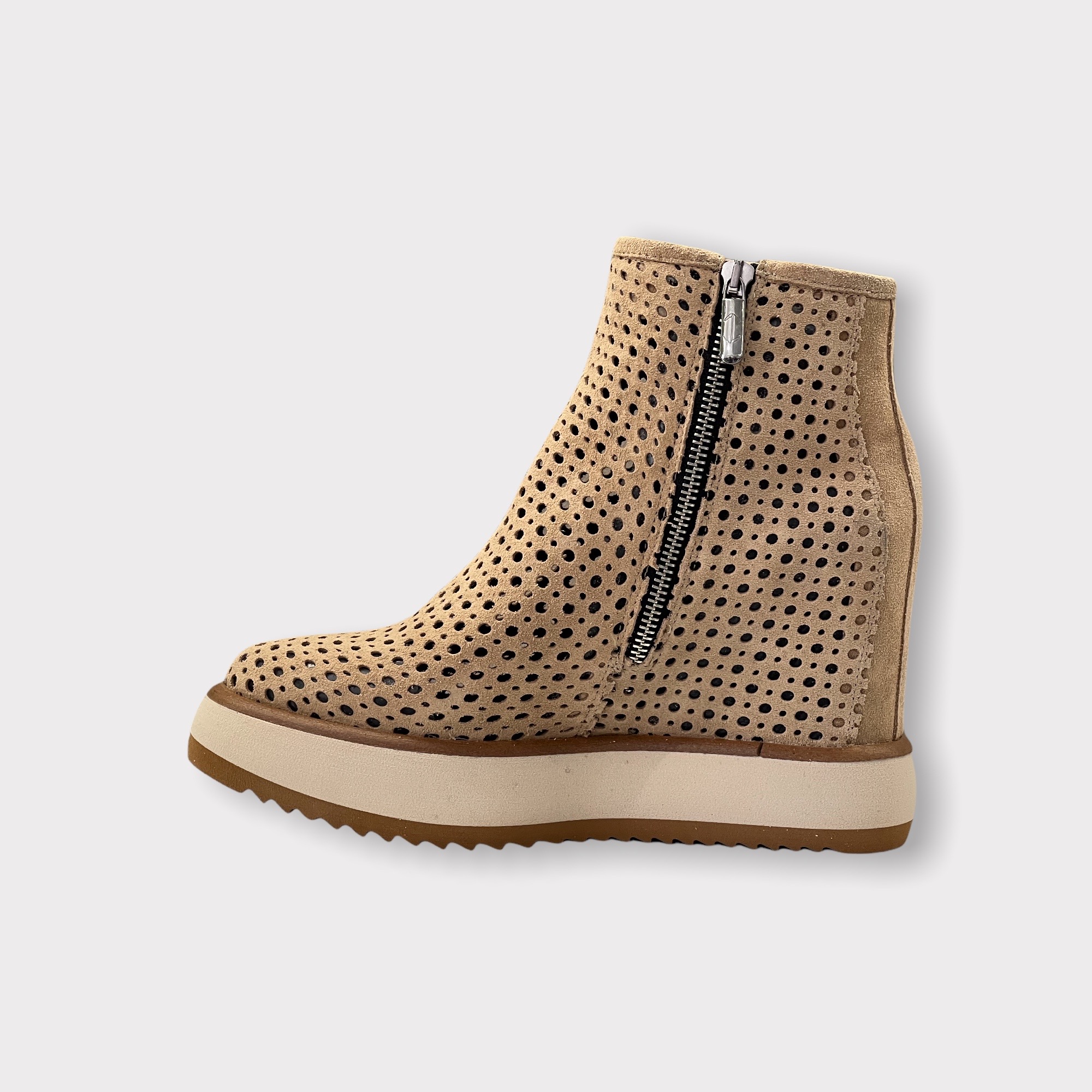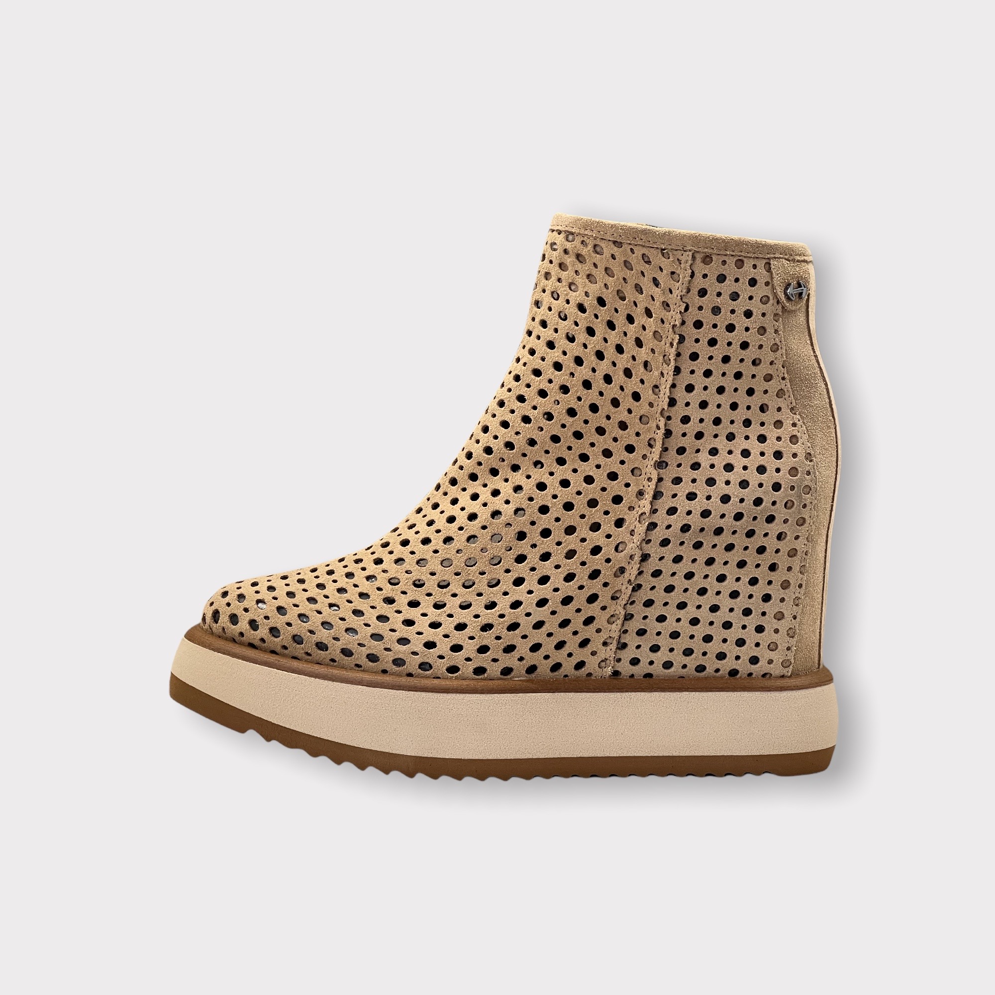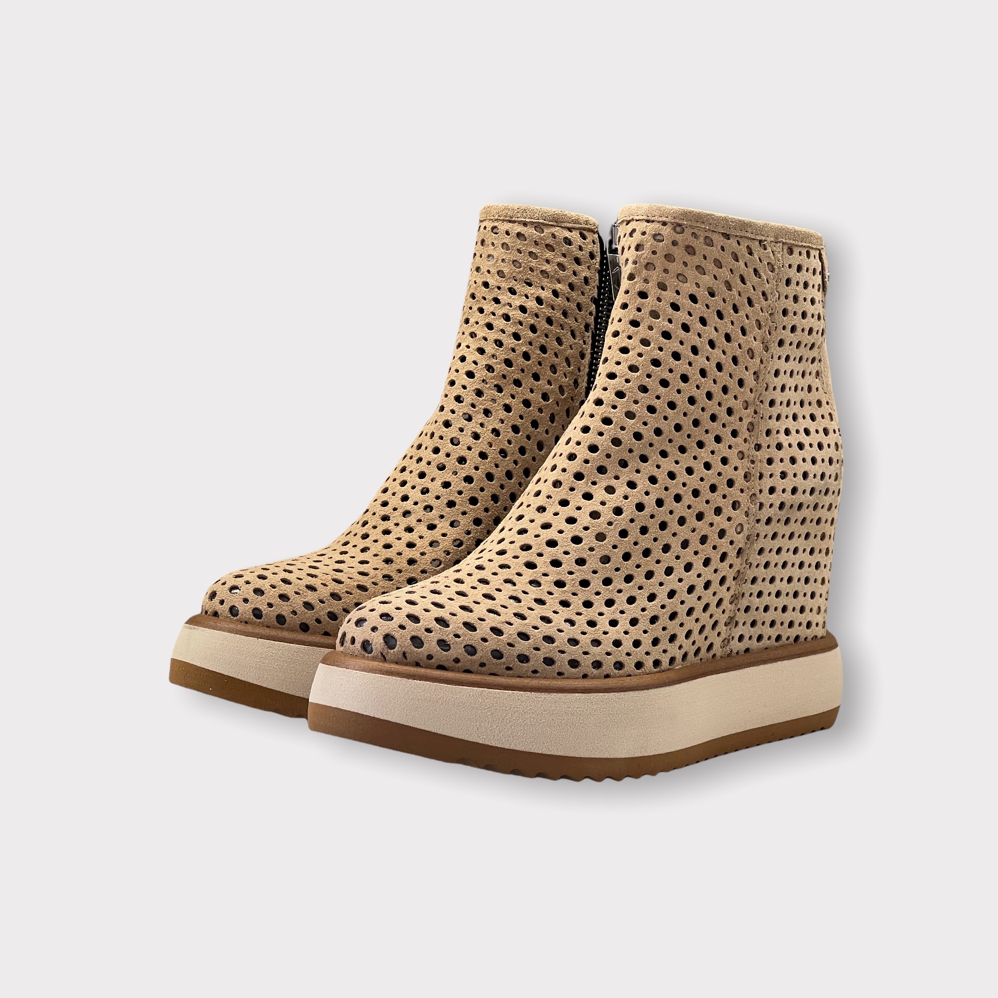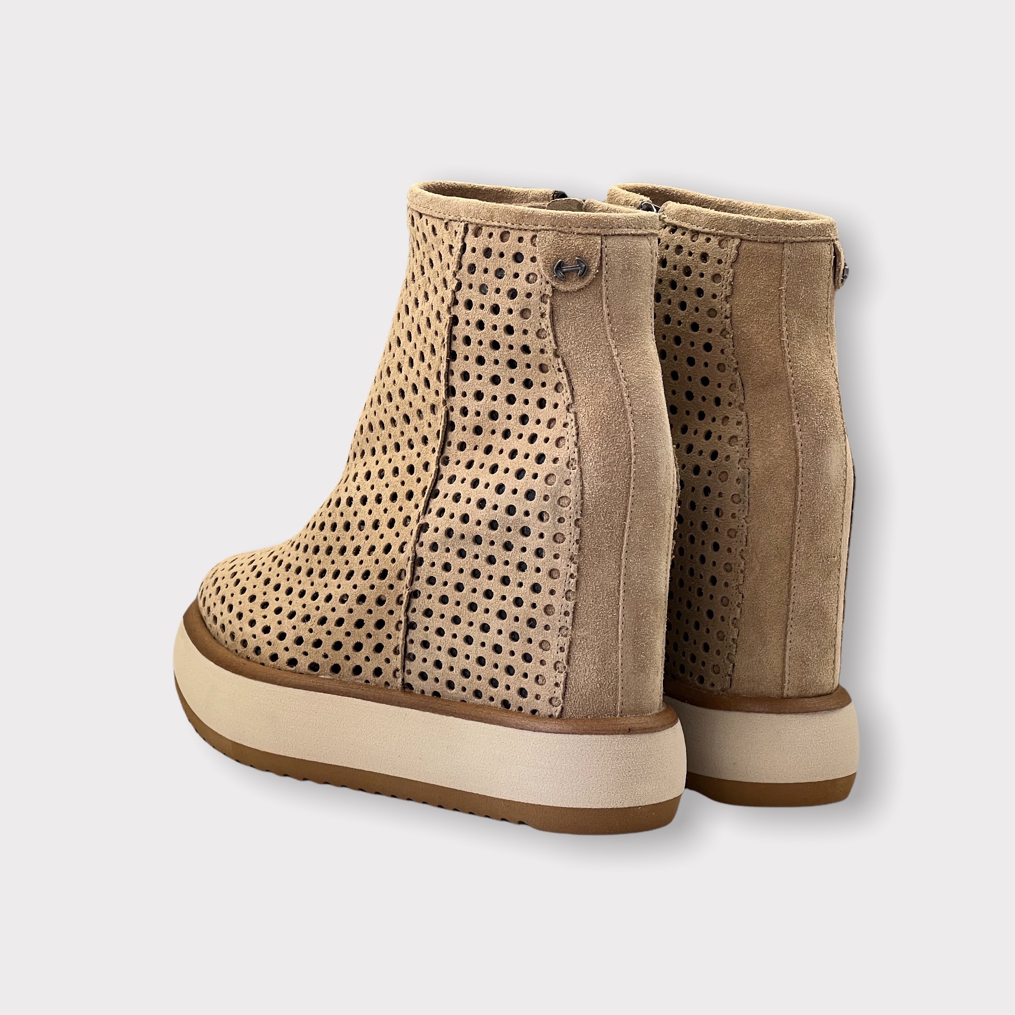 Stivaletto Via Ancore Realizzato artigianalmente in morbido velour forato Zeppa interna di 7 cm Suola in gomma di 4 cm Guardolo in cuoio Tomaia 100% pelle Fondo barley Suola 100% gomma Made in Italy
