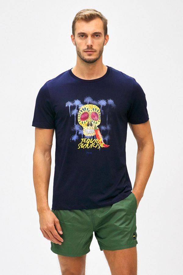 T-shirt blu da uomo con stampa teschio, a maniche corte della linea F**K: un capo unico nel suo genere.ย La stampa forma di teschio ti permette di abbinare la maglietta con un jeans per un look casual o sopra un bermuda per i tuoi apertivi a bordo piscina.ย MATERIALE: 100% cotone. L’originale disegno si completa con un peperoncino e la scritta “tequila sunrise”, dettagli che rendono questo capo unico nel suo genere!
