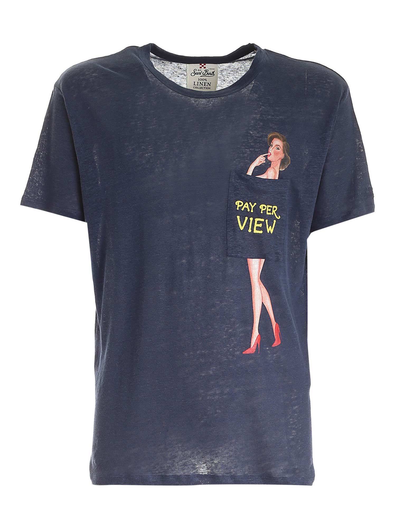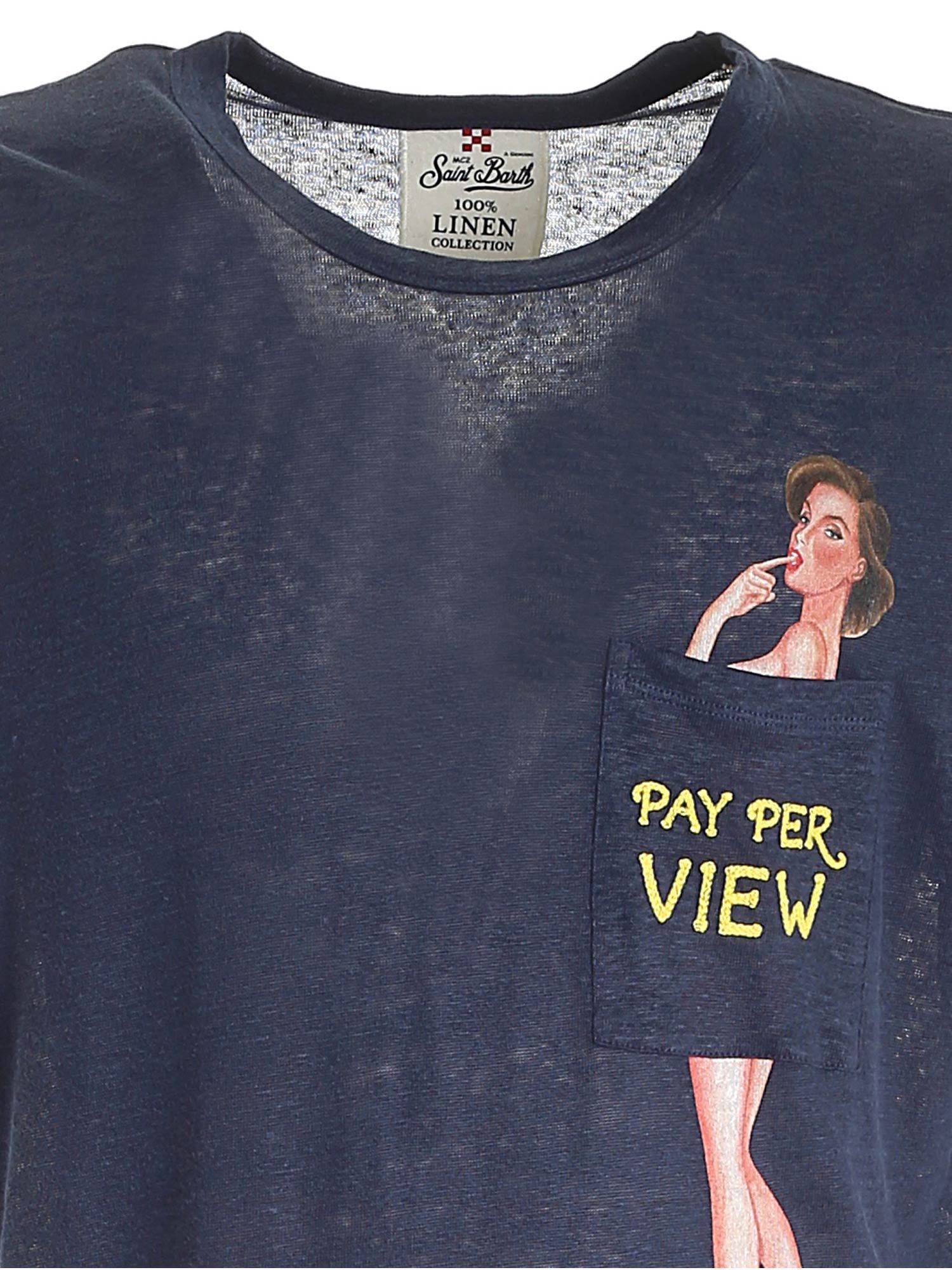 T-shirt da uomo in lino blu, taschino frontale stampato “pay per view”. Girocollo e maniche corte.