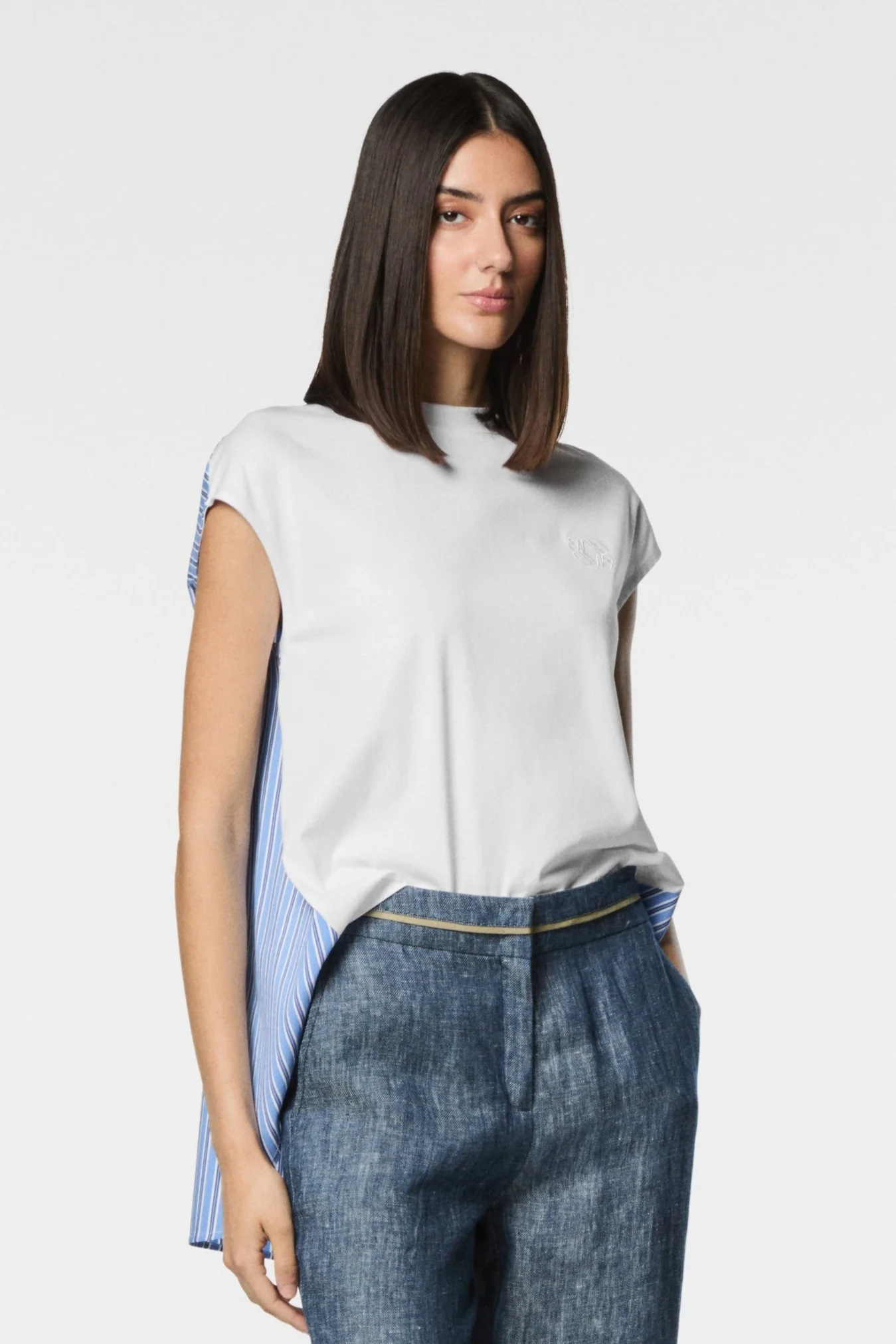 T-shirt a maniche corte Inserto in popeline rigato sul retro Design asimmetrico che crea un effetti oversize e fluido Tessuto leggero la rende traspirante, unendo cosรฌ comfort e stile Perfetta per il look estivo elegante e versatile Composizione: Fronte 100% Cotone ; Retro 71% Cotone 26% Poliammide 3% Elastane