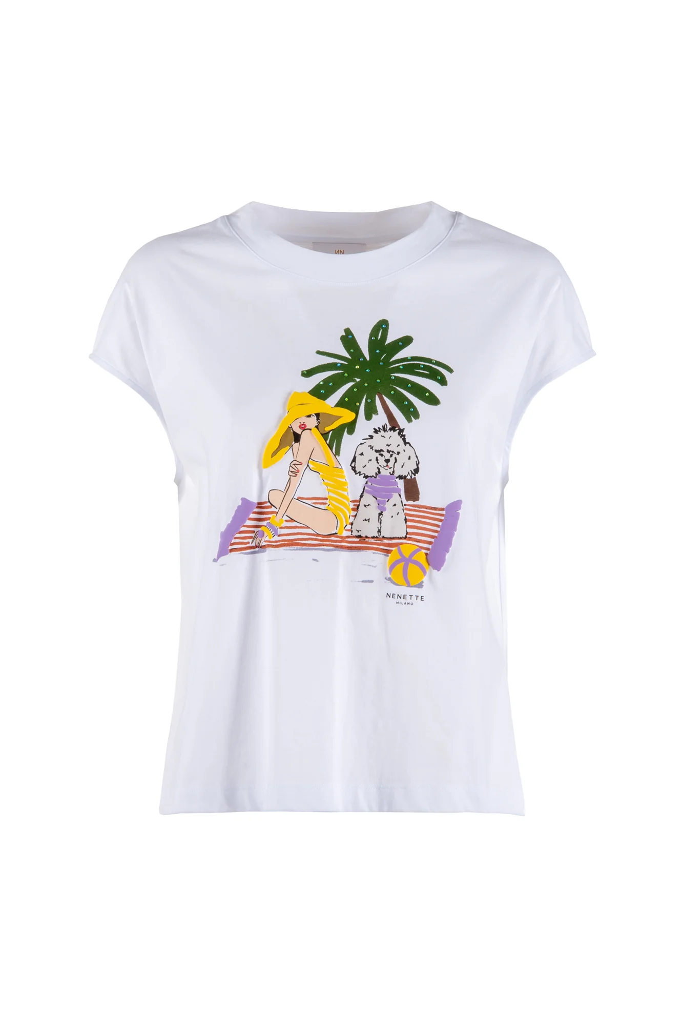 La T-shirt Debra NENETTE, รจ una t-shirt a manica corta con stampa “ragazza e cane in spiaggia”.