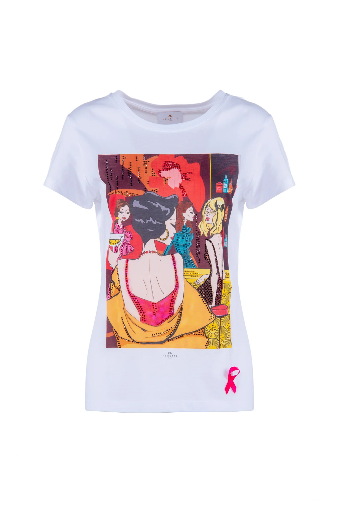T-shirt a maniche corte Stampa โLocaleโ con strass Questa t-shirt รจ legata all’iniziativa solidale FOLLOW THE PINK della Fondazione IEO-MONZINO Composizione: 100% Cotone