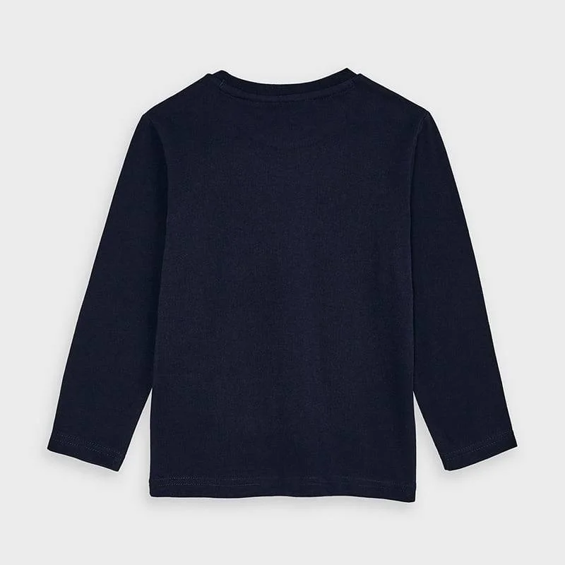 T shirt bimbo girocollo blu, manica lunga, realizzata in morbido cotone elasticizzato. Stampa frontale di tre automobili.