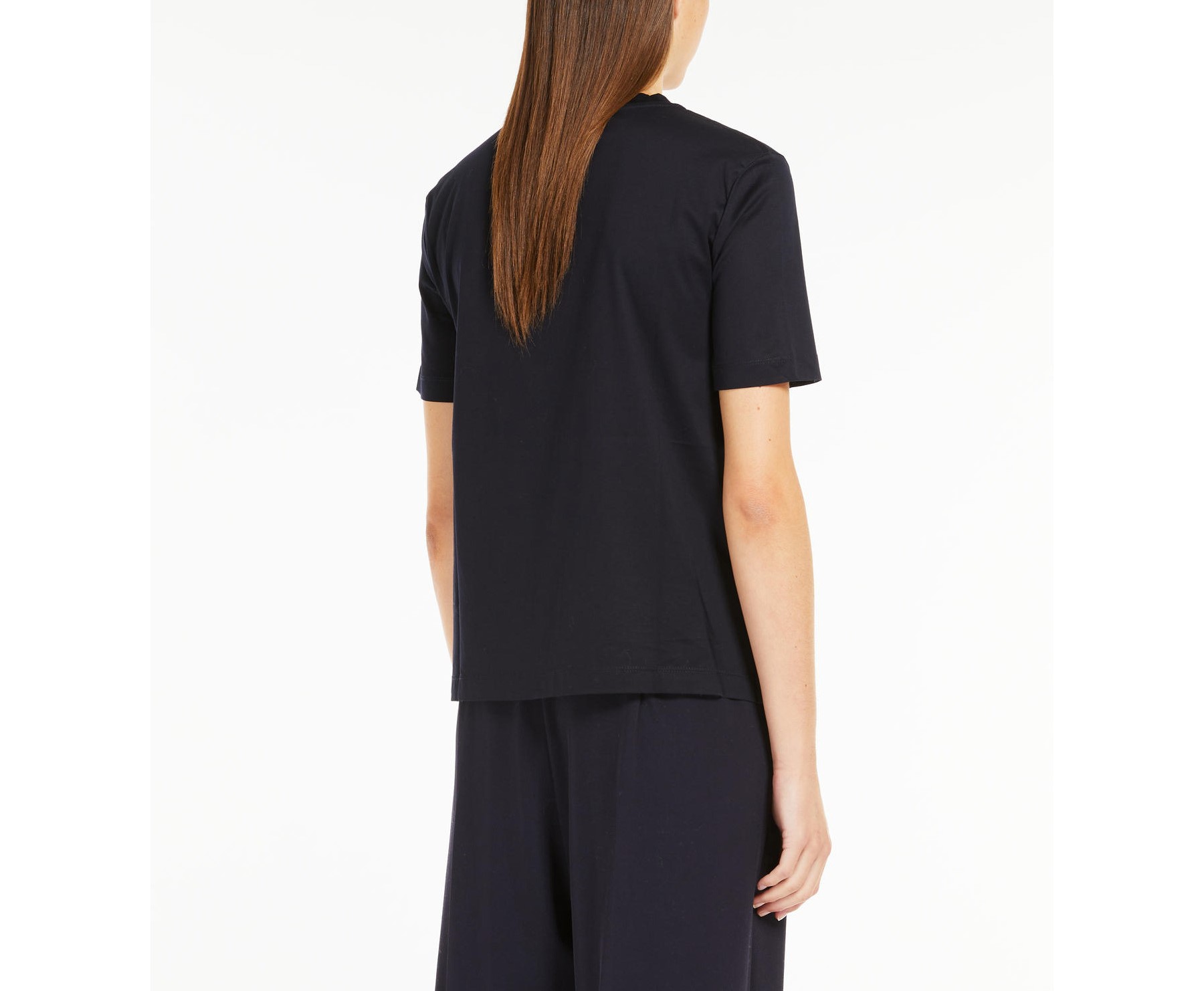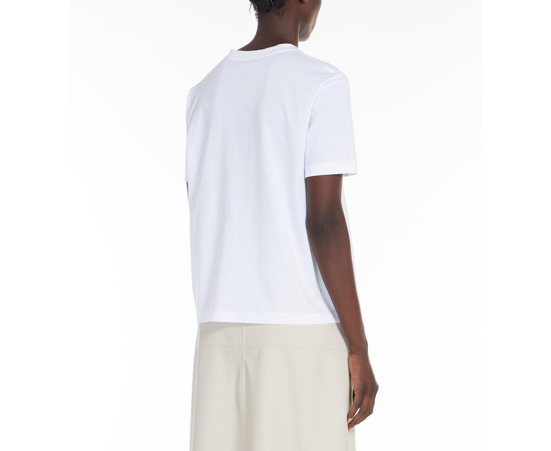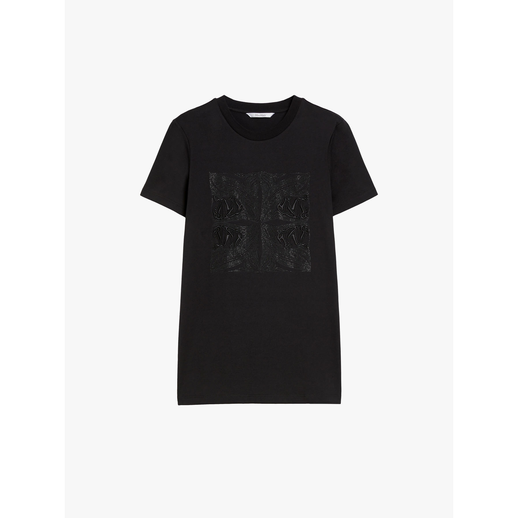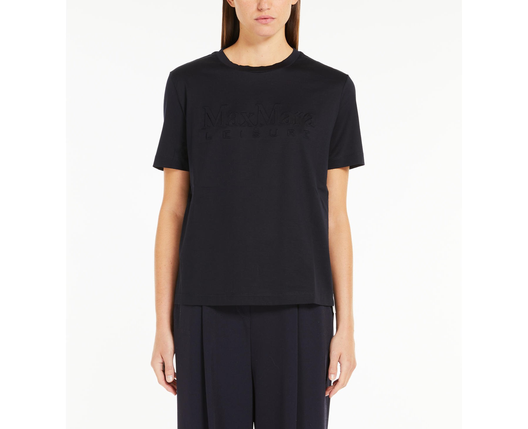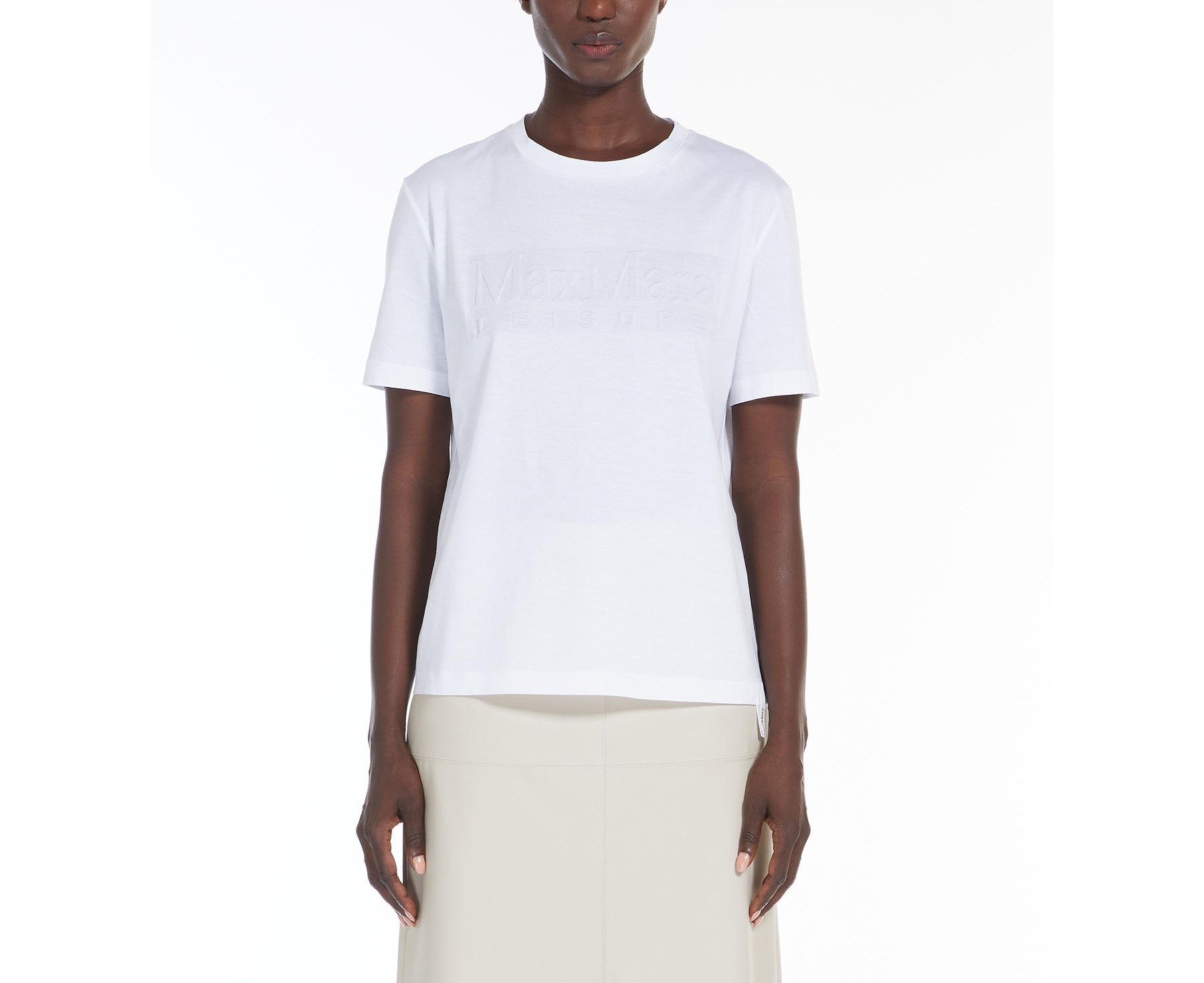 La T-shirt Paggio MaxMara Leisure, รจ una t-shirt in jersey di cotone con girocollo e maniche corte. Il logo con effetto embossed sul davanti e il dettaglio di gros-grain con logo al fondo personalizzano il capo.
