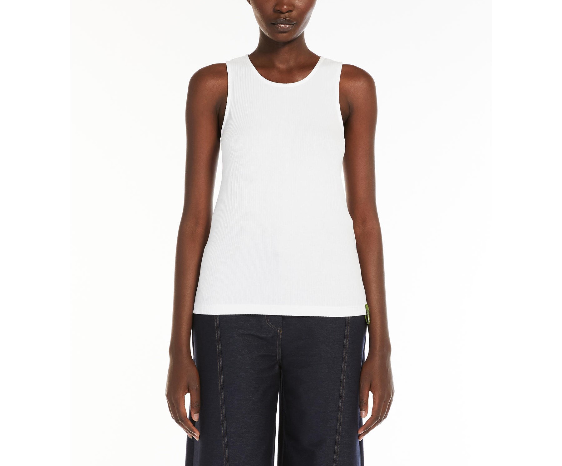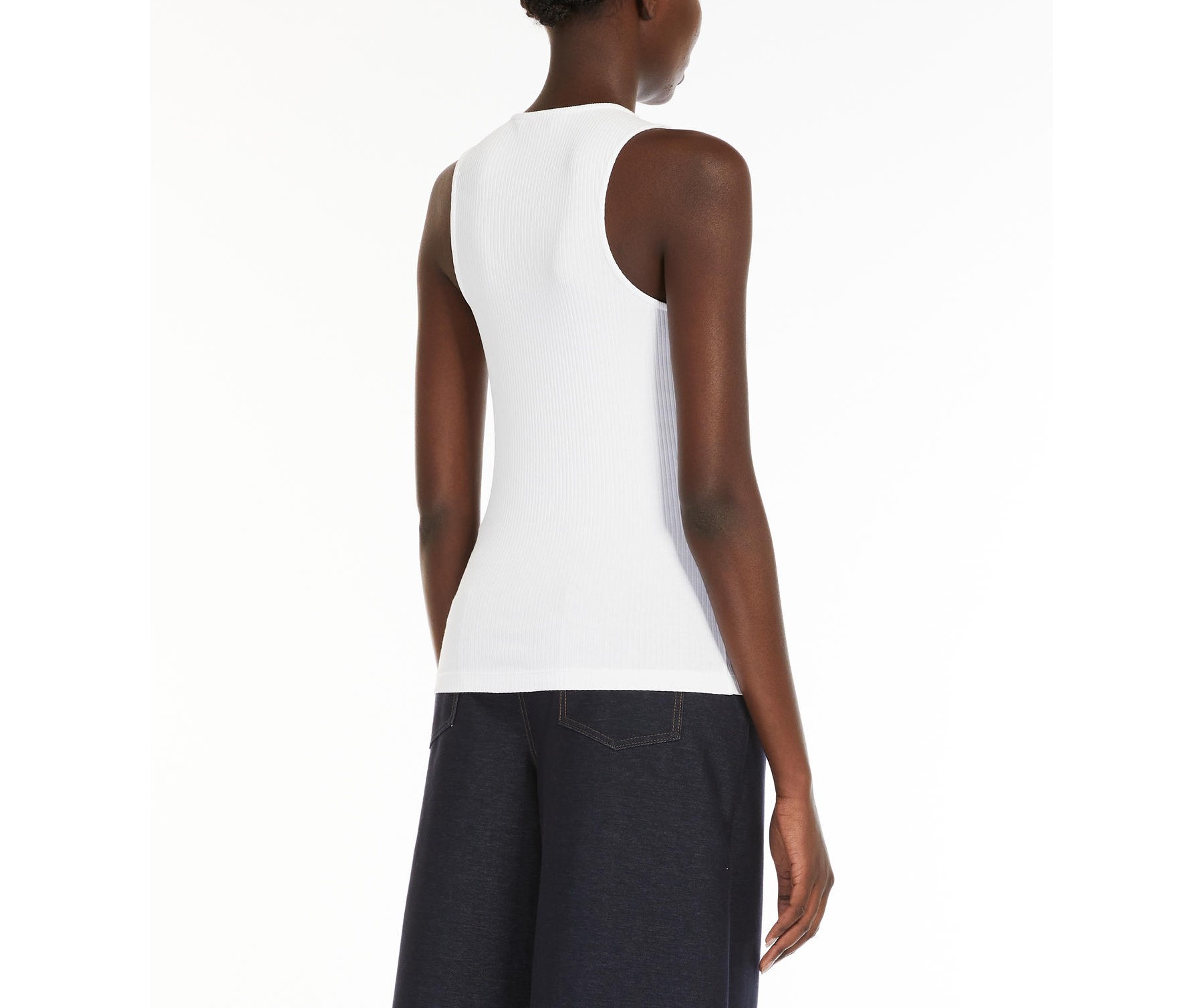 Top smanicato in morbido jersey di puro cotone lavorato a costine Modello dalla linea aderente sui fianchi Caratterizzato da un piping con logo a contrasto applicato sull’orlo Composizione: 92% Cotone, 8% Elastan