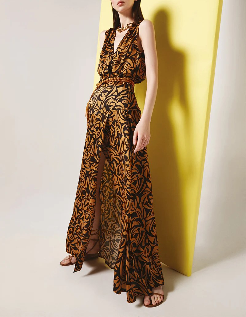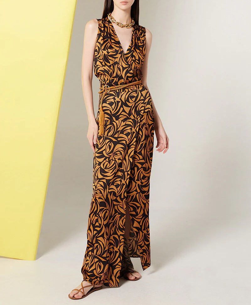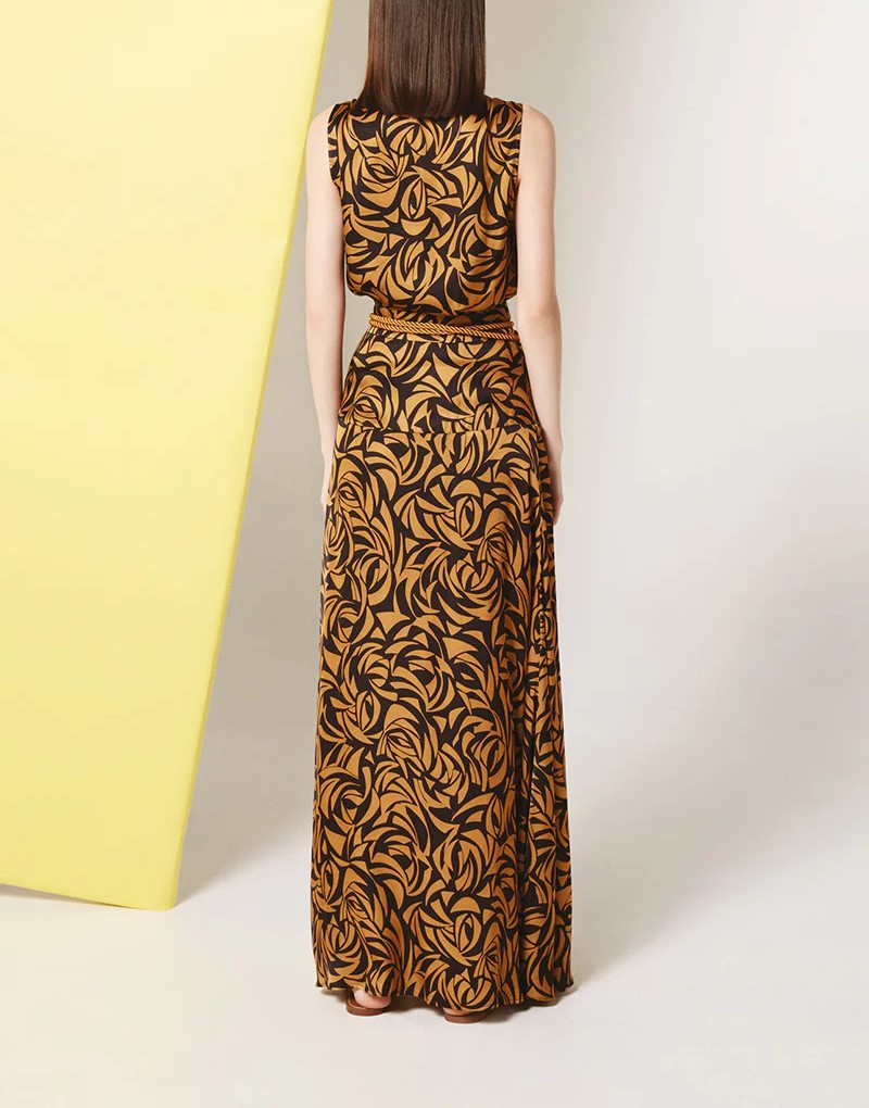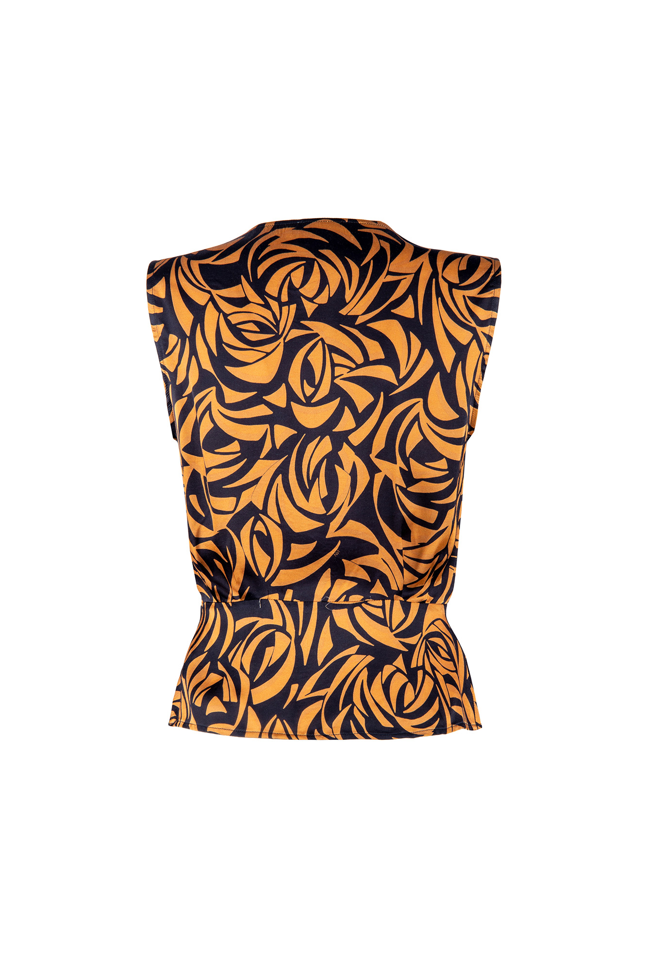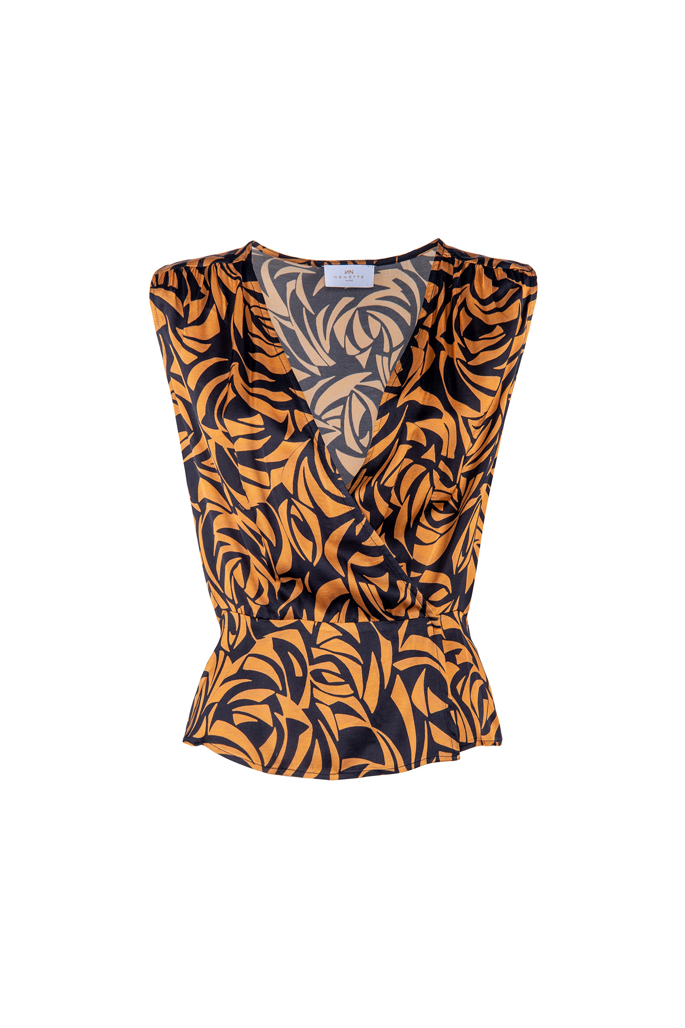 Il Top Fly NENETTE, รจ un top incrociato in raso di viscosa stampa sunset con fusciacca. Puรฒ essere indossato spezzato con un pantalone a tinta unita o con la sua gonna GIONA o con il pantalone corto ESTATE.