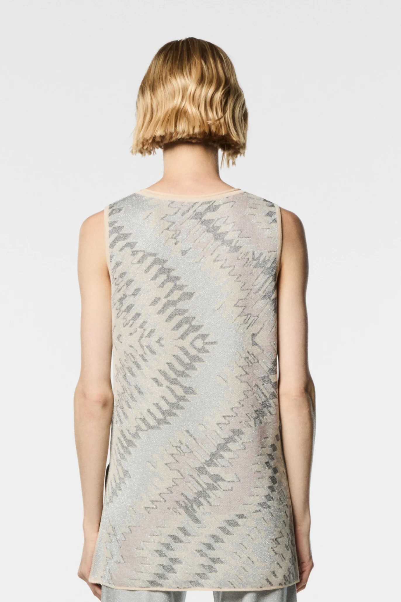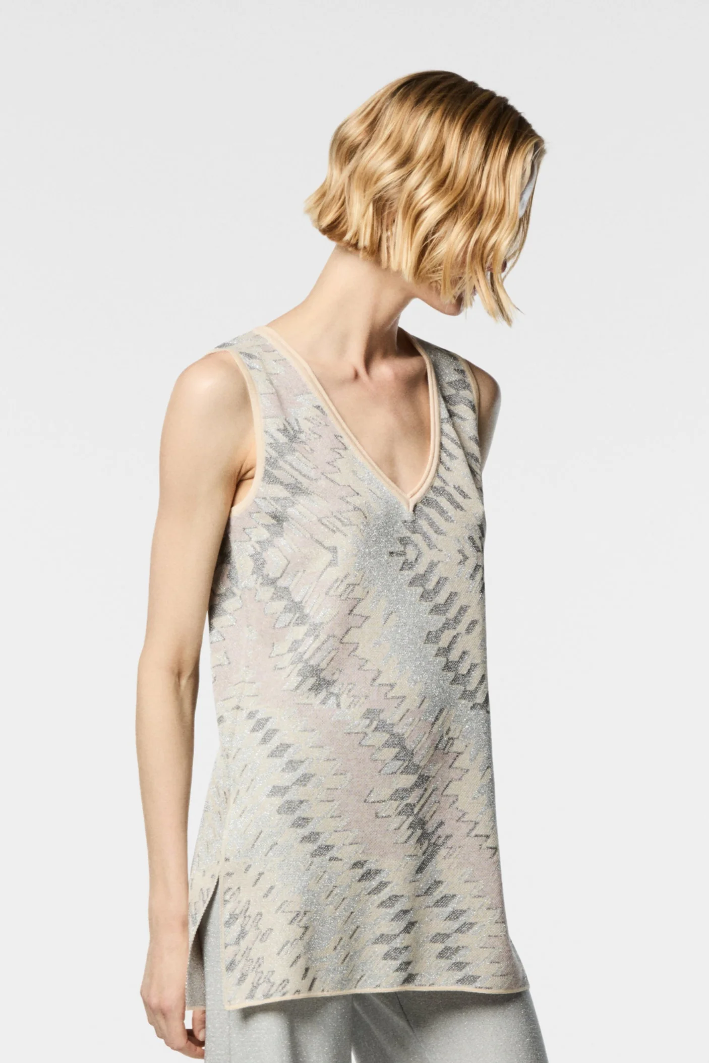 Top in maglia jaquard fantasia onda Scollo a V Spacchi Laterali Completo con il Pantalone YUYU e la giacca LEILA Composizione: 75% Viscosa 25% Poliestere