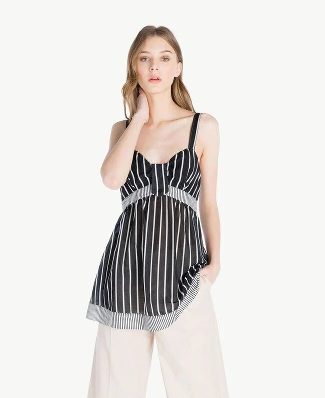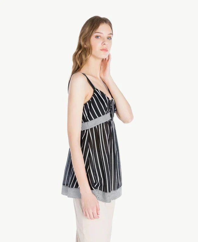 Top Twin Set a trapezio in cotone leggerissimo e seta stampata, con patch di stampa a contrasto, spalline sottili, alamari davanti, rigato nero e bianco, allacciatura con cerniera sulla schiena.