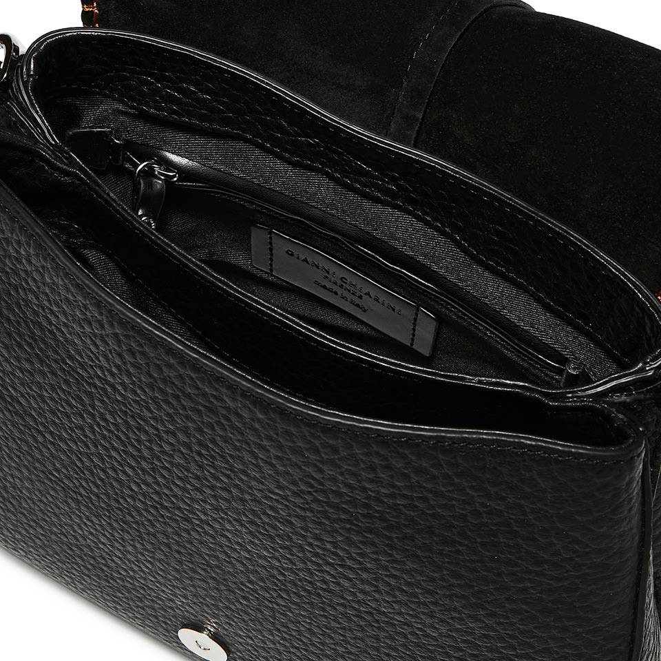 La borsa รจ realizzata in pelle morbida e resistente di alta qualitร , con una texture liscia e uniforme. Il colore nero della pelle รจ perfetto per creare un look raffinato ed elegante, ma allo stesso tempo discreto e versatile.