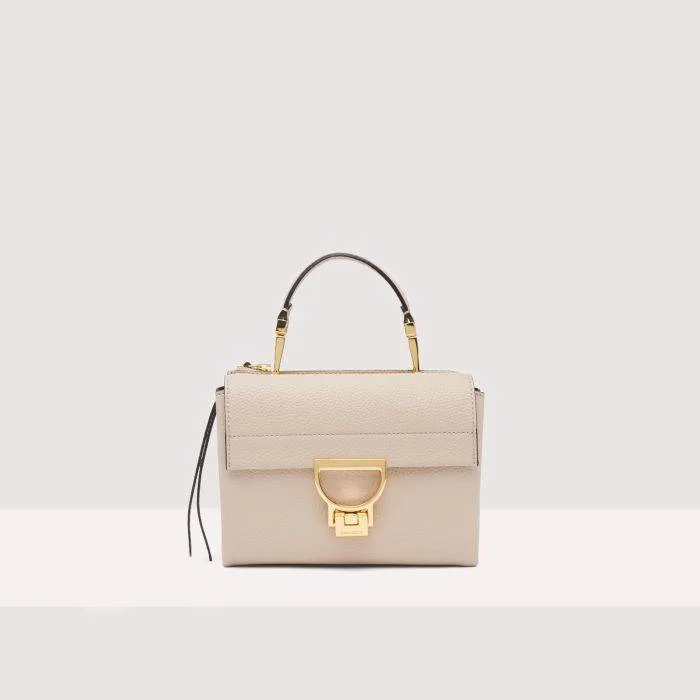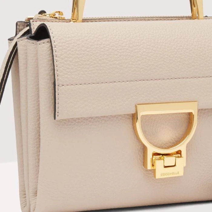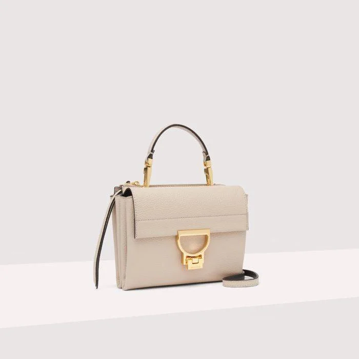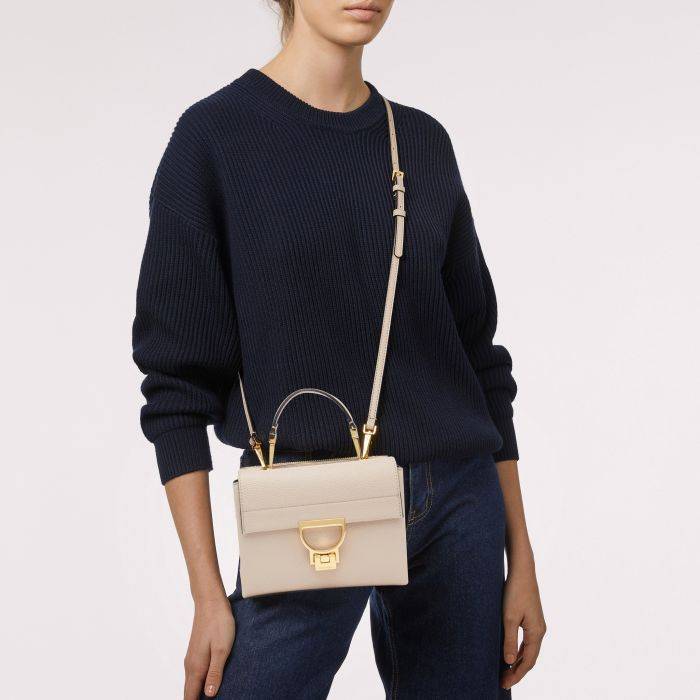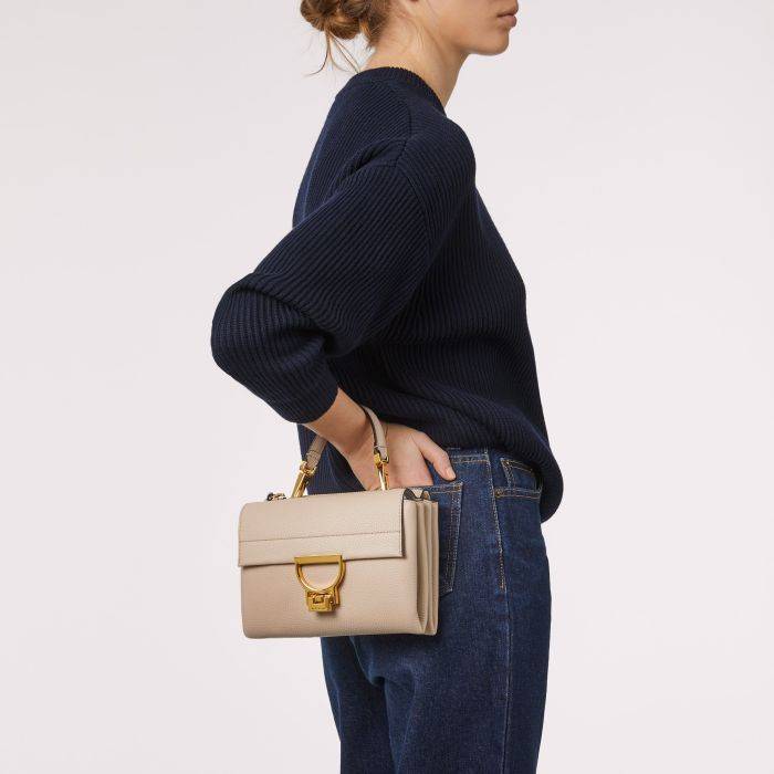 TRACOLLINA COCINELLE “ARLETTIS SMALL”ย presenta due scomparti distinti: uno posteriore con chiusura a zip e uno anteriore con l’iconica chiusura in metallo. Estremamente versatile per un utilizzo quotidiano, offre la possibilitร di essere portata a mano grazie al manico rimovibile, o come borsa a tracolla o a spalla, grazie alla tracolla regolabile.