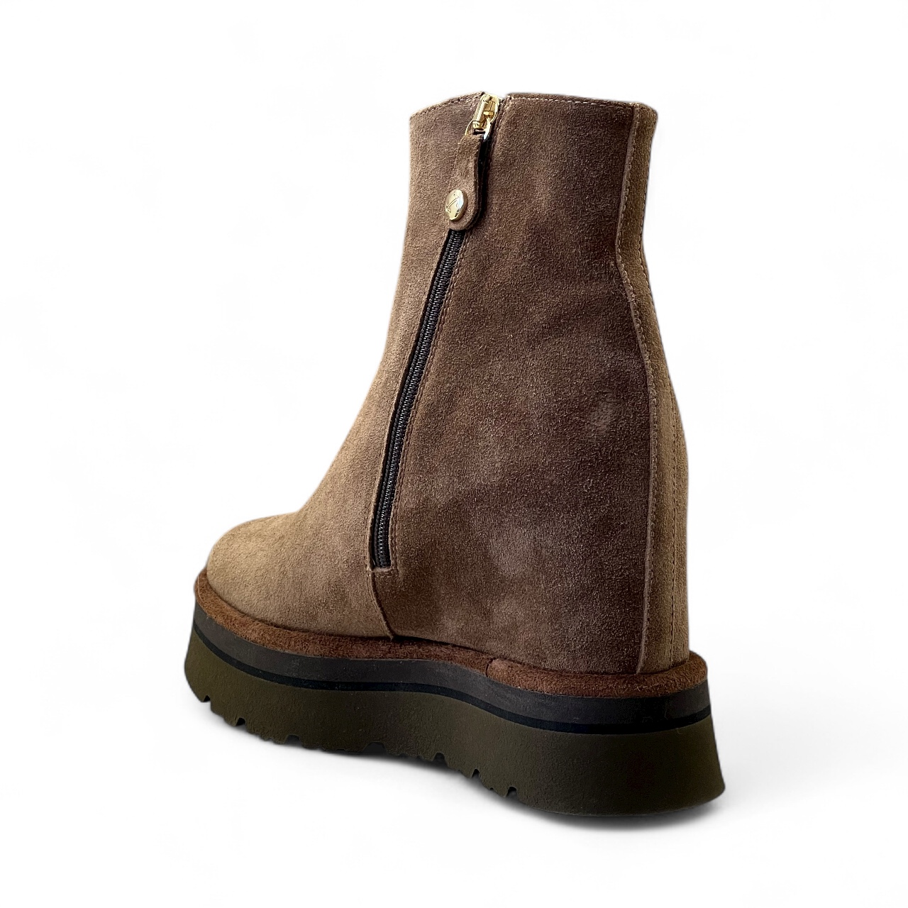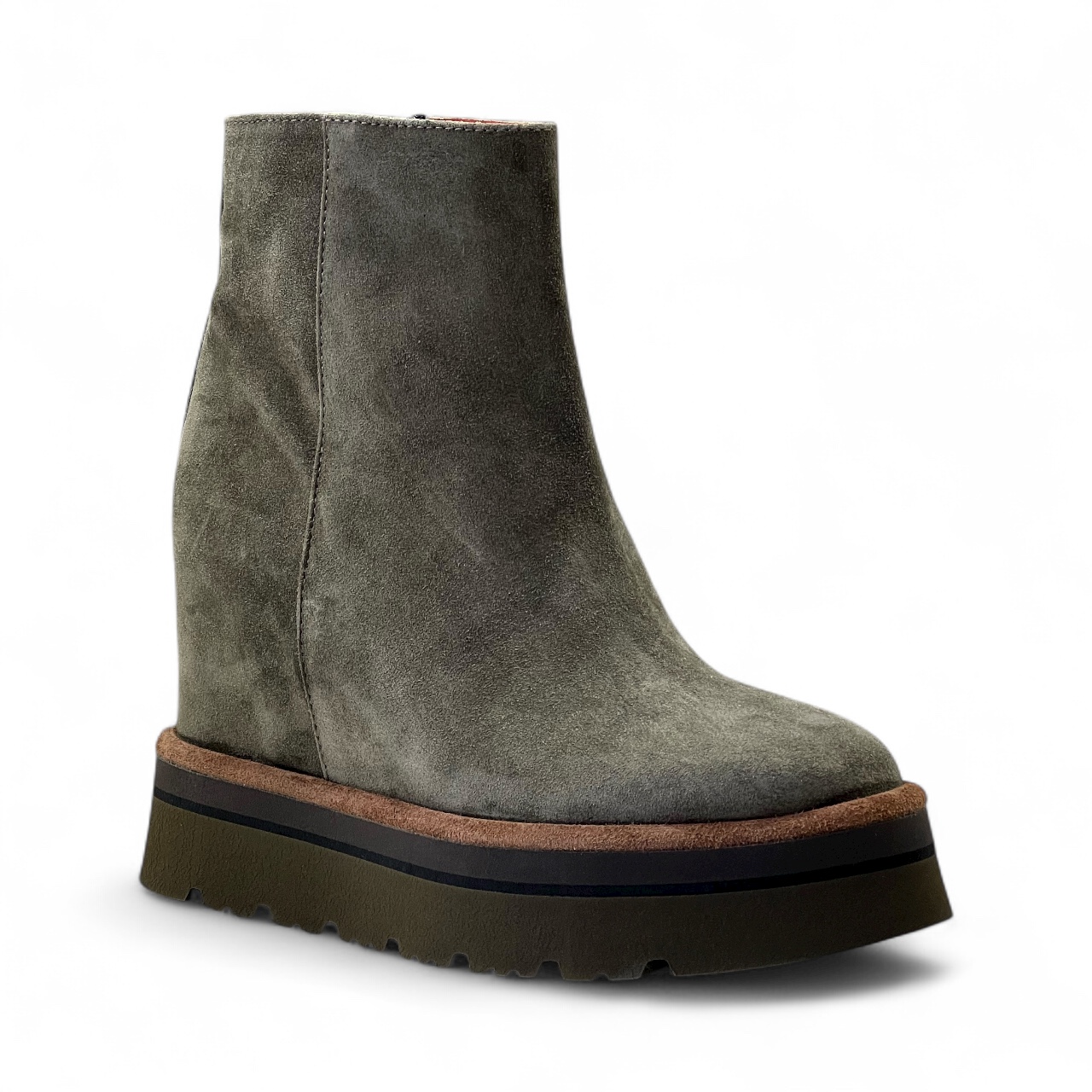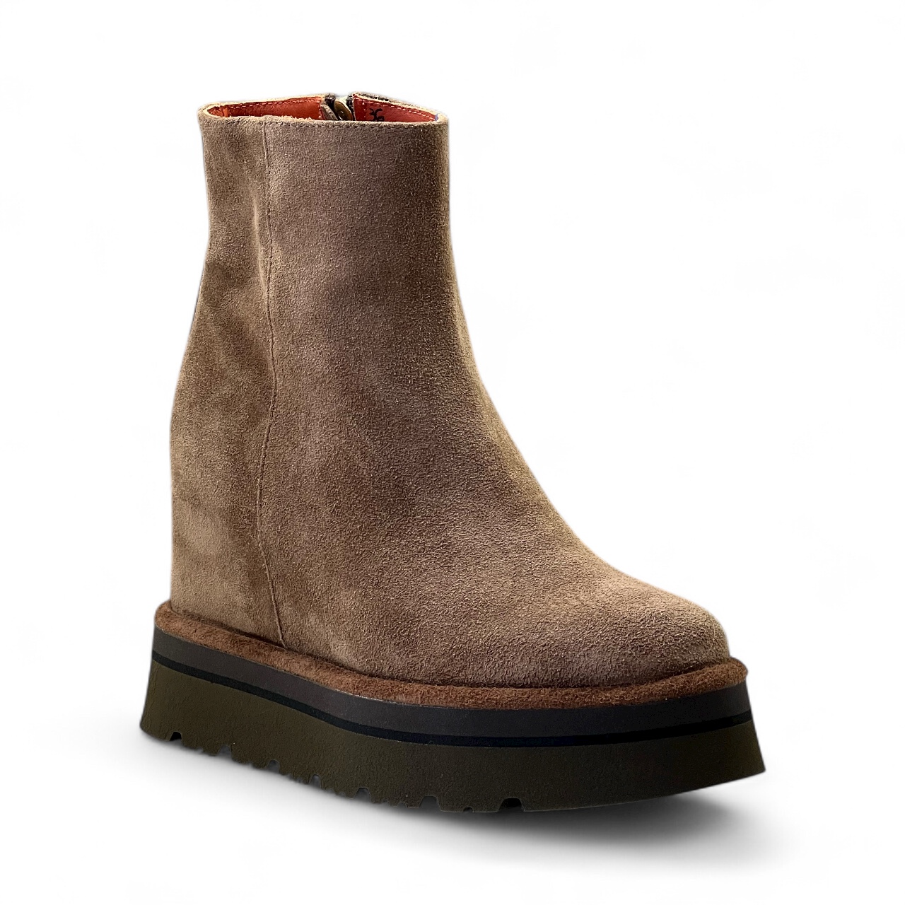 Tronchetto VIA ROMA 1 in camoscio sensory Realizzato artigianalmente in morbido camoscio idrorepellente Zeppa interna di 7 cm Suola in gomma di 4 cm Guardolo in cuoio Zip laterale per una calzata piรน comoda Tomaia 100% pelle Suola 100% gomma Made in Italy