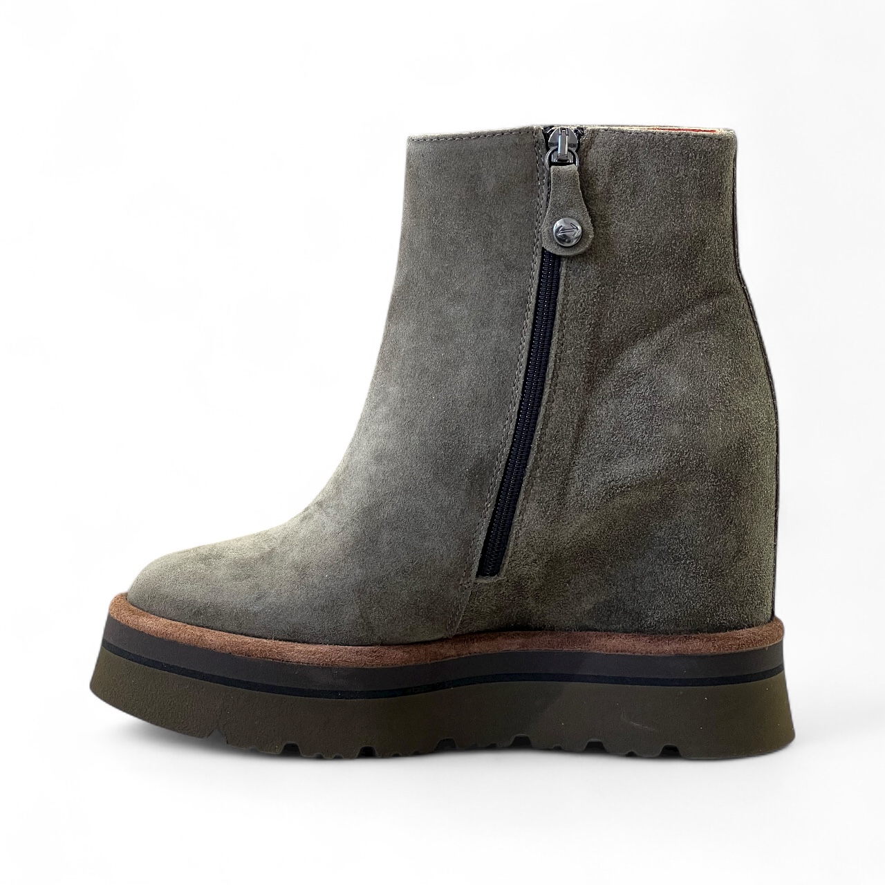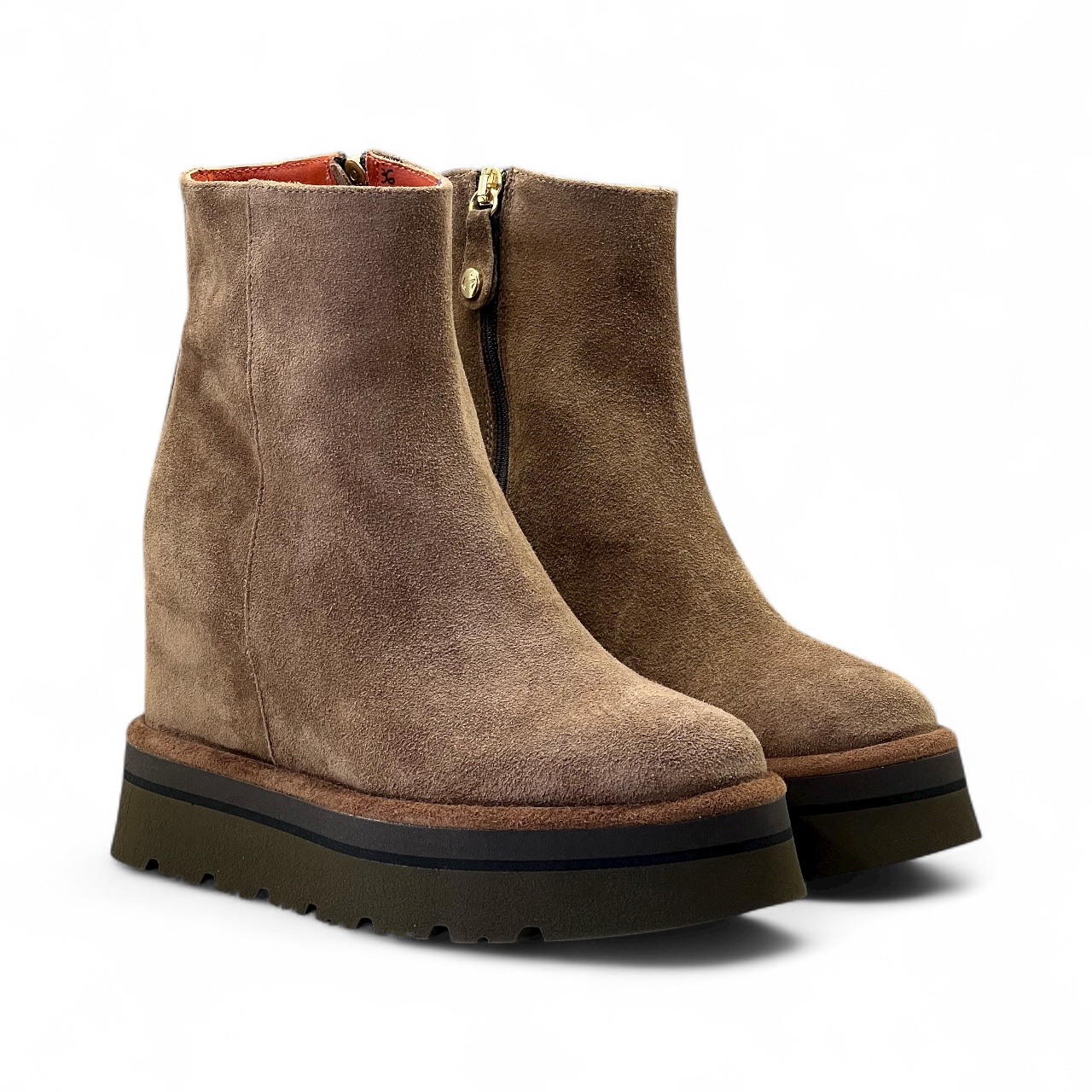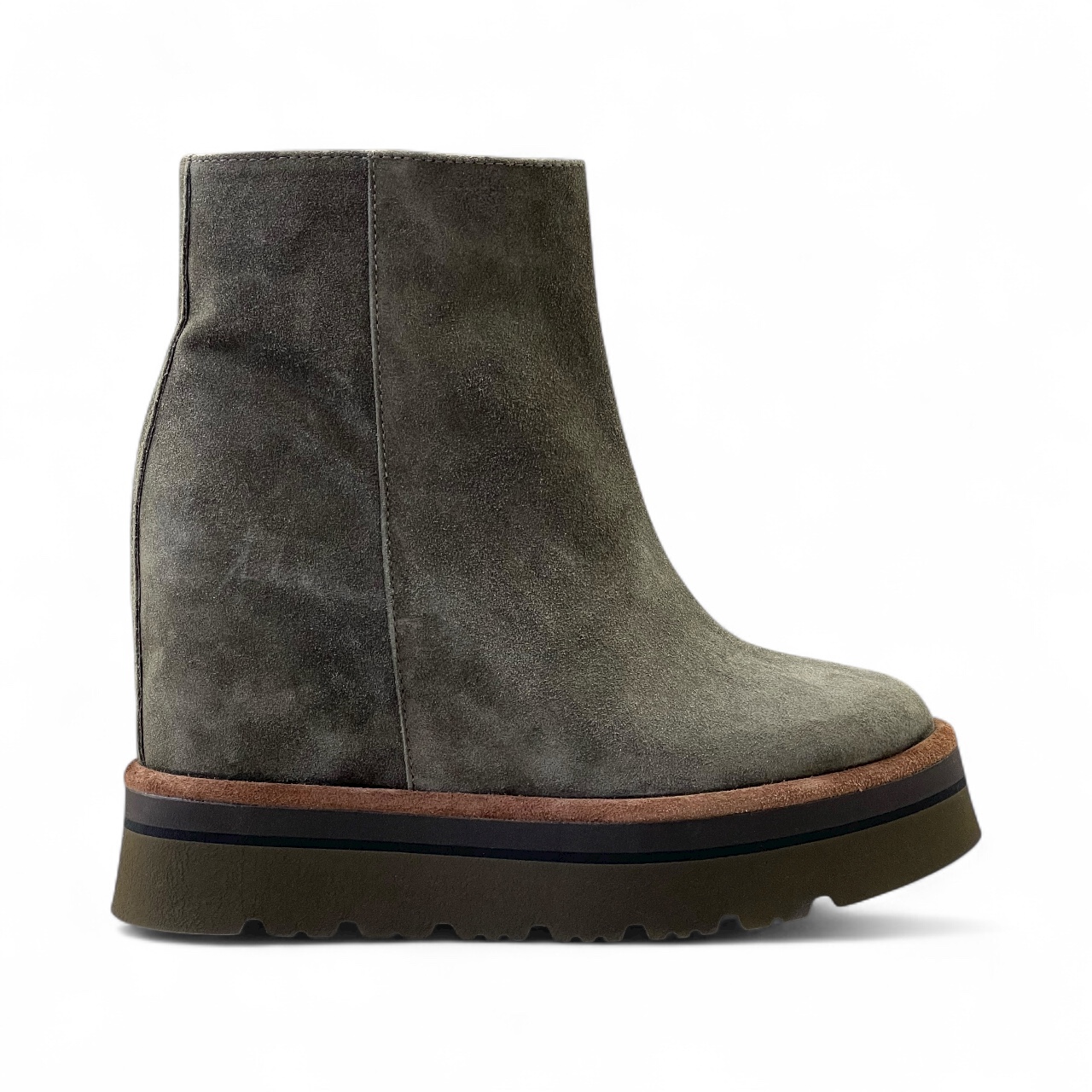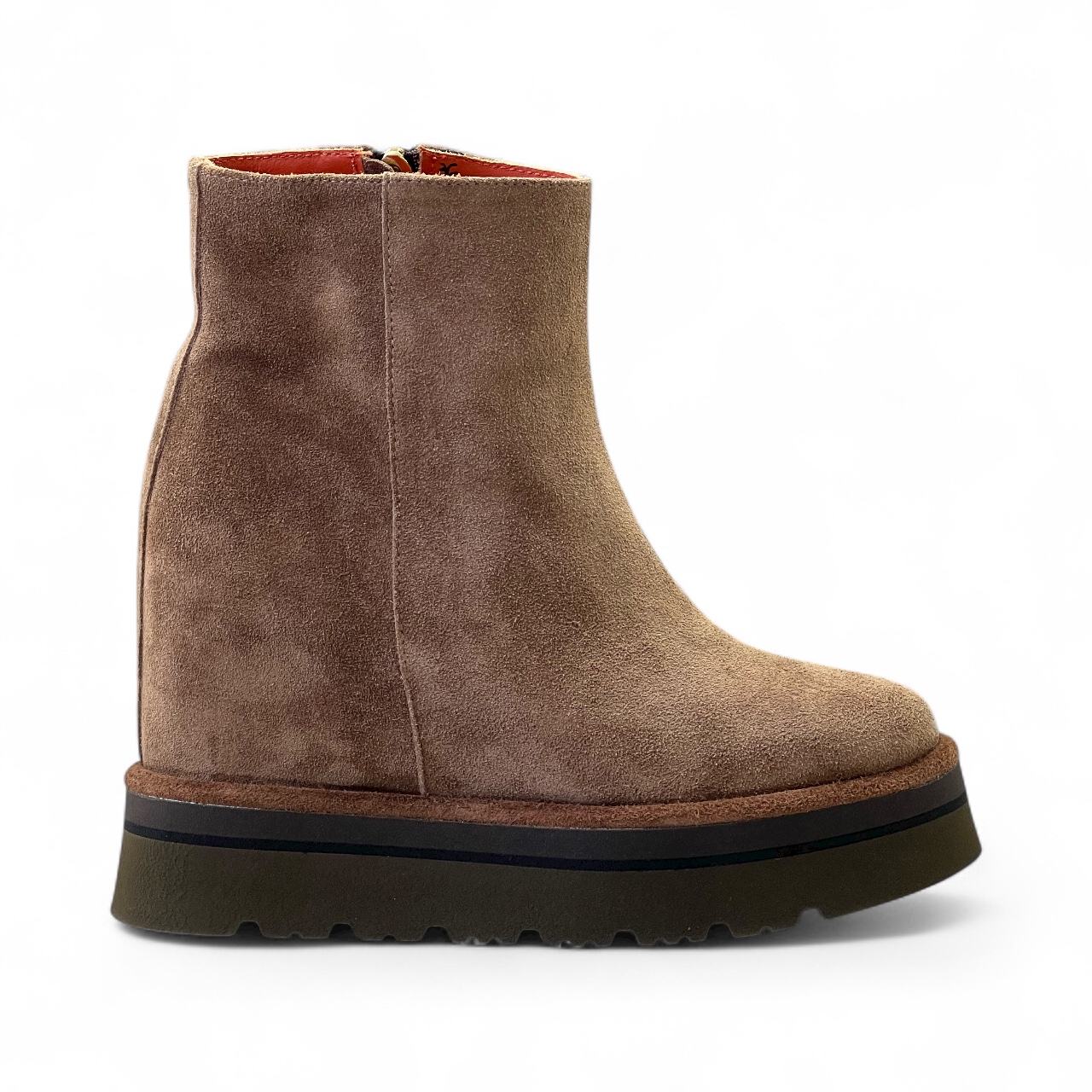 Tronchetto VIA ROMA 1 in camoscio sensory Realizzato artigianalmente in morbido camoscio idrorepellente Zeppa interna di 7 cm Suola in gomma di 4 cm Guardolo in cuoio Zip laterale per una calzata piรน comoda Tomaia 100% pelle Suola 100% gomma Made in Italy