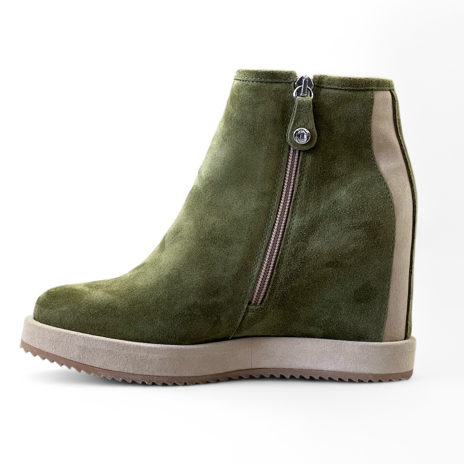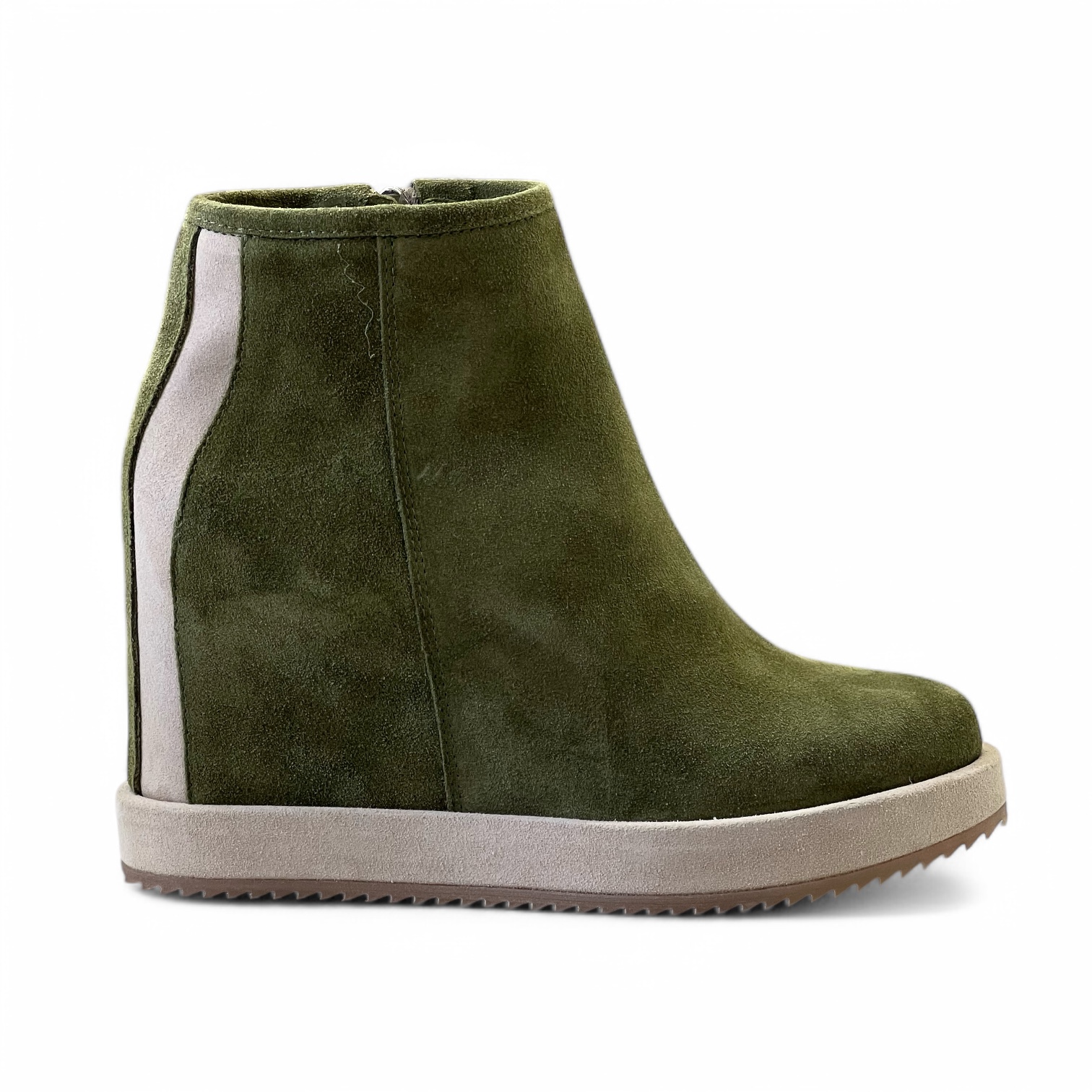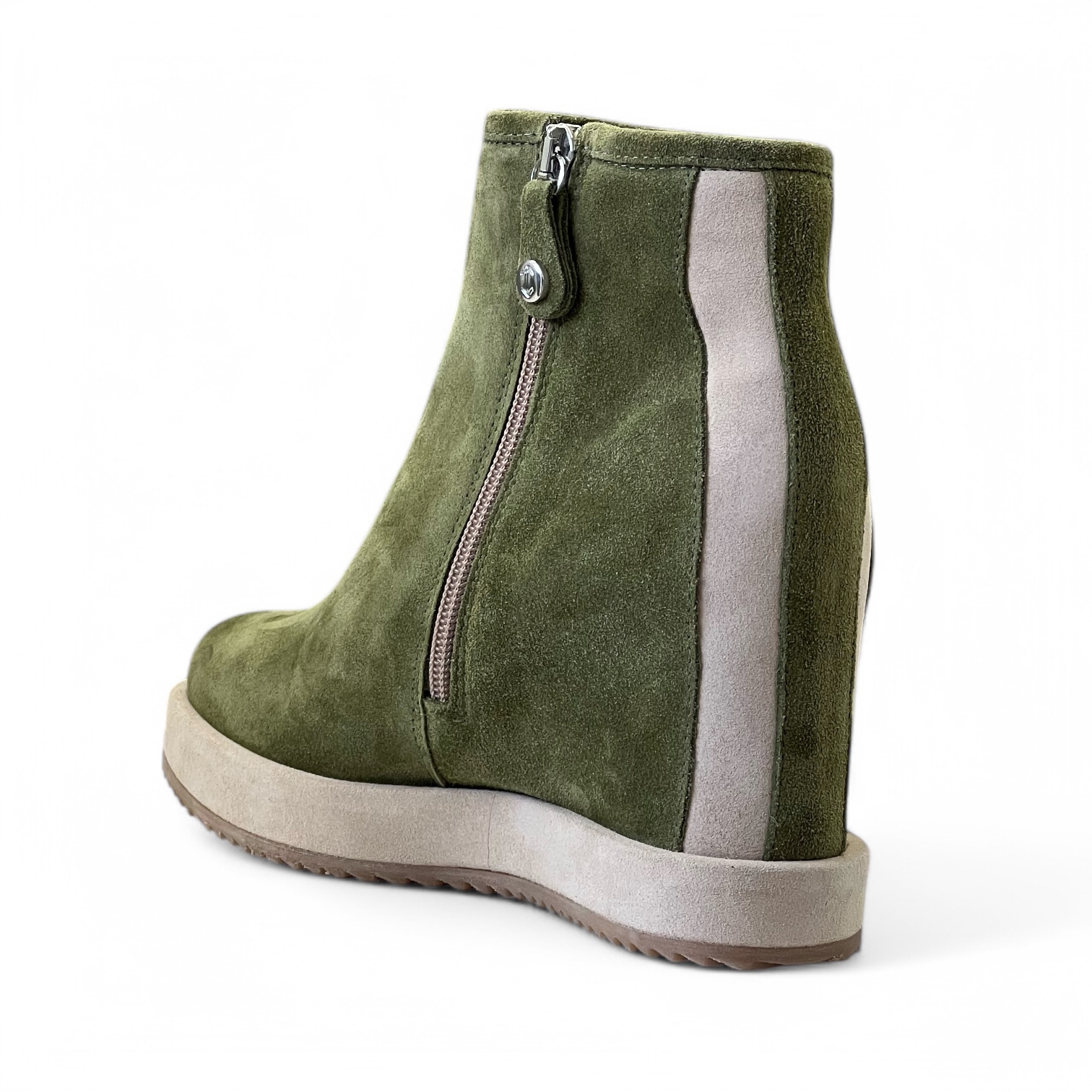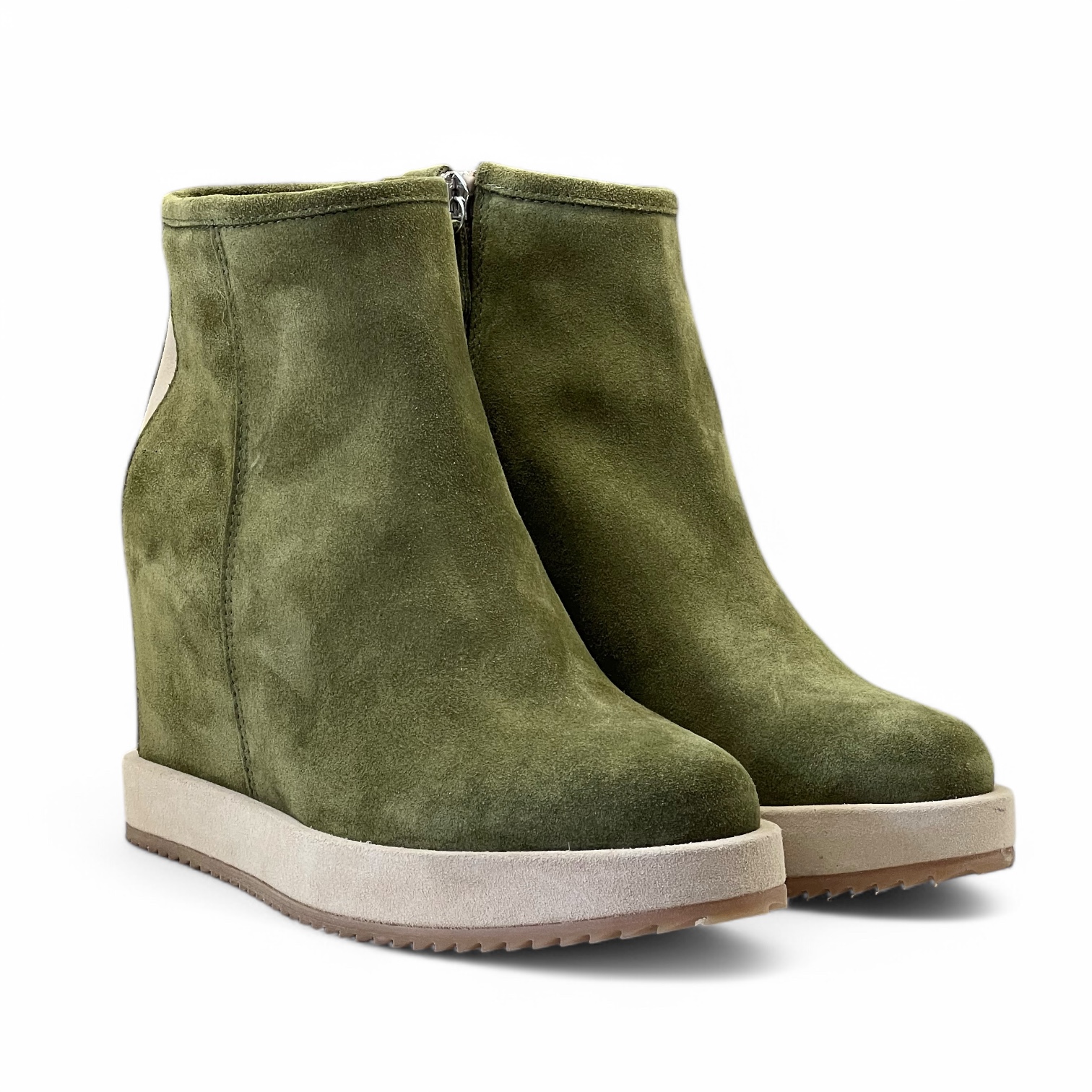 Tronchetto Via Roma Realizzato artigianalmente in morbido camoscio idrorepellente Zeppa interna di 7 cm Suola in gomma di 4 cm Guardolo in camoscio idrorepellente Zip laterale per una calzata piรน comoda Tomaia 100% pelle Suola 100% gomma
