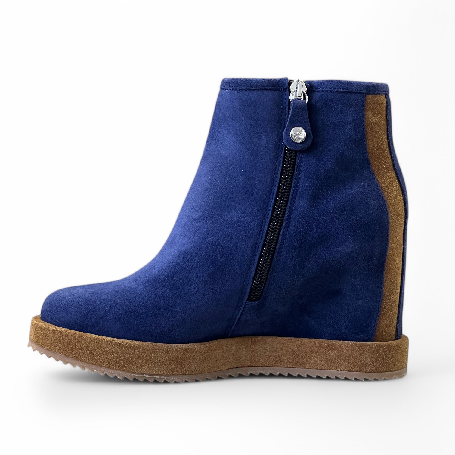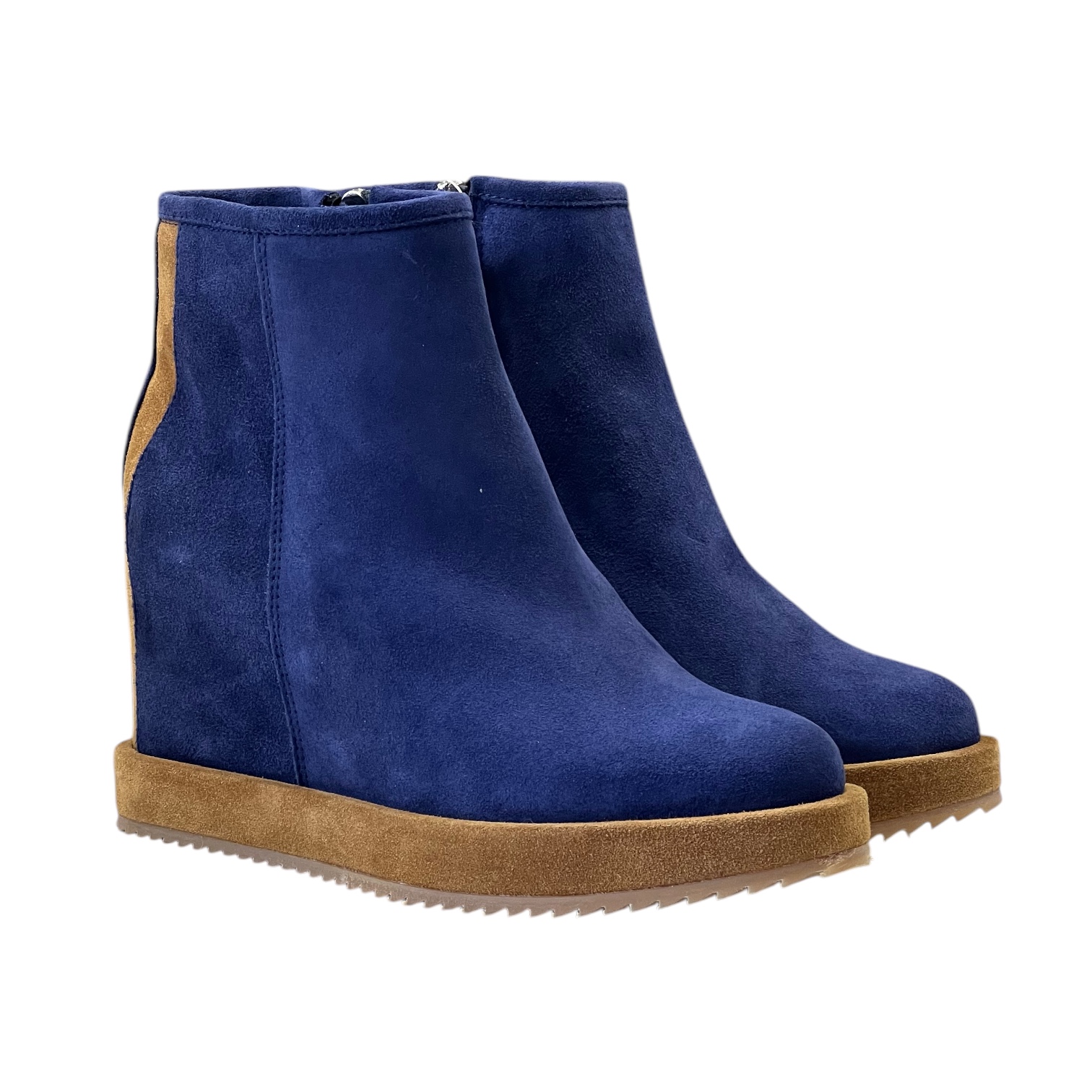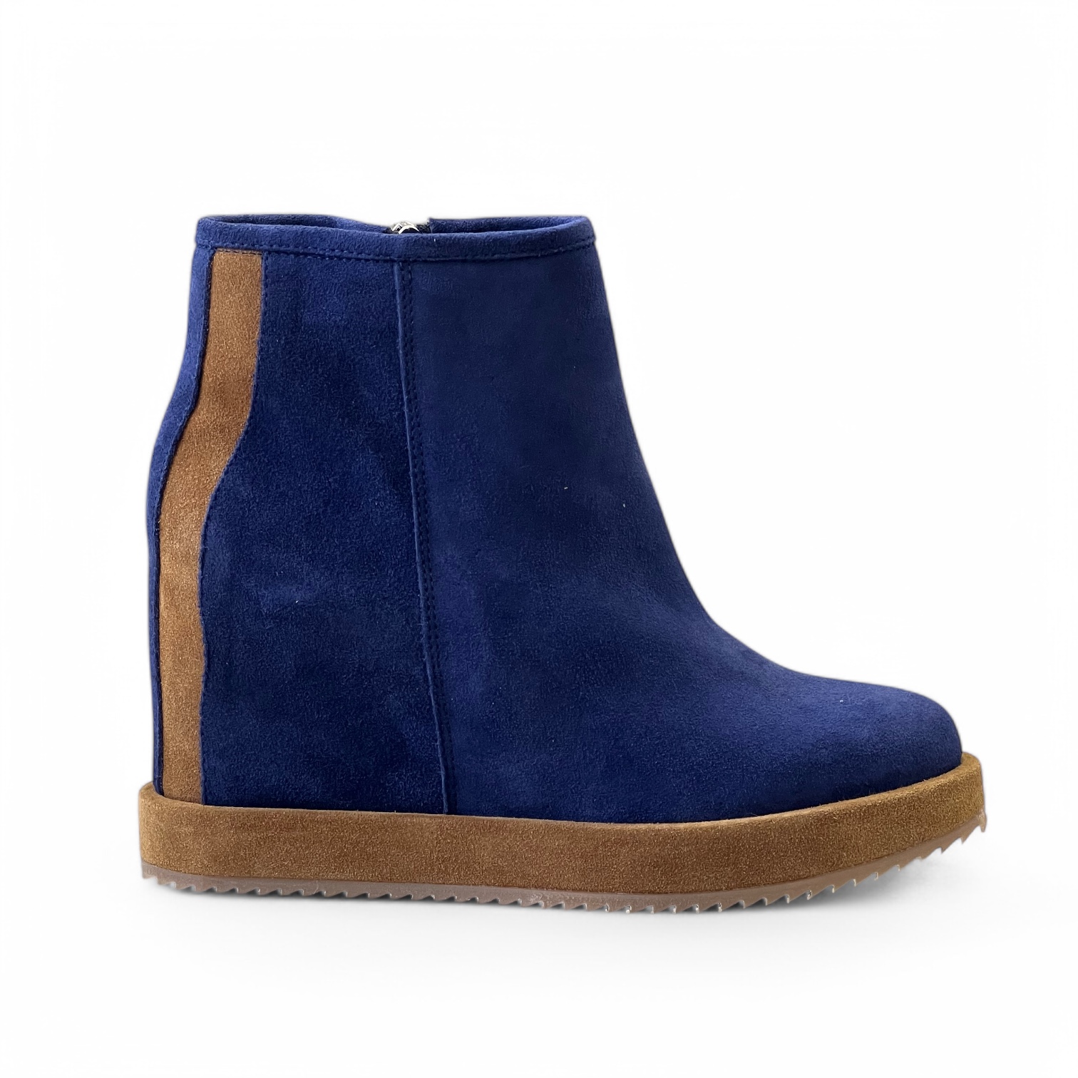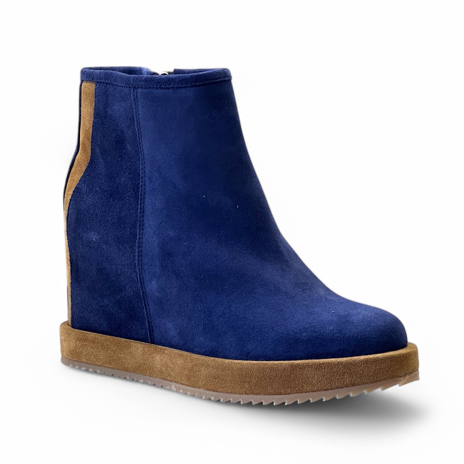Tronchetto Via Roma Realizzato artigianalmente in morbido camoscio idrorepellente Zeppa interna di 7 cm Suola in gomma di 4 cm Guardolo in camoscio idrorepellente Zip laterale per una calzata piรน comoda Tomaia 100% pelle Suola 100% gomma