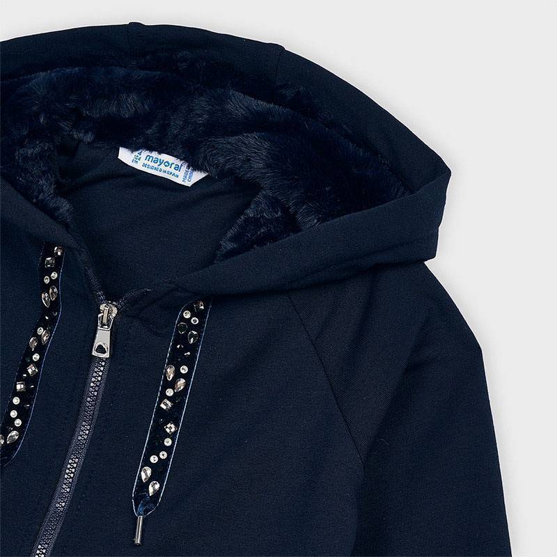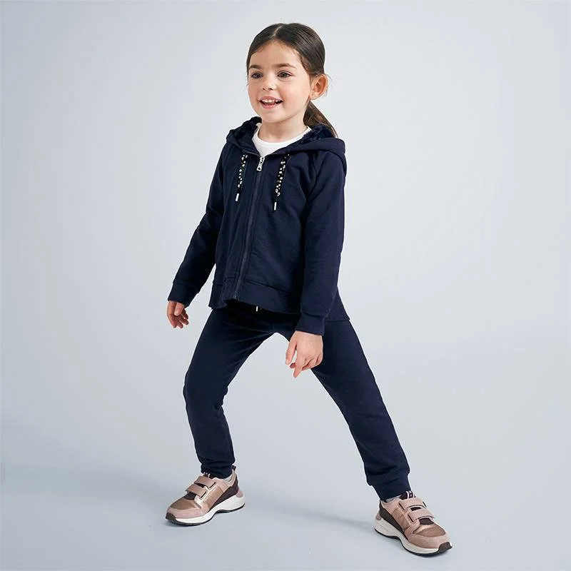 Tuta bimba blu in cotone elasticizzato composta da felpa con cappuccio con pellicciotto sintetico all’interno e chiusura con cerniera. Pantalone con elastico in vita e polsini alle caviglie.