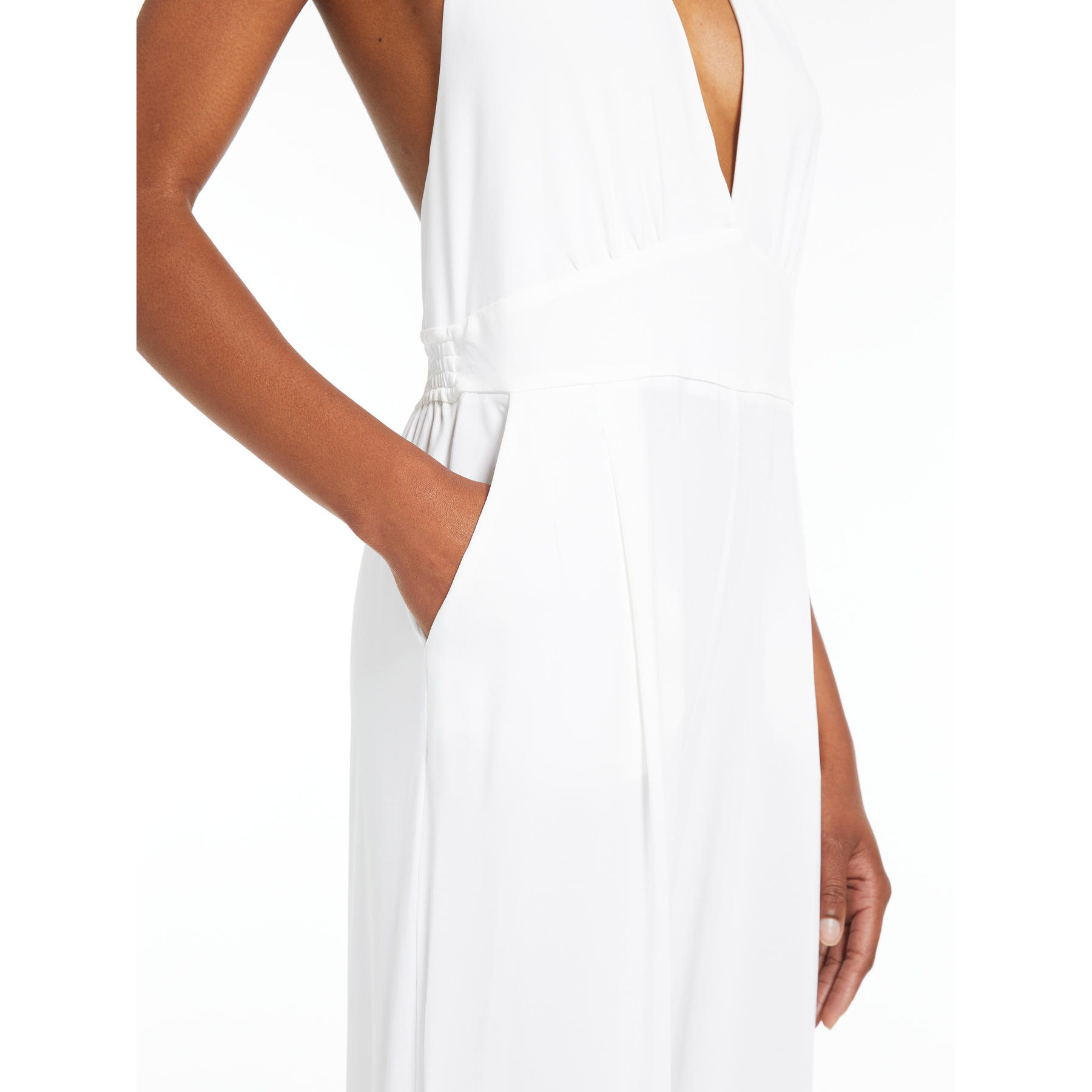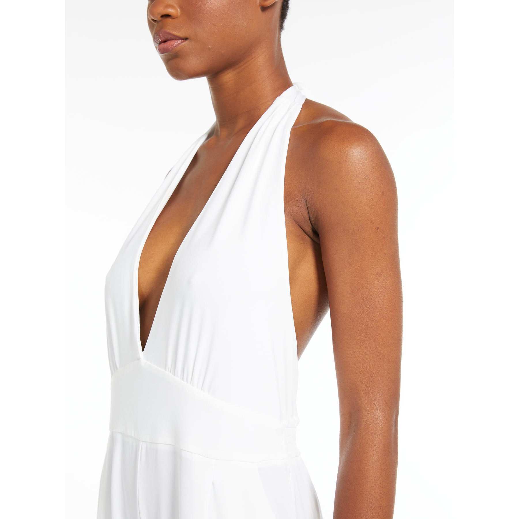 Tuta smanicata in morbido jersey di viscosa stretch Caratterizzata da corpetto aderente con profondo scollo a V, motivo drappeggiato che incornicia il dรฉcolletรฉ e schiena scoperta La silhouette รจ completata da pantalone fluido con linea ampia sulla gamba e tasche a sbieco sui fianchi Lunghezza 150 cm Composizione: 95% Viscosa, 5% Elastan