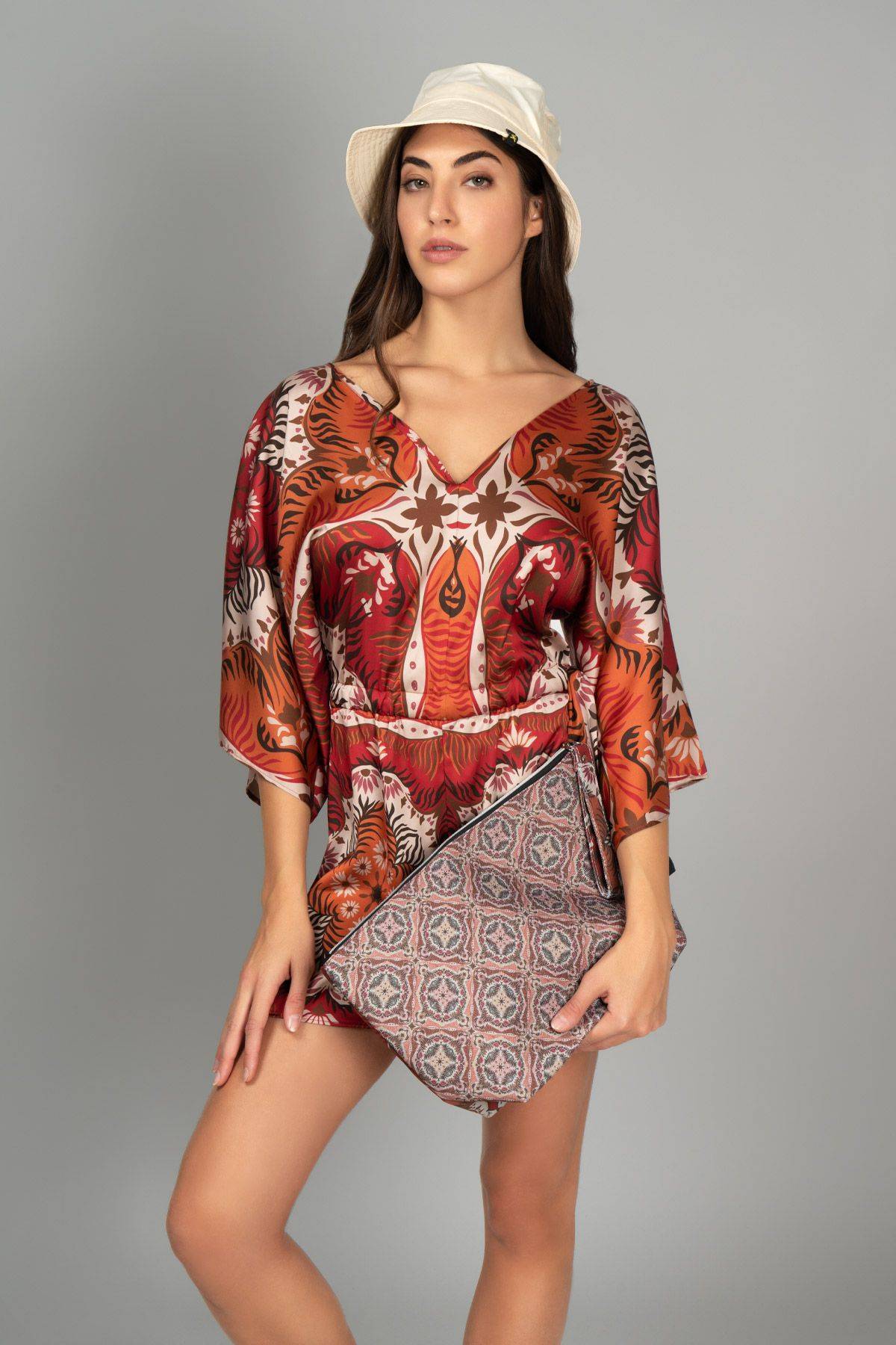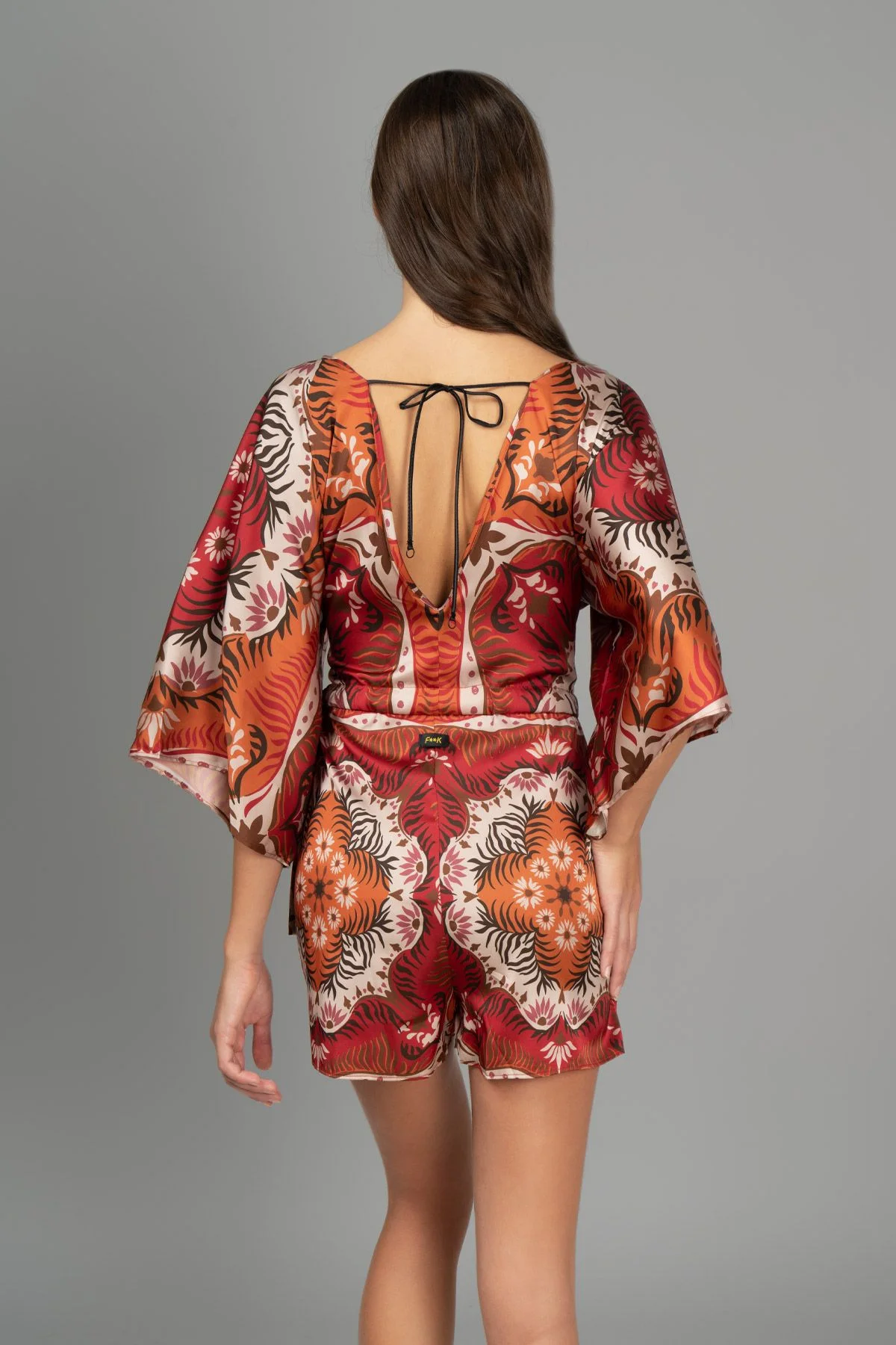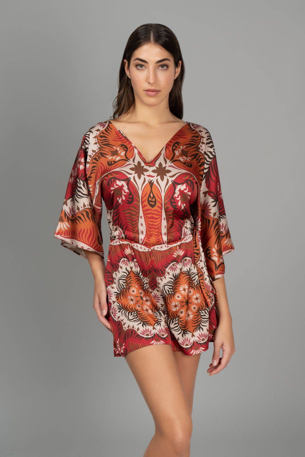 La tutina corta F**k fantasia toni del rosso รจ realizzata in tessuto raso con manica 3/4 e coulisse regolabile in vita.