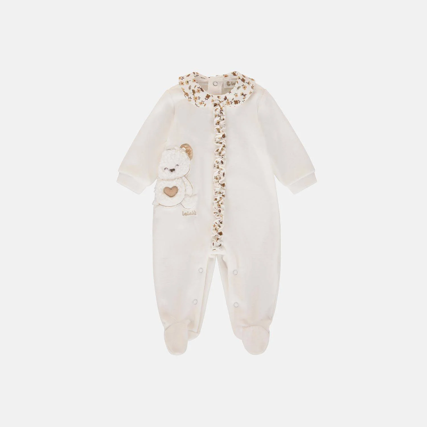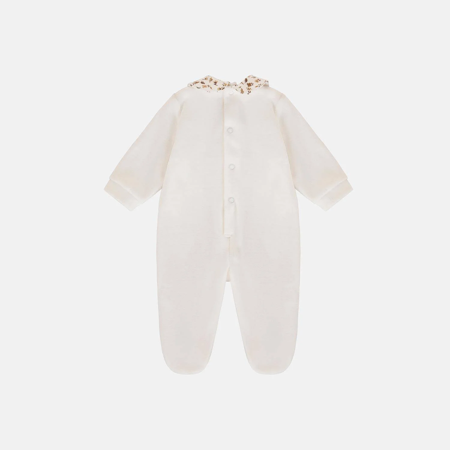Tutina ciniglia neonata con colletto. Monocolore bianca con ricamato un tenero orso. Delicata ed elegante nella sua semplicitร .