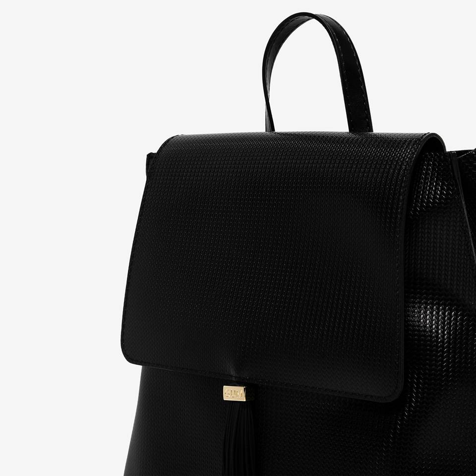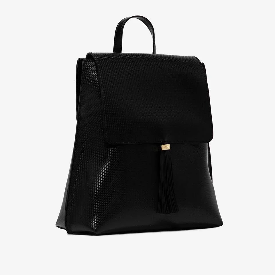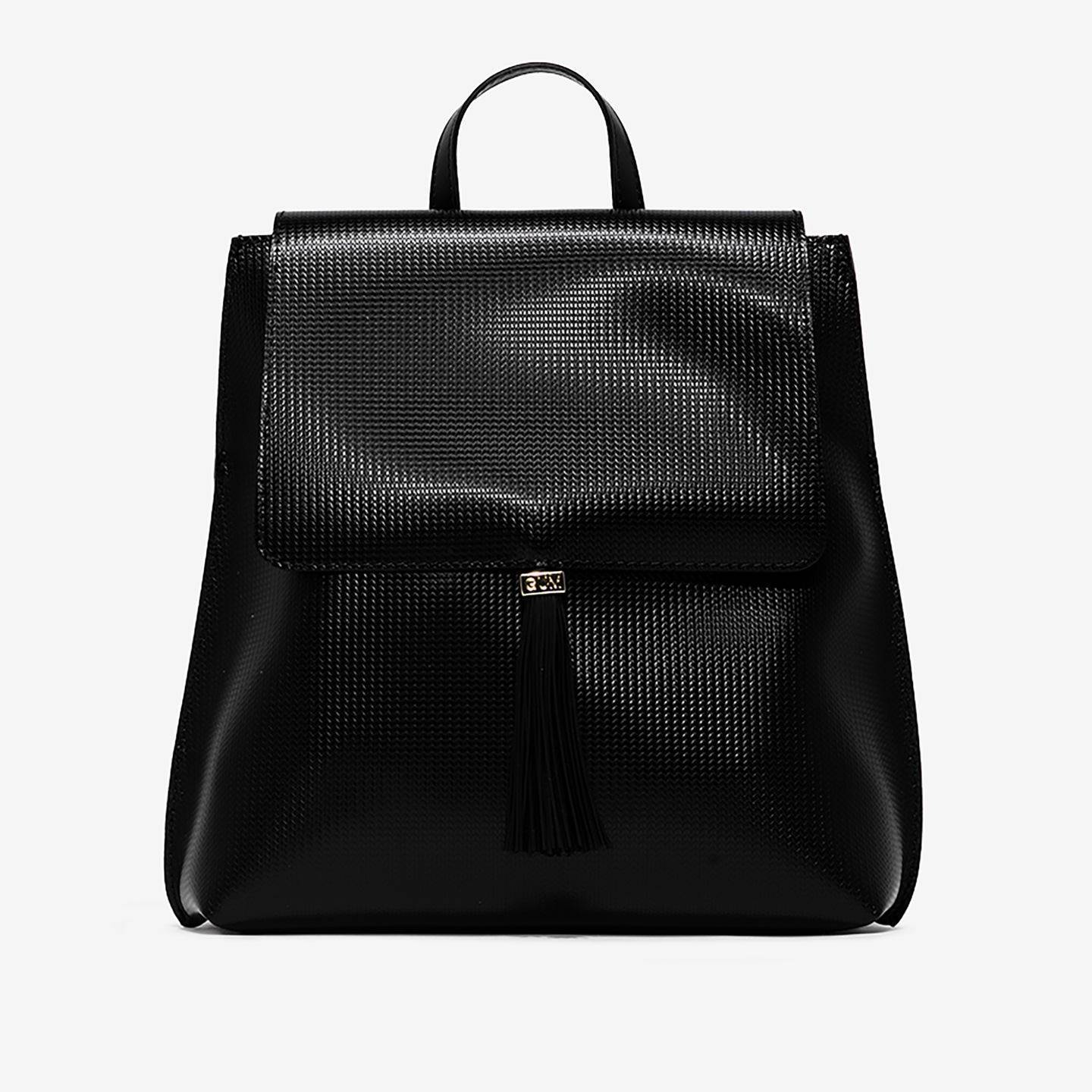 Zaino di manifattura italiana fantasia Tassel in vinile tinta unita con motivo spigato all over. Scomparto principale con patta in tono impreziosita dal dettaglio logato e dalla nappa in tono in silicone.