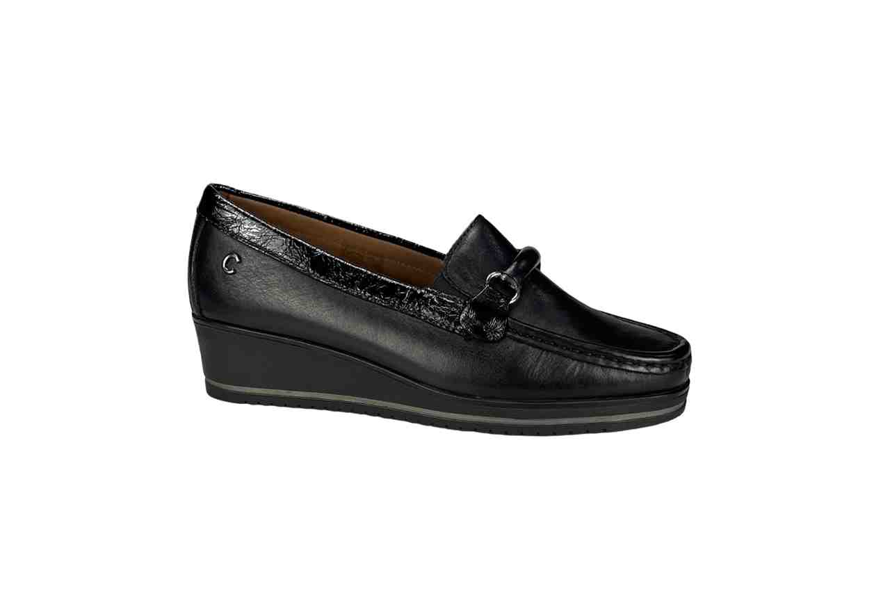 Mocassino in pelle in tinta unita con tacco a zeppa, fibbia in dettaglio.