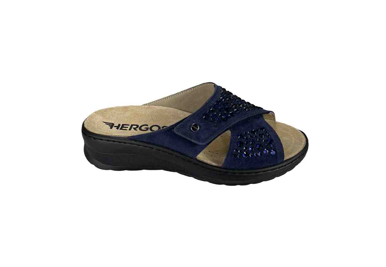 HERGOS Ciabatta a incrocio in pelle scamosciata con strass e velcro di chiusura, tacco a zeppa.