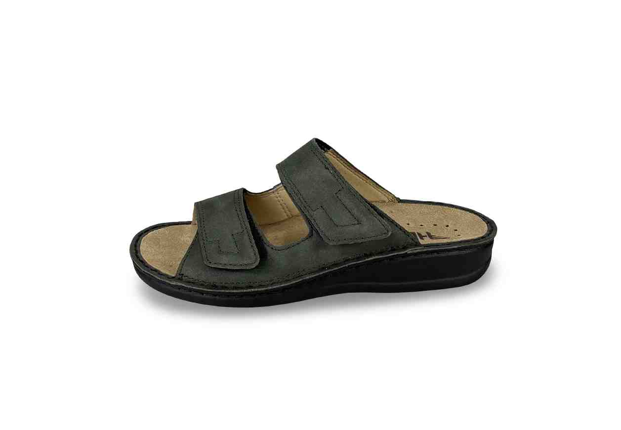 Ciabatta da esterno in 100% pelle con strep in chiusura e alzata di 3,5 cm.
