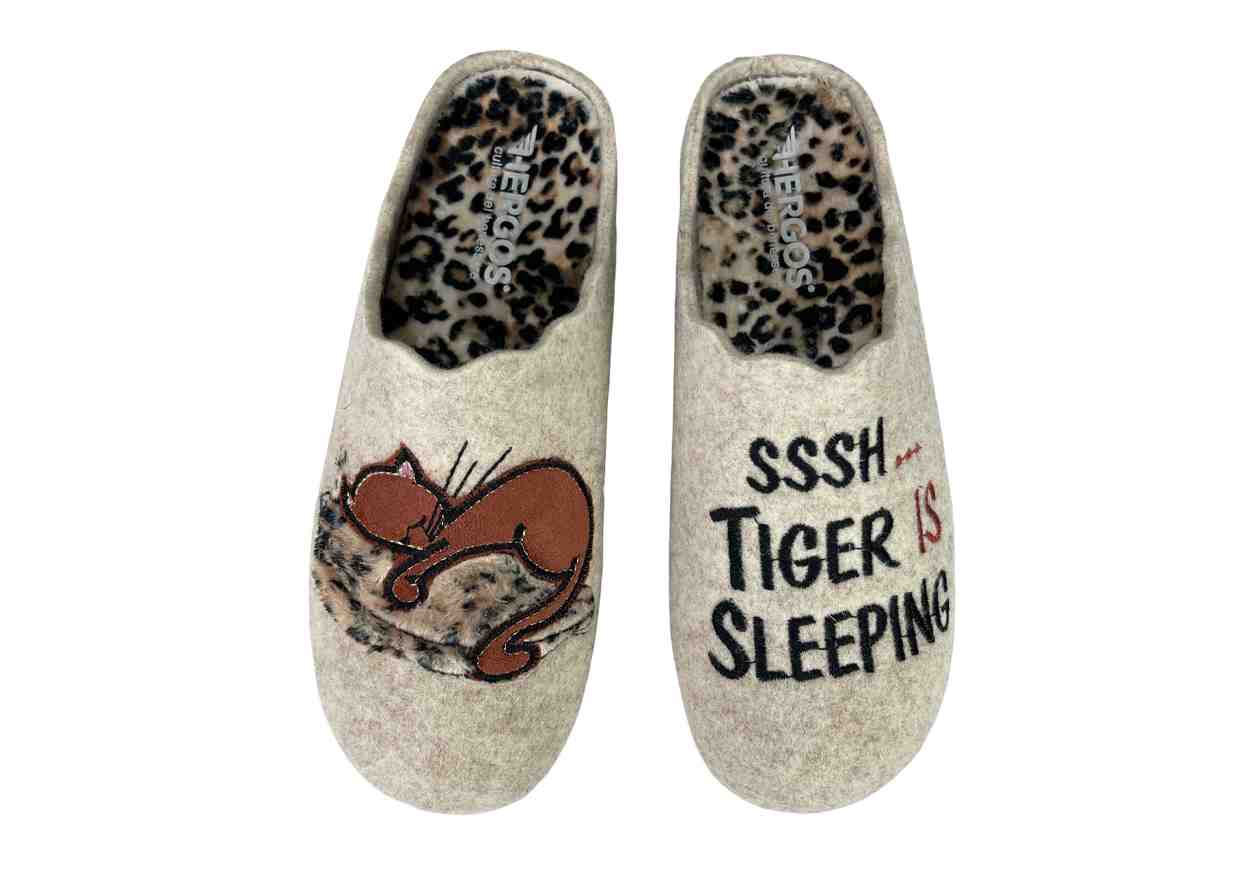 HERGOS Pantofola in feltro con scritte e applicazioni, solletta in fantasia leopardata.