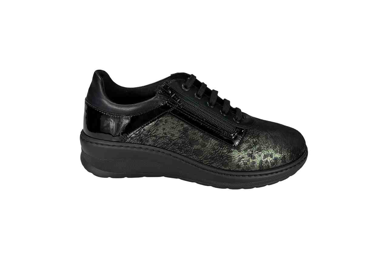 HERGOS Sneakers in pelle con spalmato maculato, zip laterale e lacci frontali di chiusura, tacco a zeppa.
