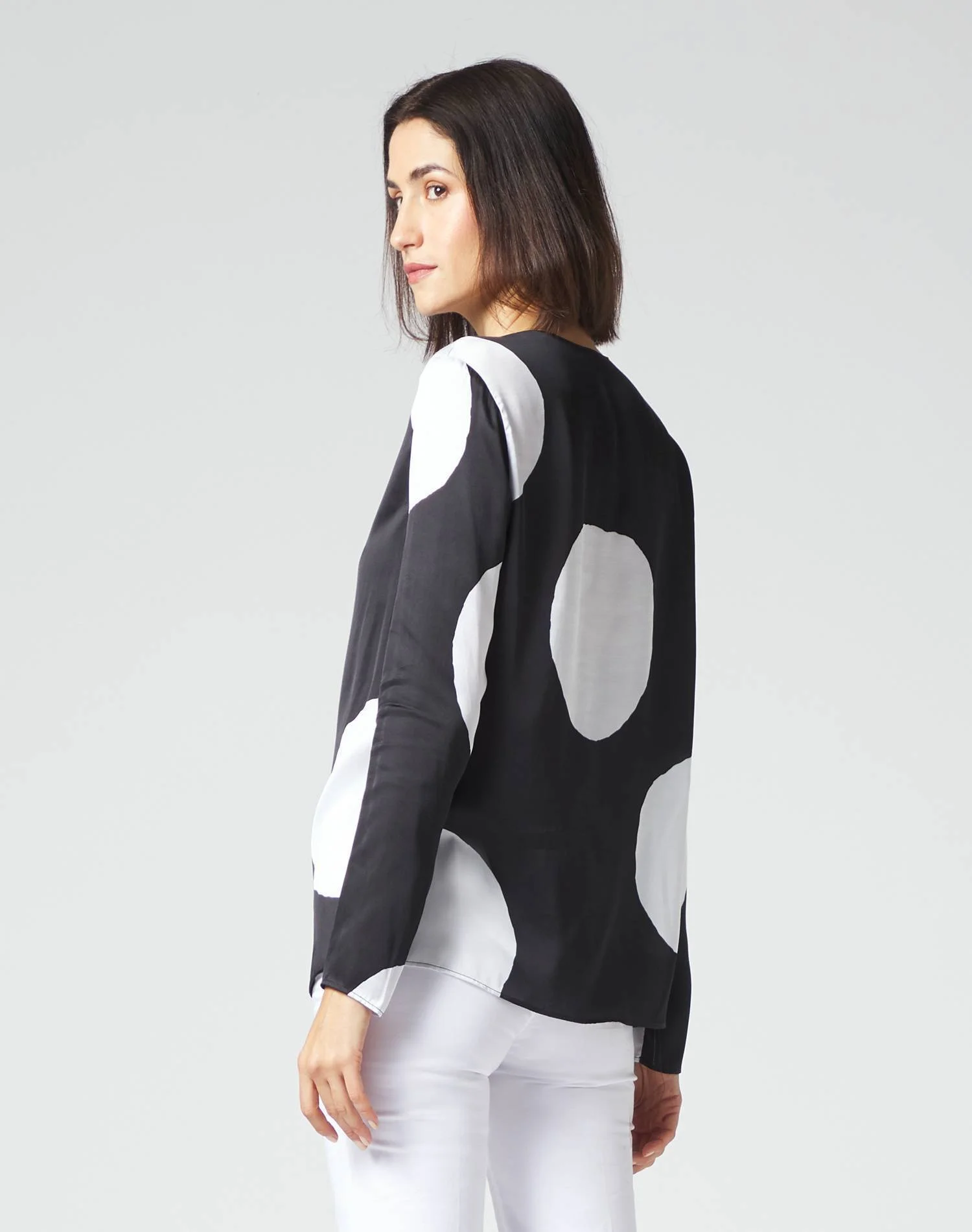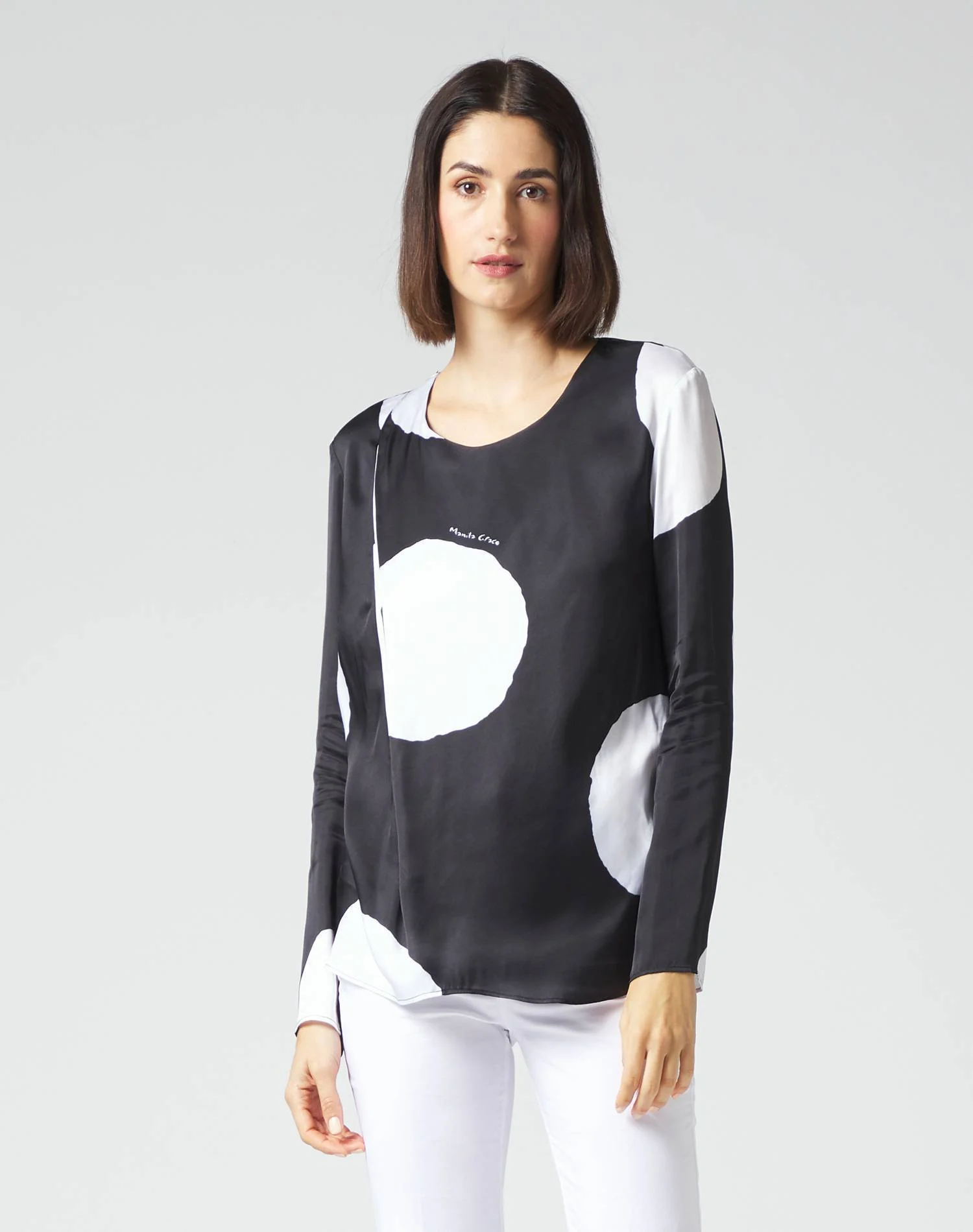 Veste morbidamente la silhouette questa T-shirt di Manila Grace. Confezionato in confortevole jersey di cotone, il modello è valorizzato dalla stampa a macro pois a contrasto, uno dei temi della nuova collezione. Collo a barchetta, maniche corte e fondo asimmetrico completano un capo intramontabile del guardaroba estivo, interpretato dallo stile inconfondibile della maison