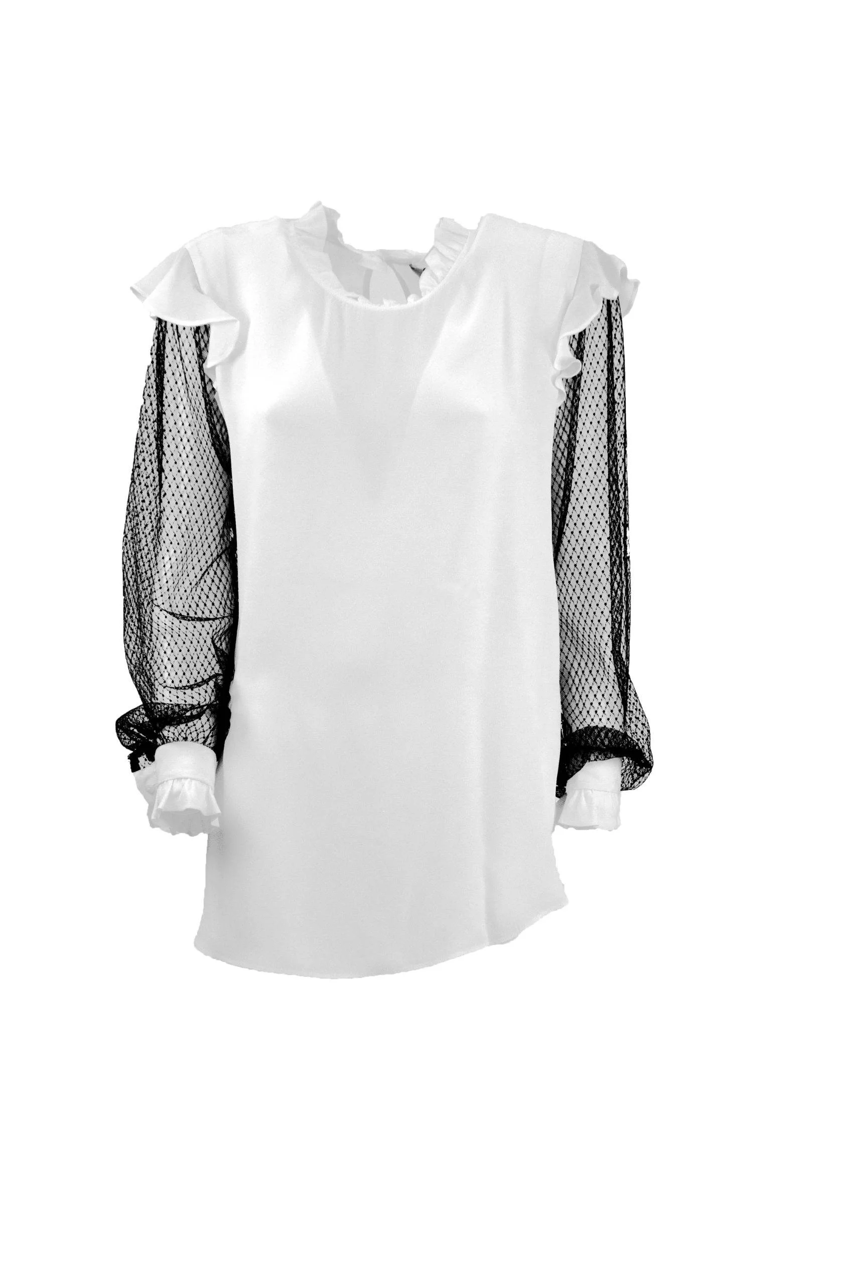 Blusa in crepe e seta bianca e nera, maniche in tulle e volant ai polsi e al collo.