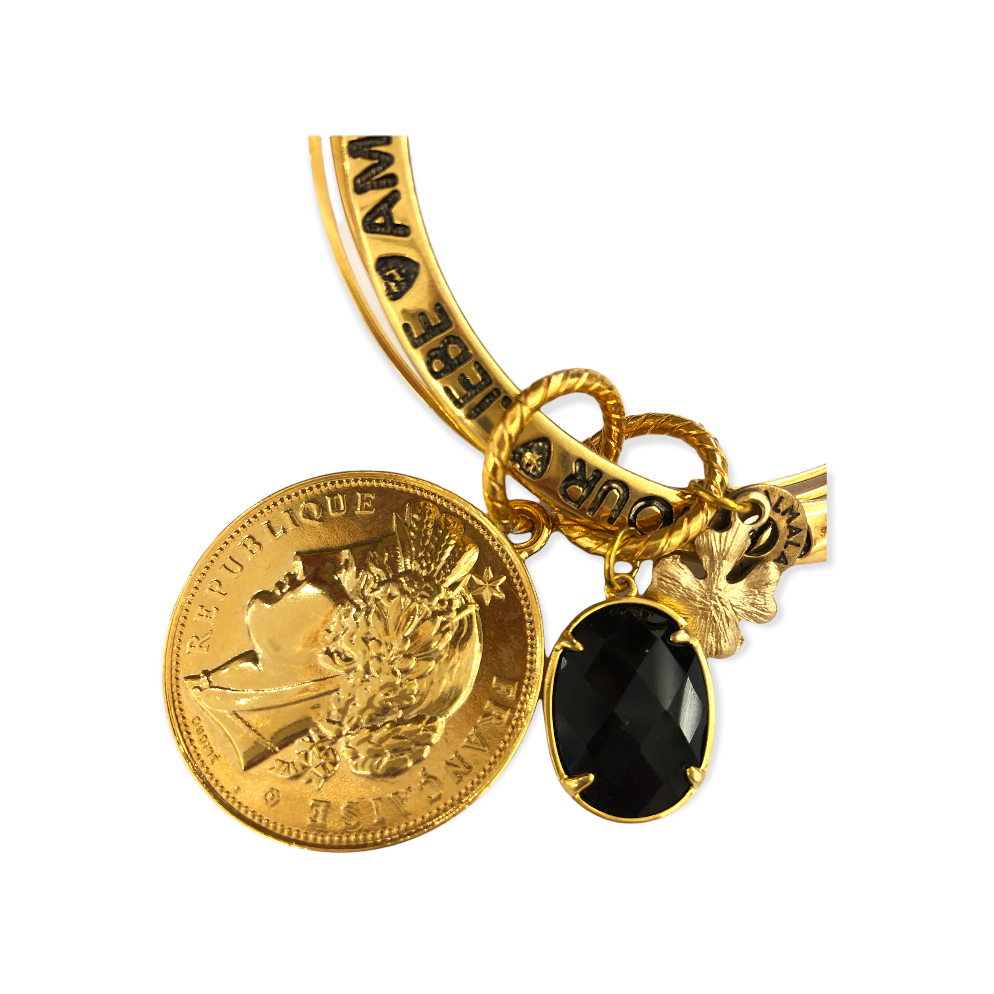 Il bracciale Medal rigido ALMALA, è un bracciale rigido in ottone con scritte incise; arricchito con pendenti a medaglia e quarzi. Ideale per ogni occasione.