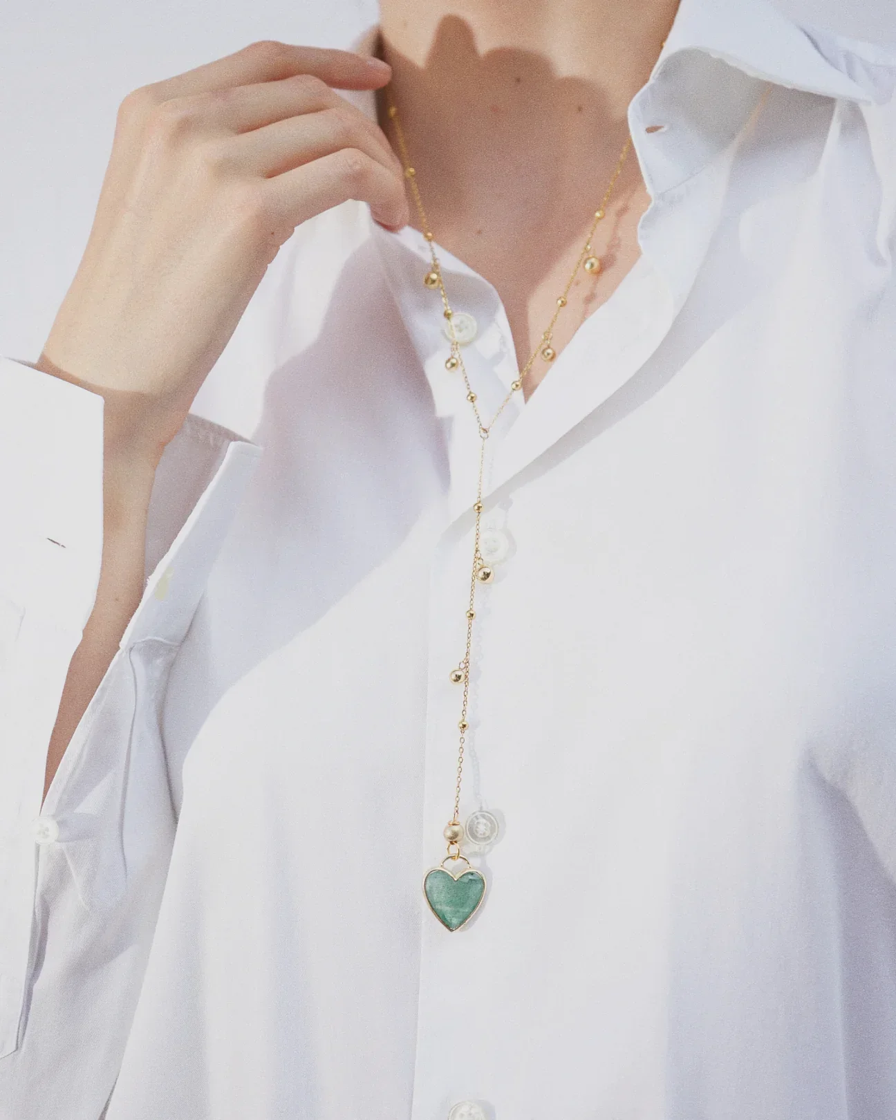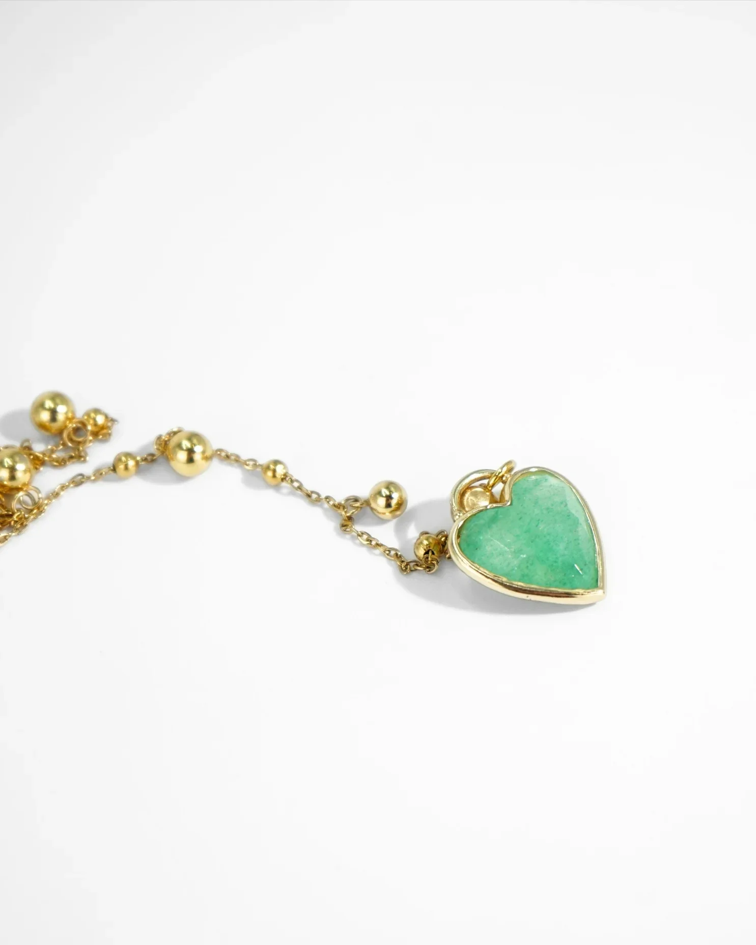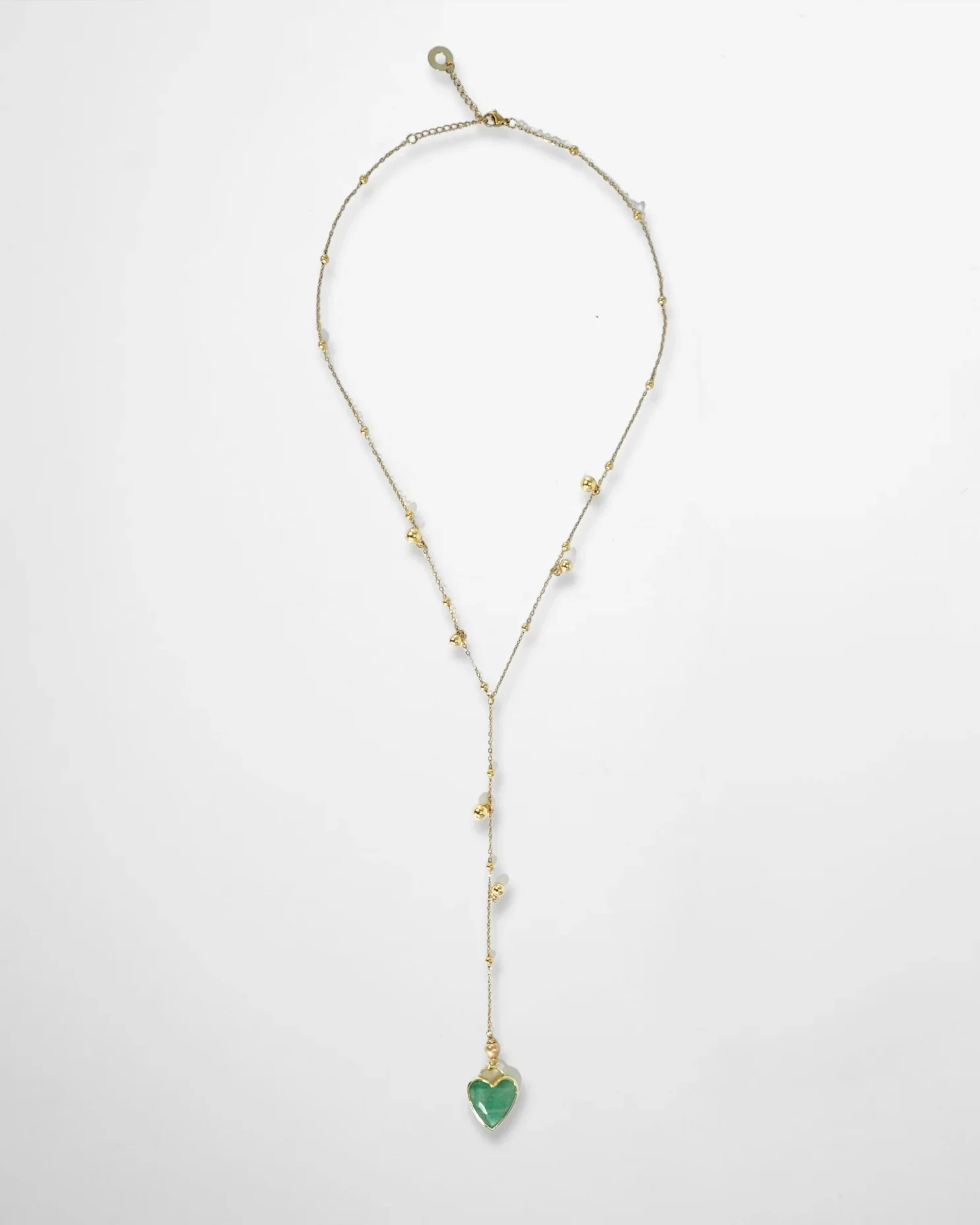 La Collana Cuore ALMALA, è una collana sottile in metallo dorato, composta da piccole perline e arricchita da un pendente a cuore in pietra colorata.