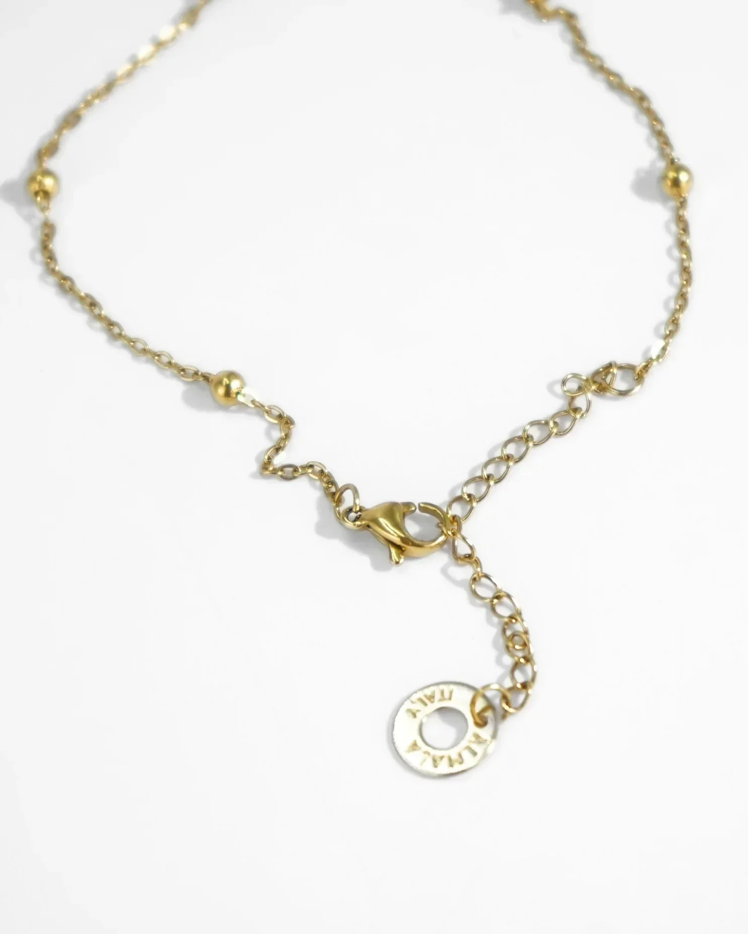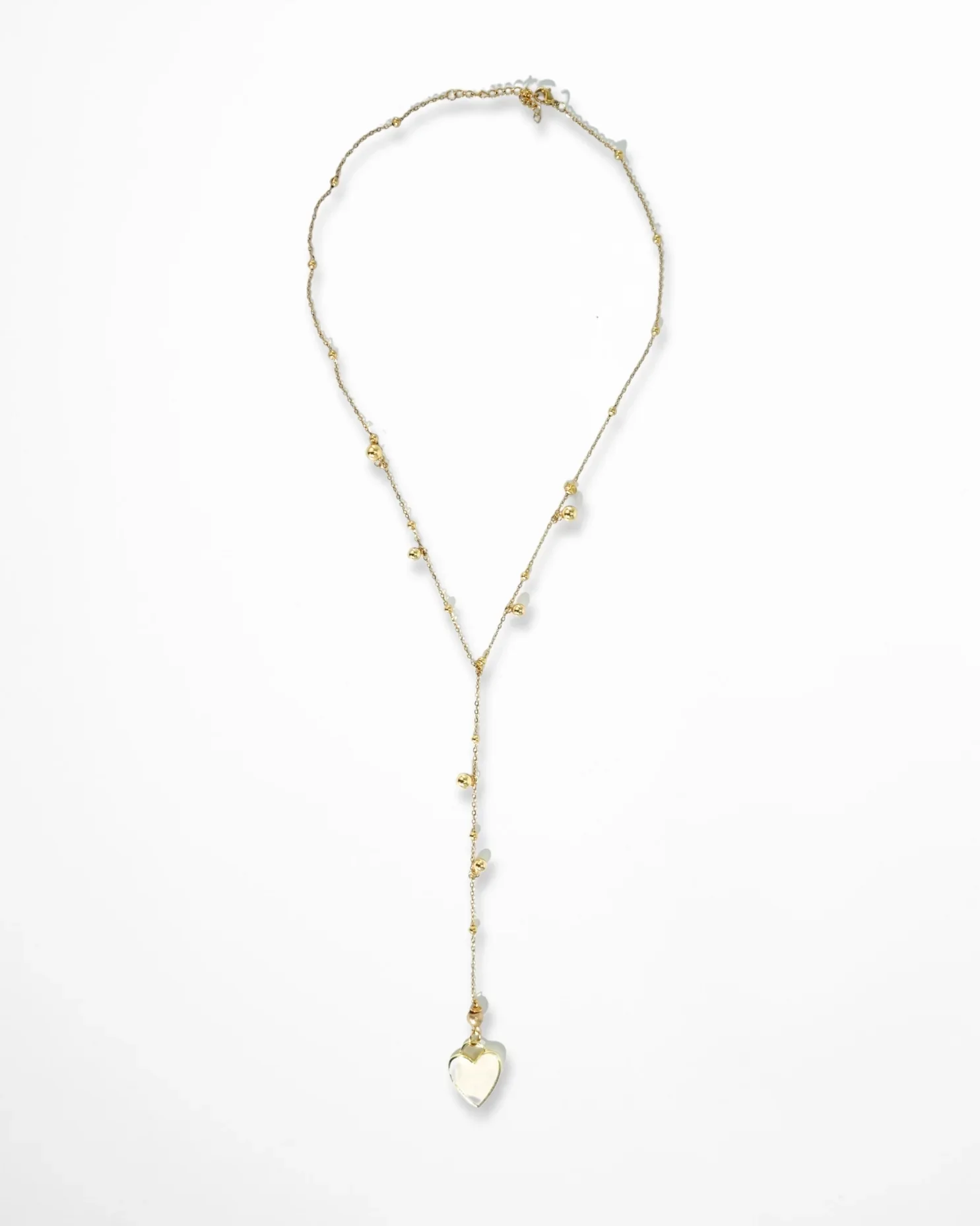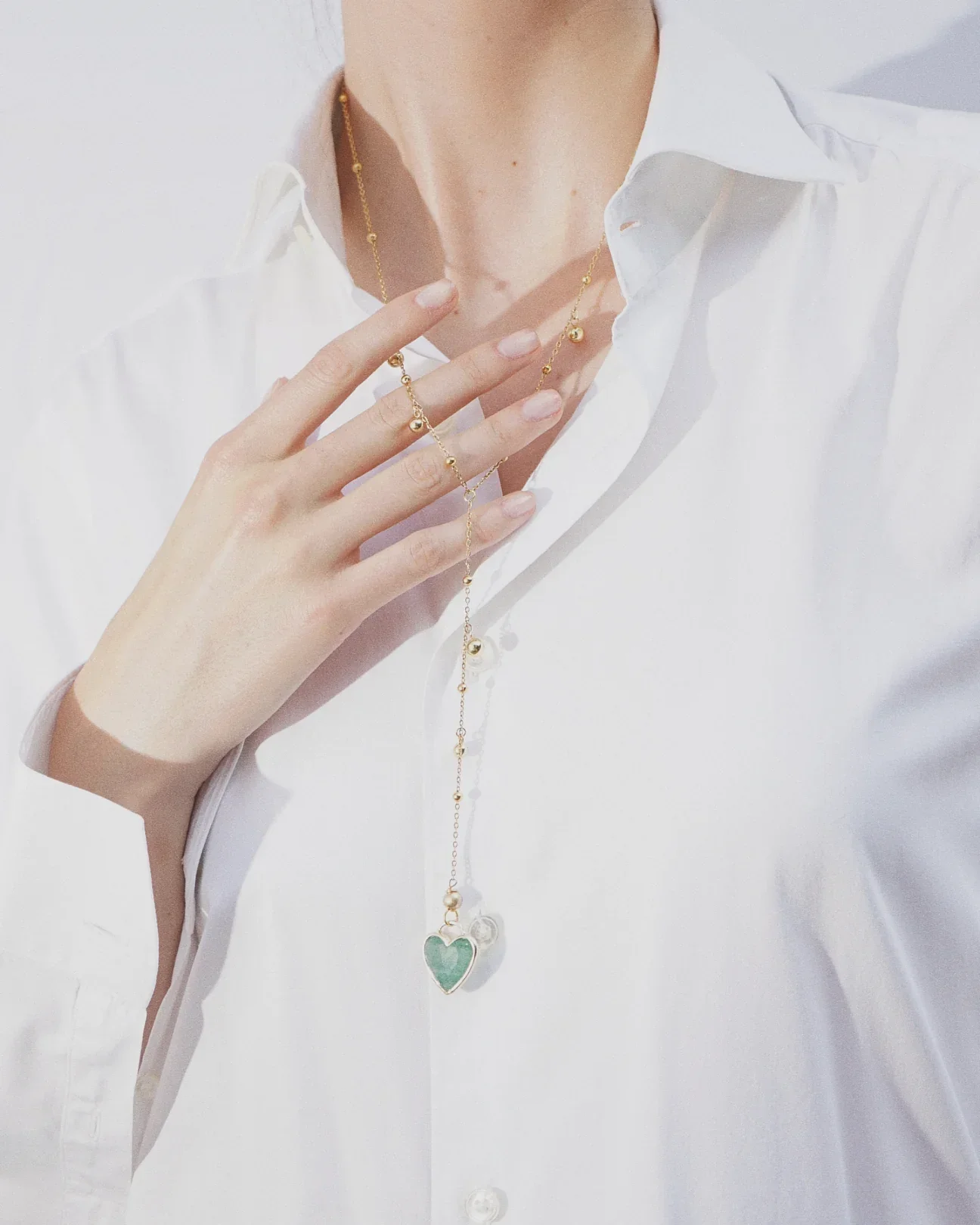 La Collana Cuore ALMALA, è una collana sottile in metallo dorato, composta da piccole perline e arricchita da un pendente a cuore in pietra colorata.
